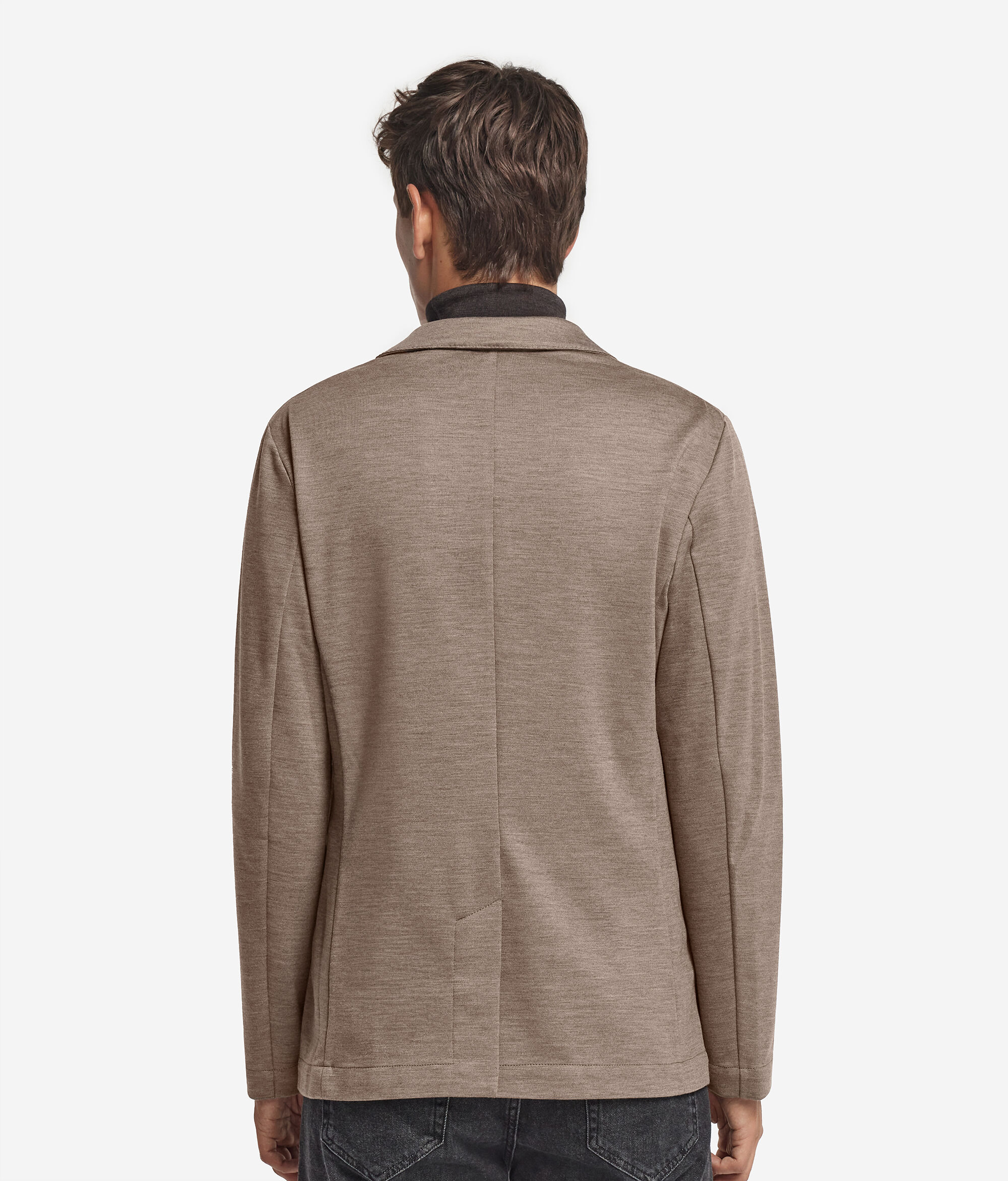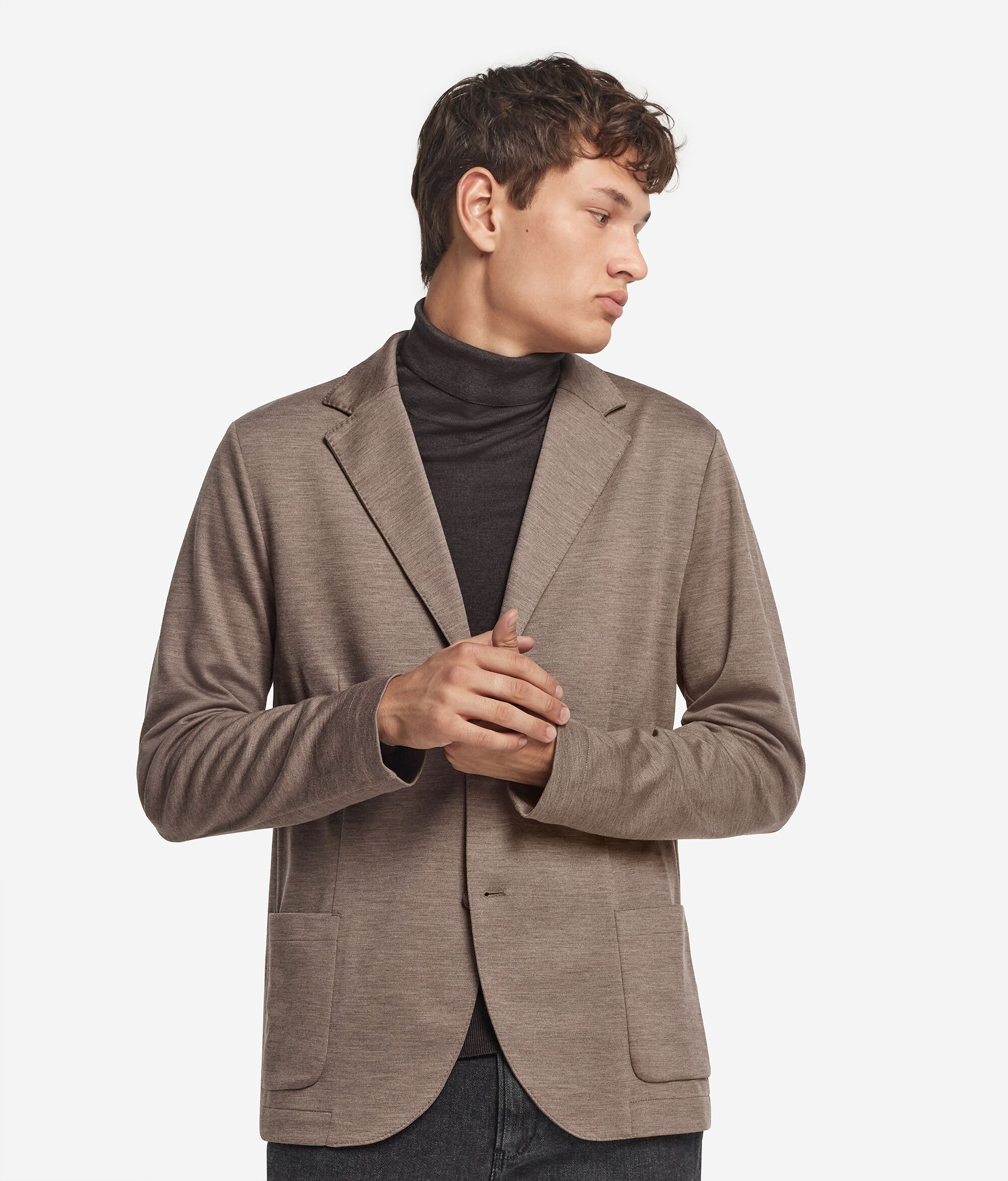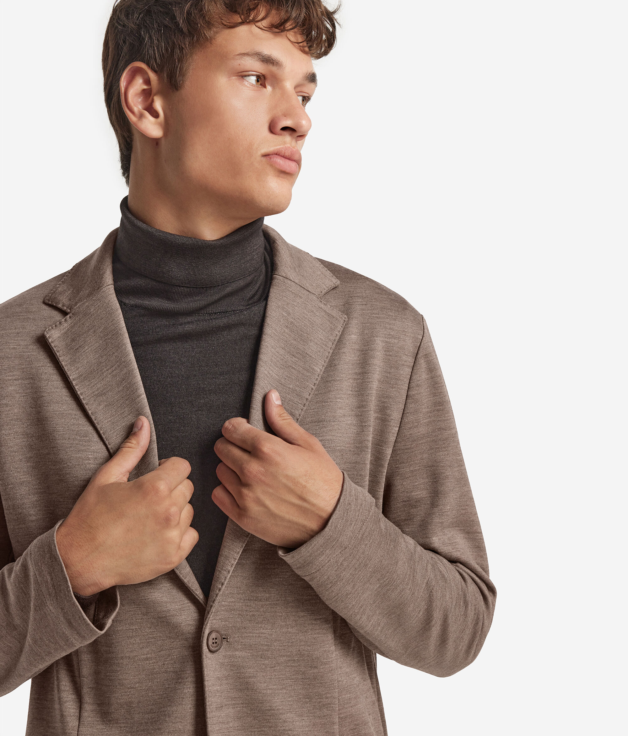 La morbidezza della lana si unisce all'elasticità del jersey in questa giacca dallo stile intramontabile. Il rever con impuntura e l’abbottonatura centrale aggiungono un tocco sartoriale, mentre lo spacco sul retro accompagna i movimenti con naturalezza. All’interno, il taschino a filetto sul petto sinistro completa il design con discrezione e funzionalità, firmando un capo essenziale e curato in ogni dettaglio.