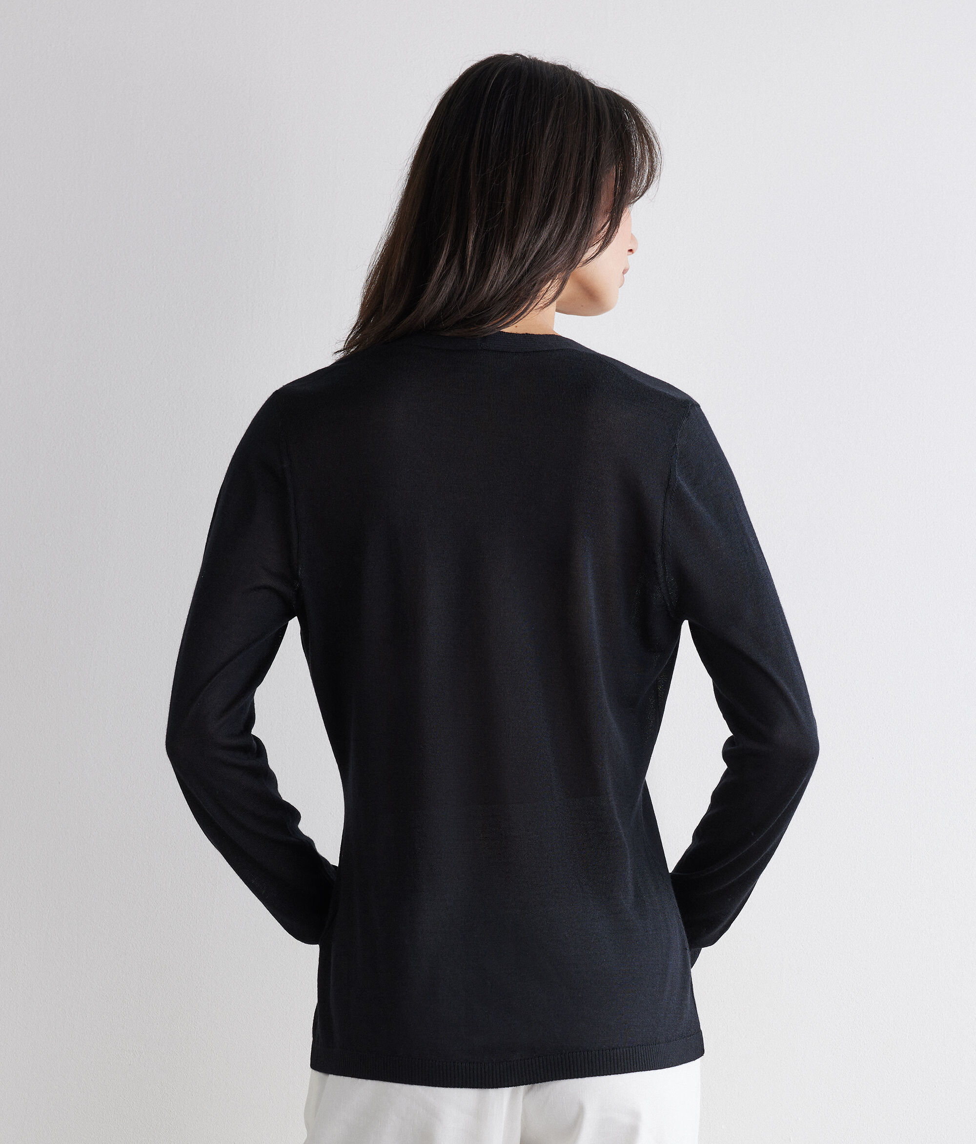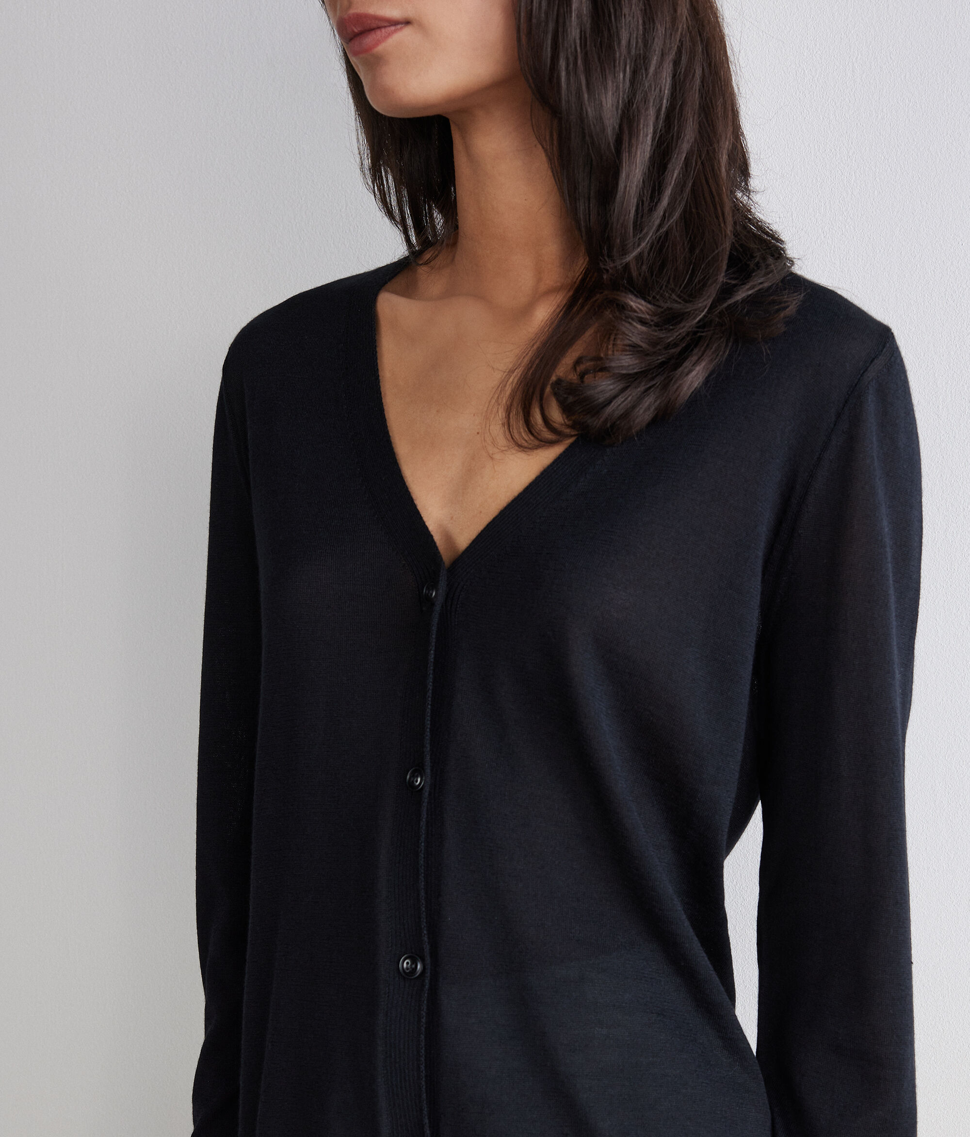 La morbidezza del cashmere incontra la luminosità della seta in questo golfino dal fascino senza tempo. Perfetto per il layering, presenta scollo a V, abbottonatura frontale e finiture a coste, mentre la vestibilità regolare garantisce comfort e armonia nella silhouette.