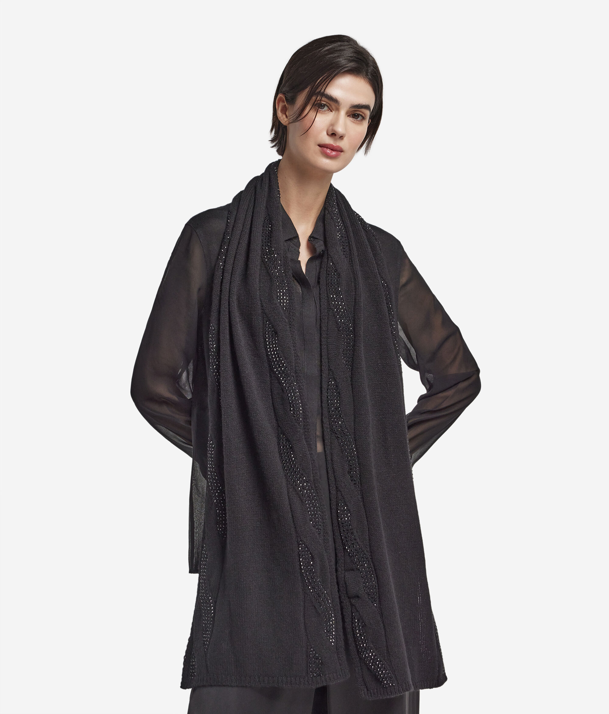 Gusto raffinato e dettagli di pregio caratterizzano questa sciarpa in morbido Cashmere Ultrasoft. Le trecce verticali disegnano sui fianchi una ricca texture, mentre gli strass incastonati catturano i riflessi con delicatezza. La finitura a coste sui bordi conferisce struttura e definizione, rendendolo un accessorio ideale per impreziosire look semplici ma raffinati.