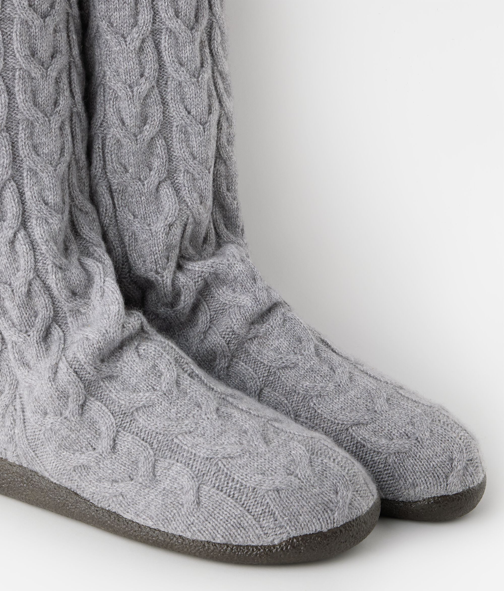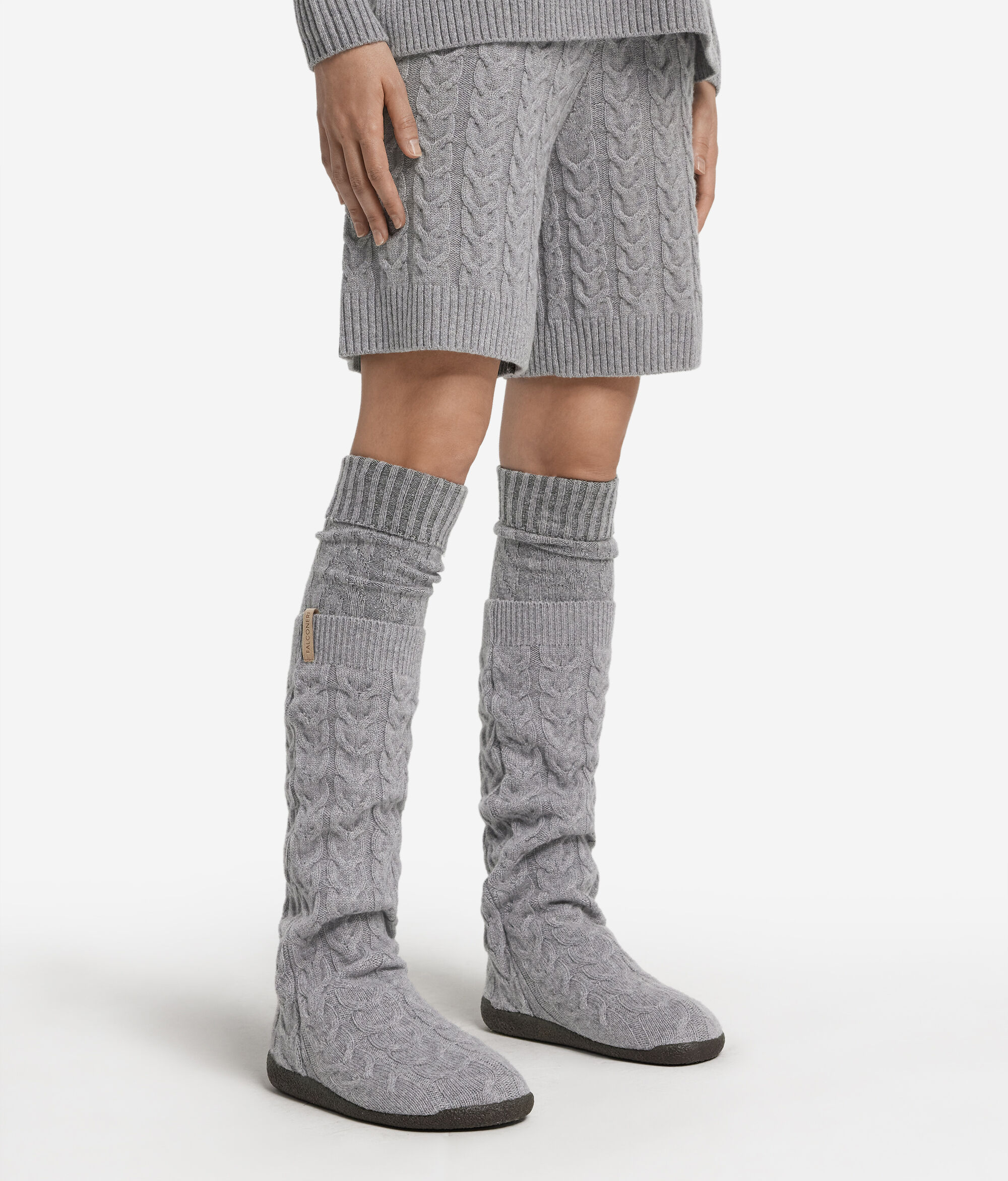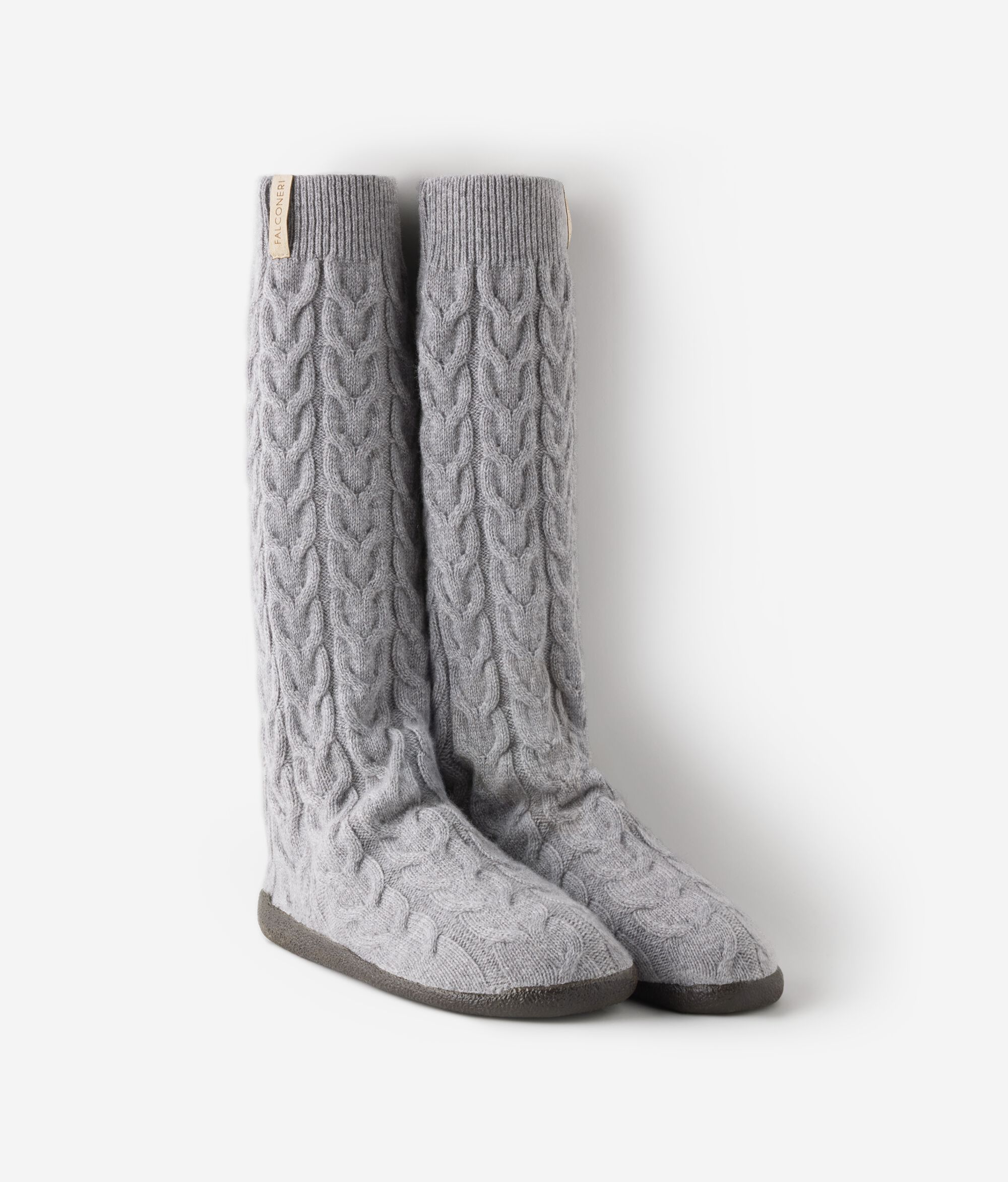 Realizzato in Cashmere Ultrasoft, questo stivale reinterpreta la morbidezza del cashmere anche come accessorio. La lavorazione a trecce verticali e la finitura a coste aggiungono texture e definizione, creando un gioco di volumi sofisticato e contemporaneo. L'altezza sotto il ginocchio e la suola in gomma a tono, accompagnano ogni passo con eleganza, trasformando anche il look più semplice in un gesto di stile raffinato.