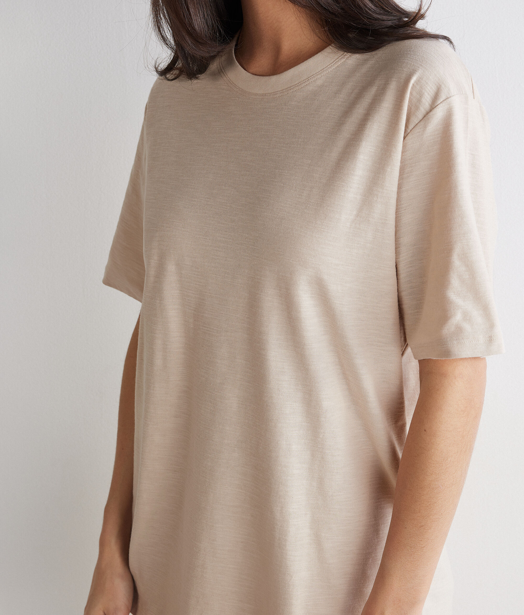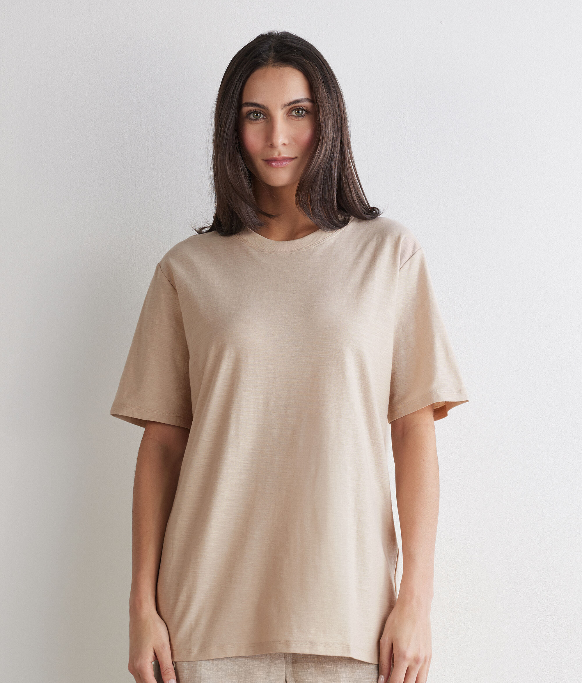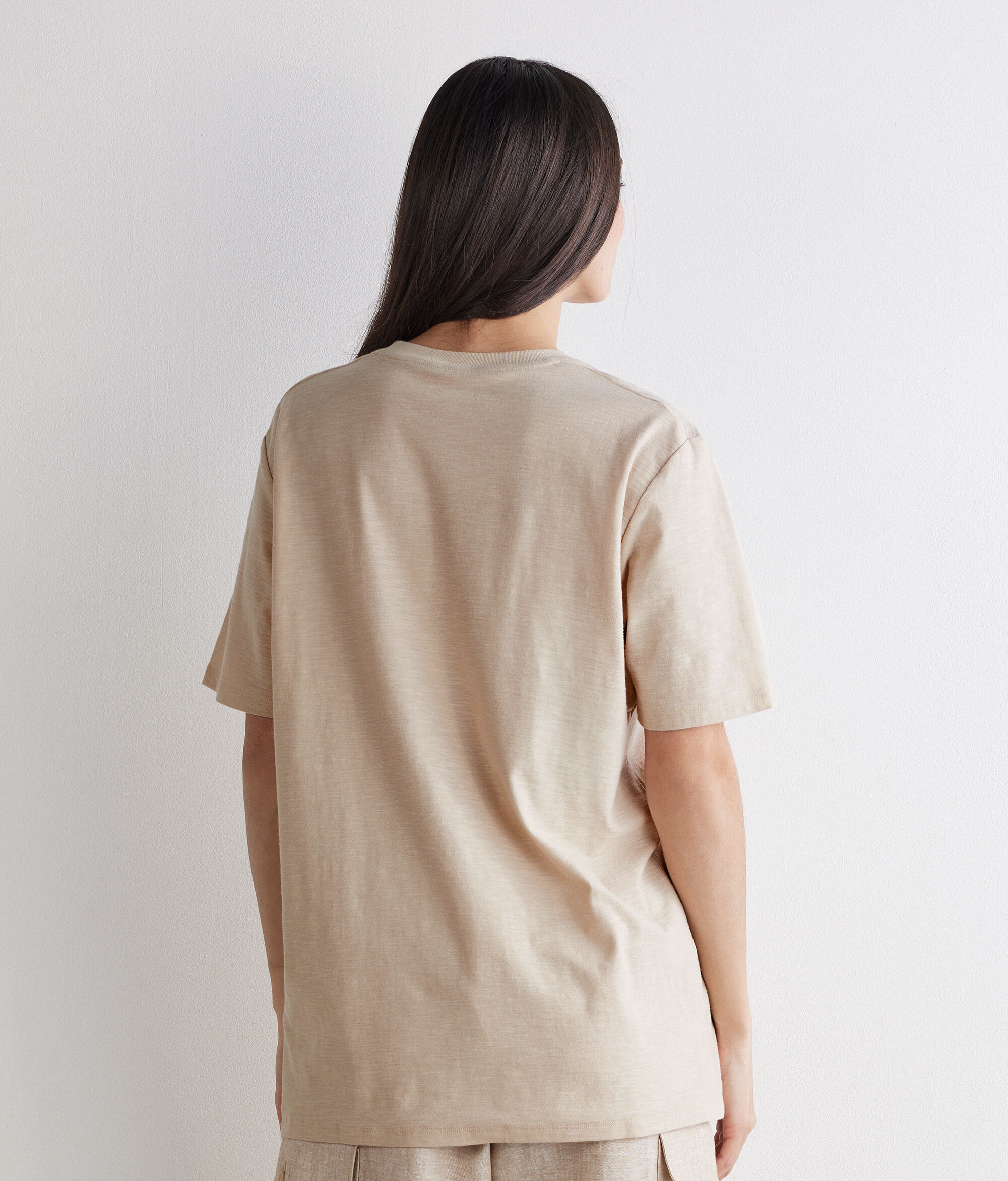 Le qualità del filato naturale conferiscono una texture liscia e confortevole a questa t-shirt realizzata interamente in cotone. La vestibilità relax e la lunghezza perfetta al fianco ne esaltano il gusto contemporaneo rendendolo ideale per completare look casual con semplicità e stile.