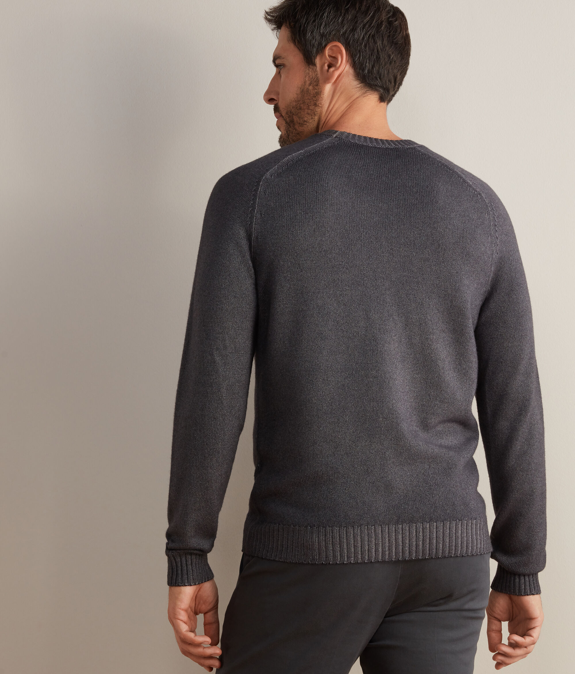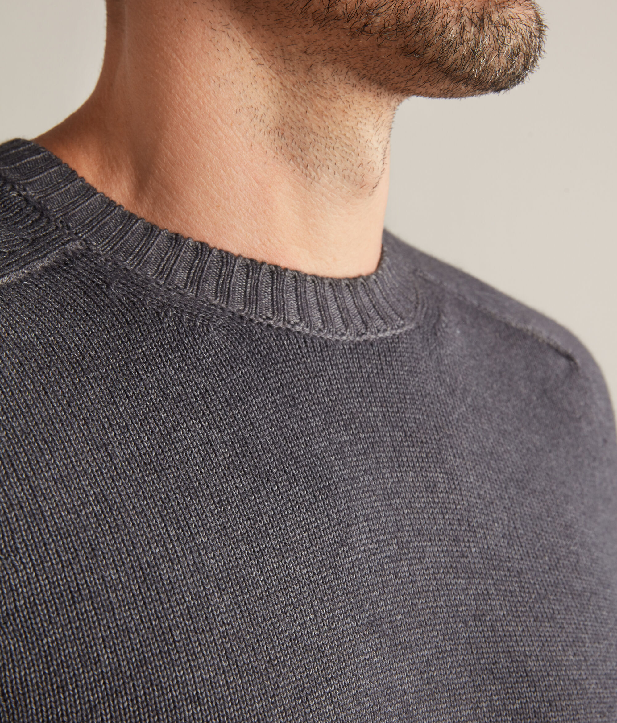 装いにカジュアルな優雅さを添えるアイテムとして男性のワードローブに欠かせない、ウルトラソフトカシミヤのクルーネックセーター。特殊なオールドダイによるマーブル調の色合いが特徴です。