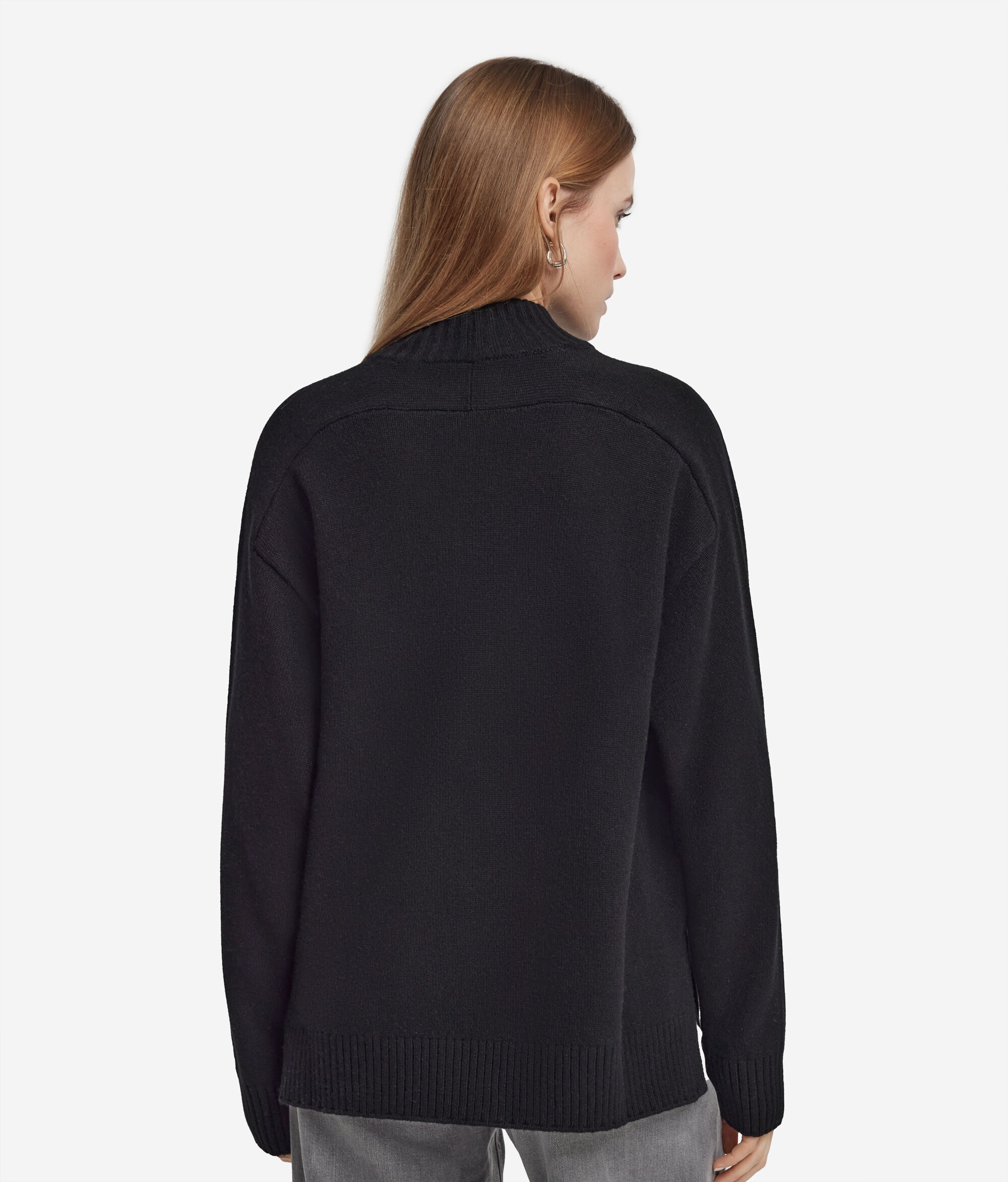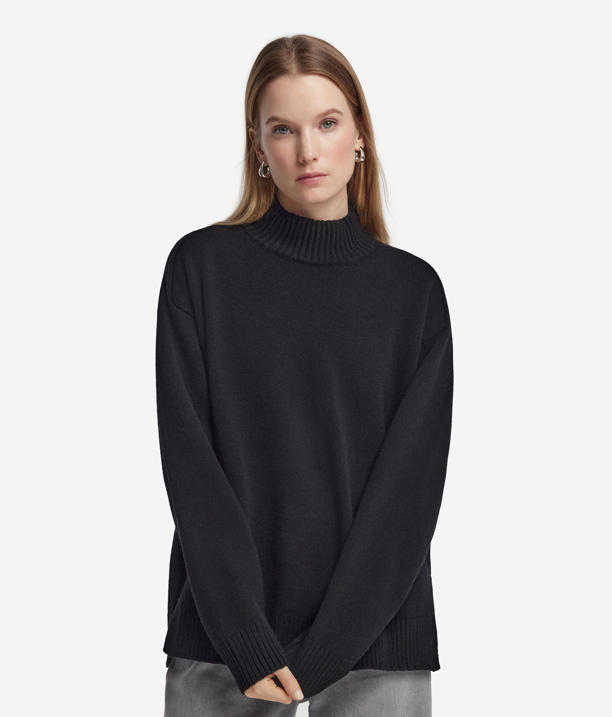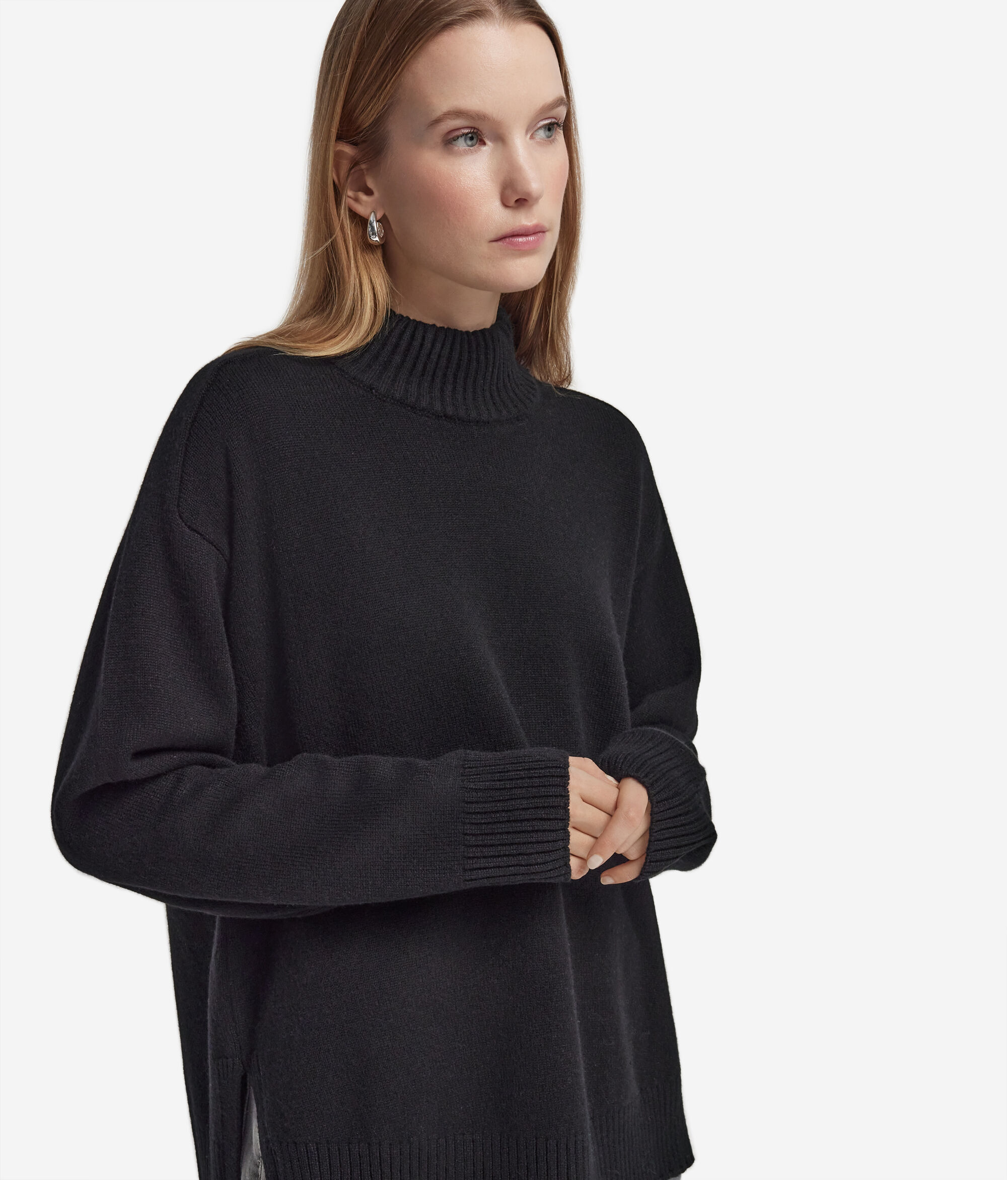 高級ヤーンとフェミニンなディテールが調和の中で融合した、ウルトラソフトカシミヤ製タートルネックセーター。サドルラグランショルダーでゆったりとした着心地を強調し、インフォーマルでありながら優雅なタッチをプラスするリブ編みのトリミングで仕上げています。