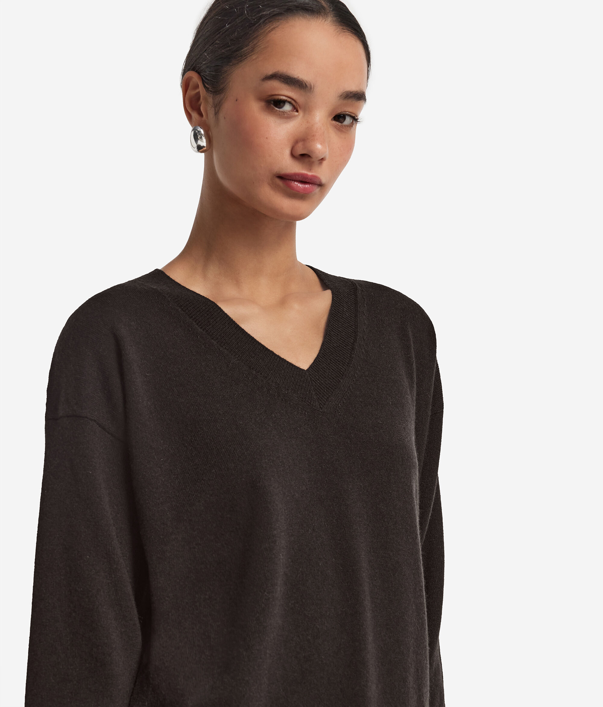 やわらかいウルトラソフトカシミヤで作られた、Vネックのセーター。寒い日々のワードローブのキーアイテムとなる一点です。 裾、袖口とネックラインはリブ編みで仕上げ、洗練されたタッチをプラスしています。ドロップショルダーと柔らかなフィット感でナチュラルでリラックスした着心地に仕上げた、現代的なスタイルにマッチするアイテムです。