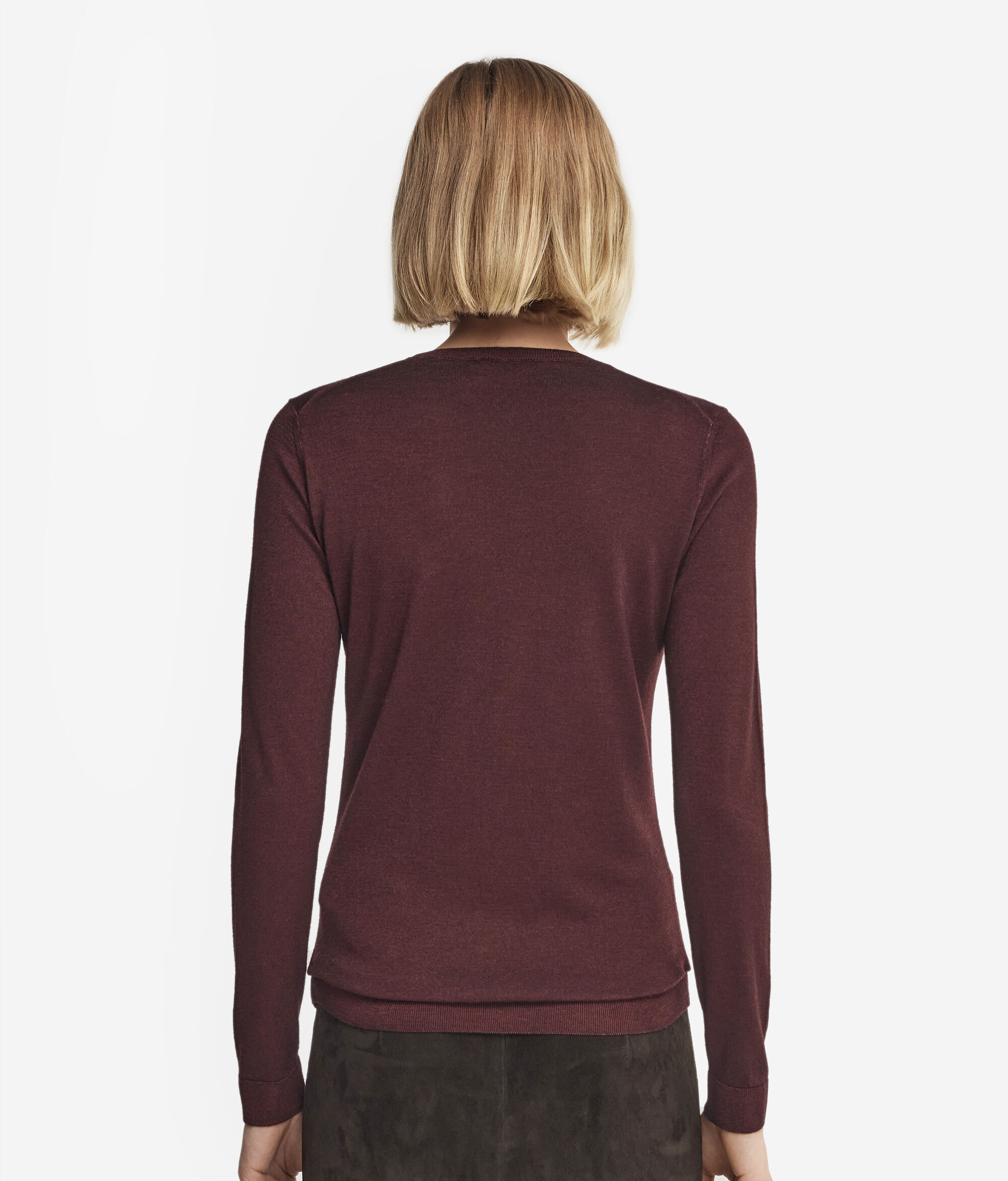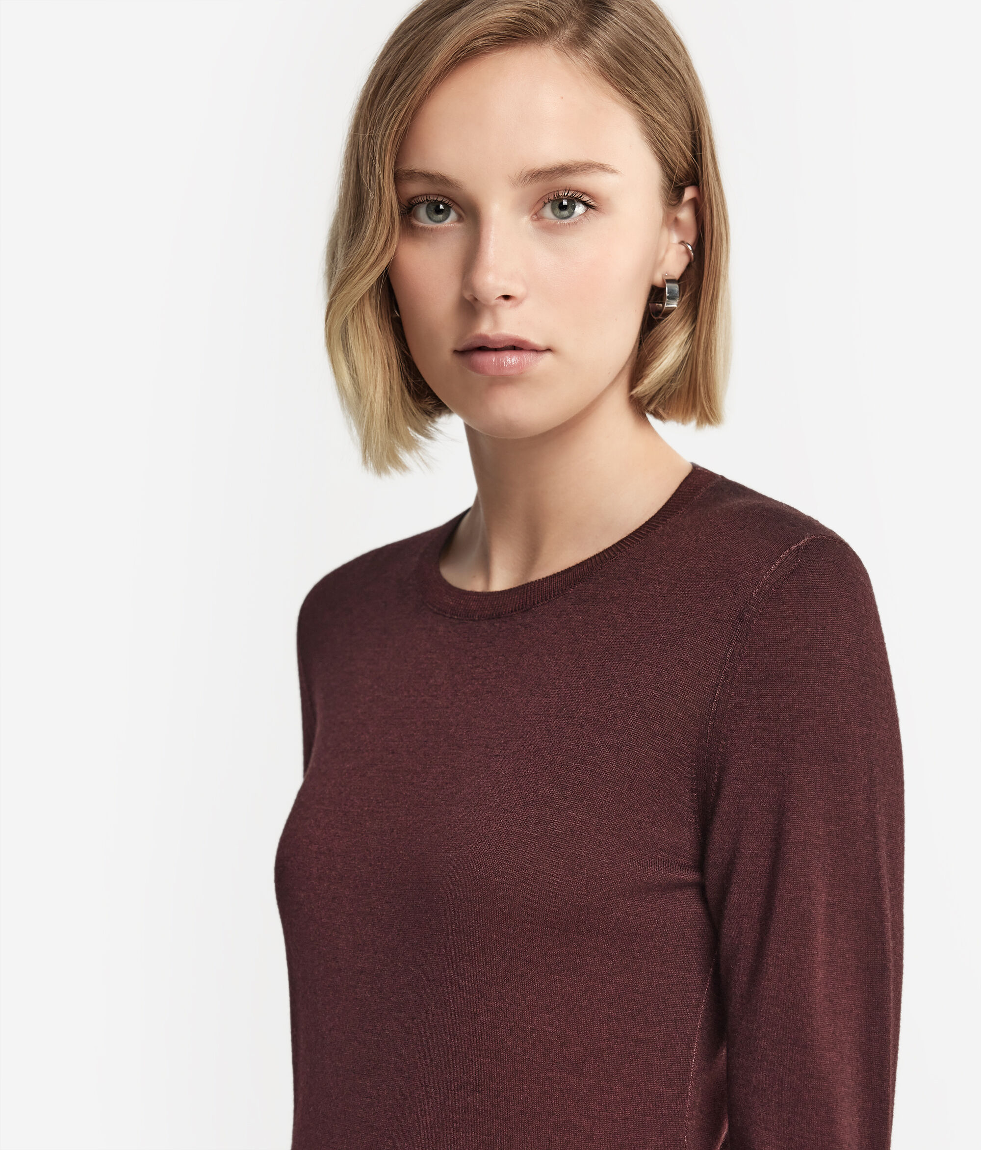 ややスリムなラインでジャケットのインナーとしても着やすく、汎用性の高い一枚です。シンプルでありながら、素材の上質さが際立ちます。