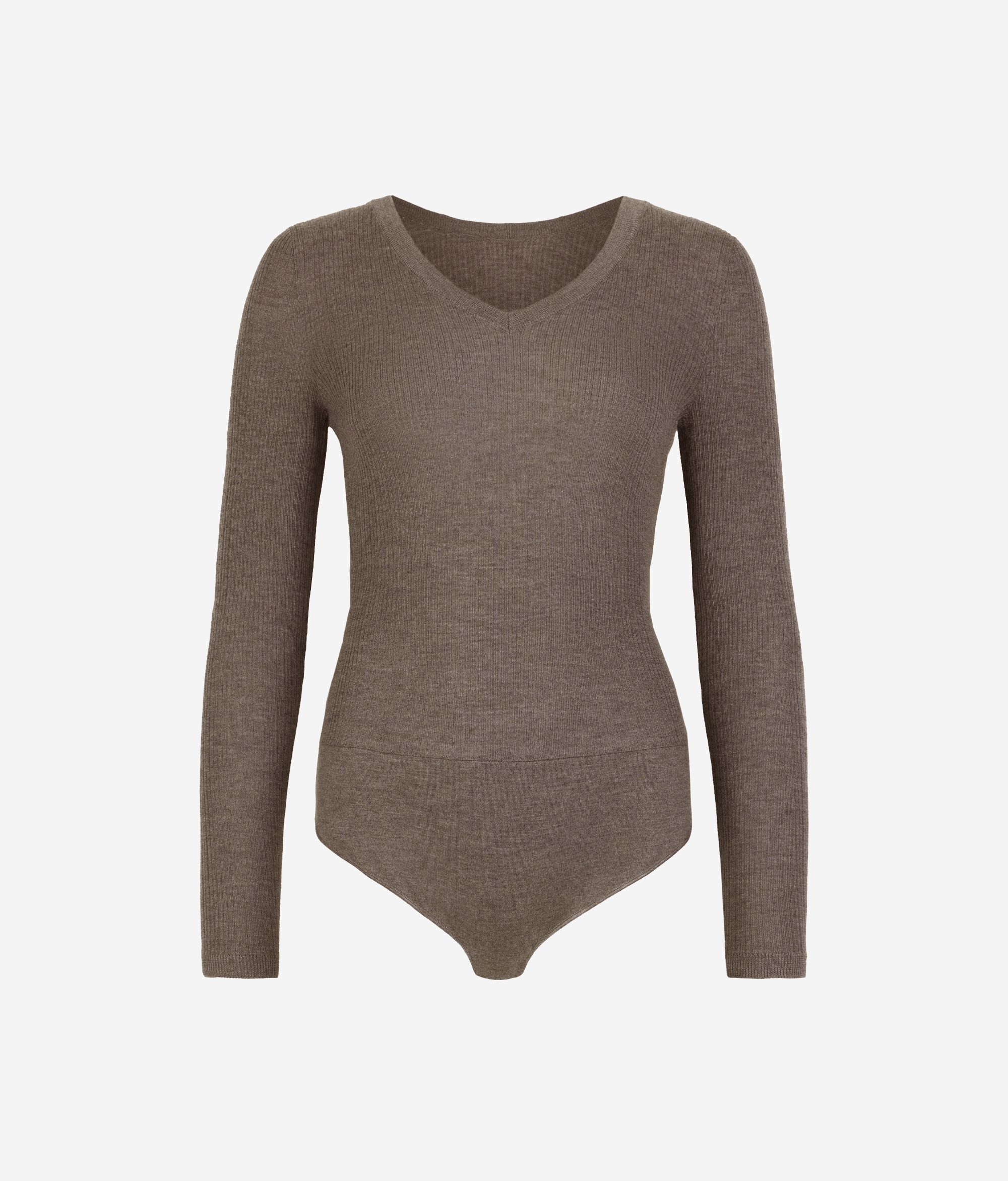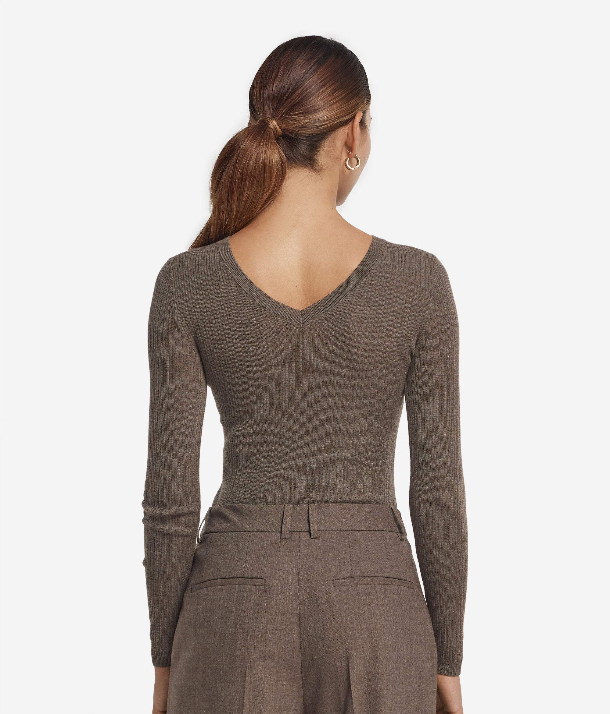 貴重なウルトラファインカシミヤを使用したリブ編みのボディスーツ。幅広いシーンや着こなしに対応する、洗練された印象の一枚です。片側の襟がVネック、反対側がクルーネックになっており、シーンに応じて好きな方を前にして着られるリバーシブルのモデル。どちらのスタイリングでも、さりげないエレガンスが漂う装いを演出します。肩のラインはレギュラーで、全体的に調和のとれたシルエット。足ぐりの開きはスタンダード。スリムにフィットし、ボディラインを美しく引き立たせます。