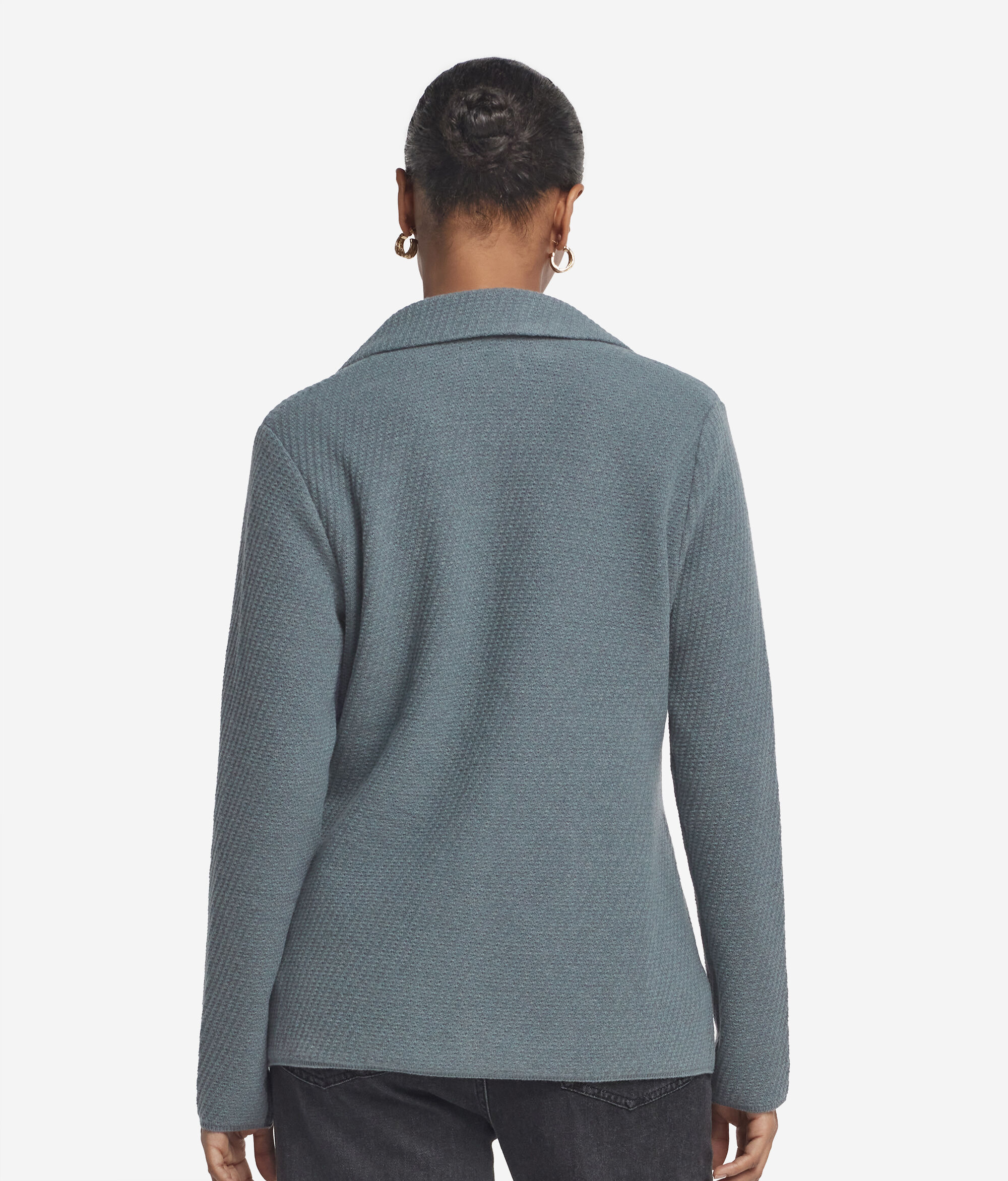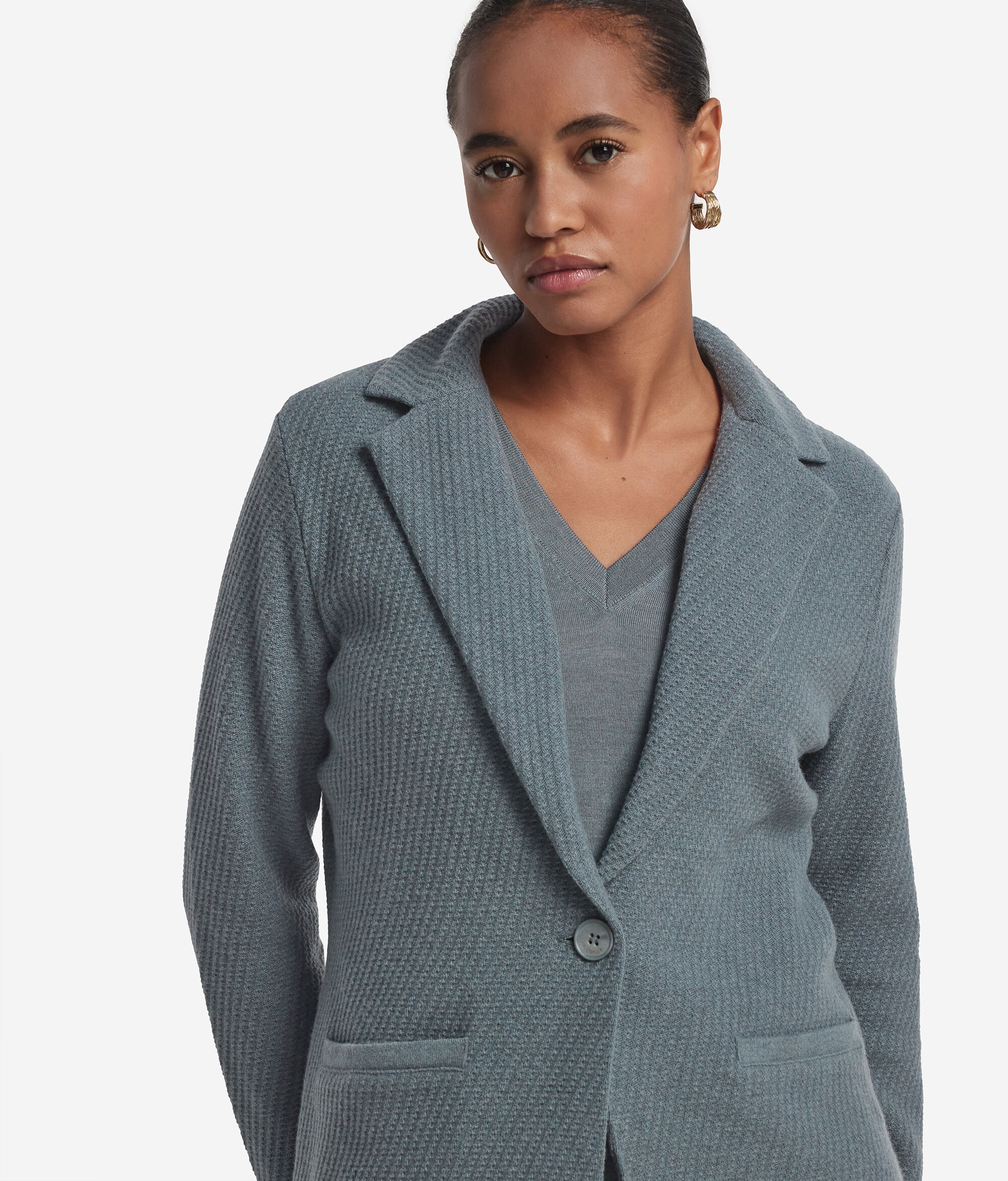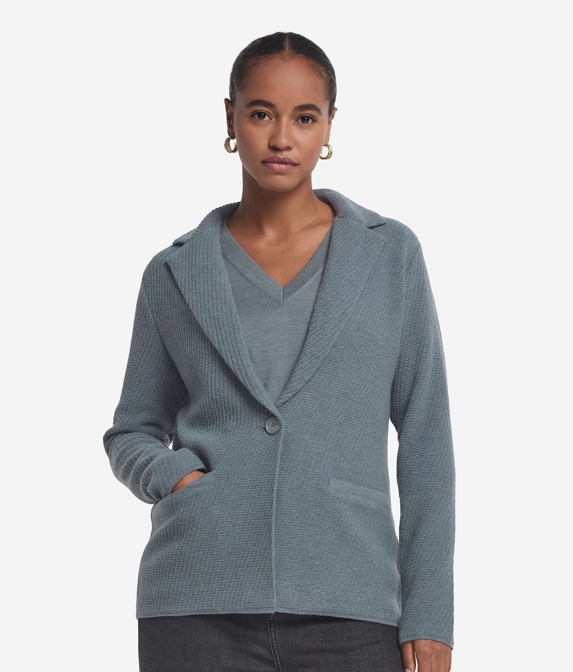 ウールとウルトラソフトカシミヤで作られたジャケット。リラックスした優雅さと上質な糸の洗練さが融合したアイテムです。繊細な編地が際立つモノクロームデザインは、柔らかな手触りと現代的な構築感を生み出します。クラシックなラペルと1つボタン留めのシングルブレスト開閉部がテーラードスタイルの美的感覚を思わせ、ドロップショルダーとレギュラーフィットでバランスのとれた活躍の場を選ばないシルエットを演出しました。