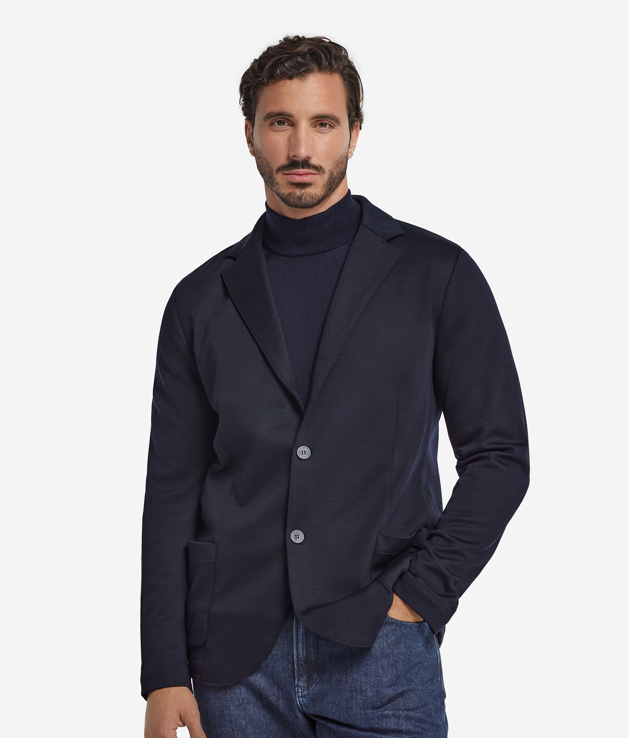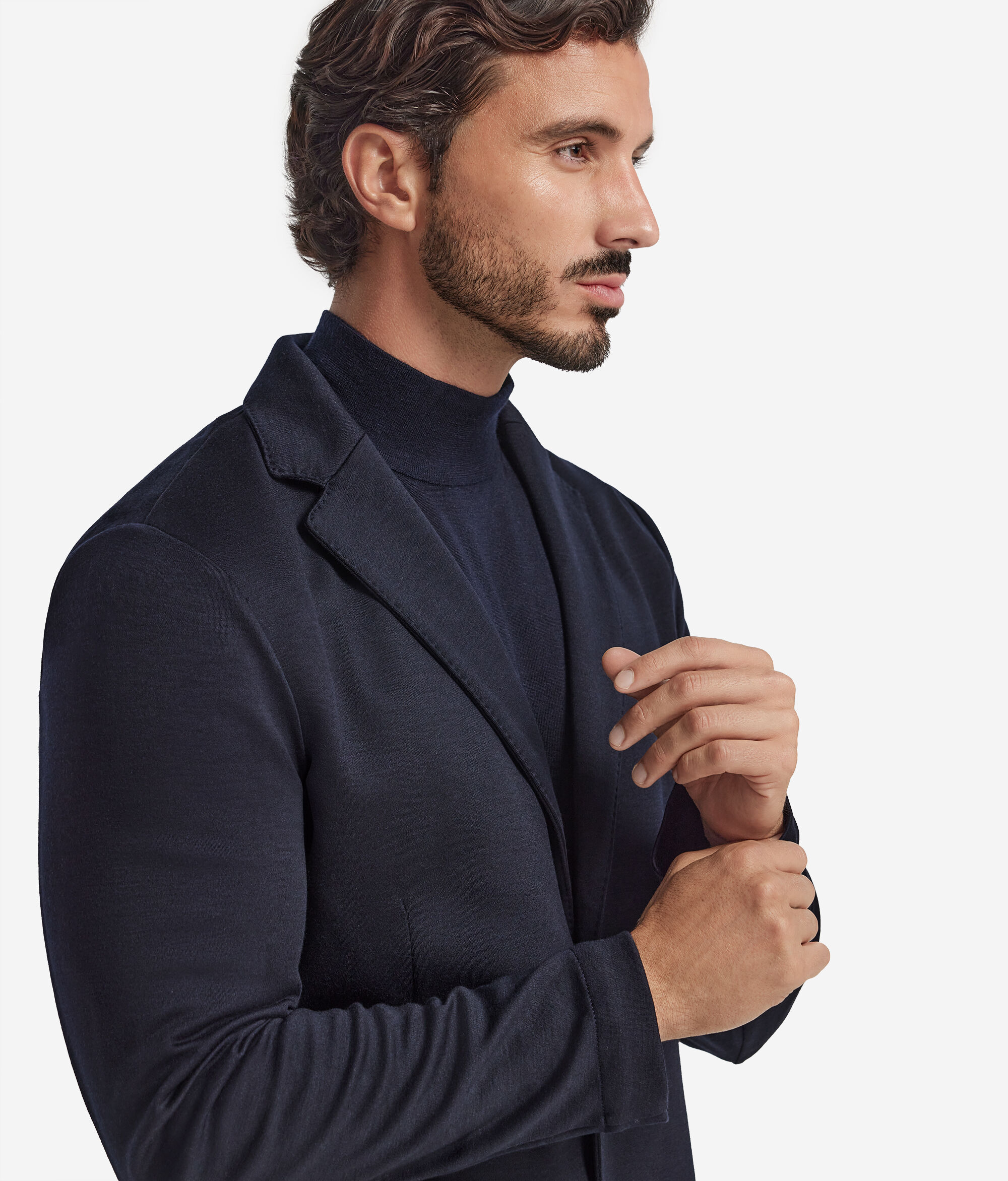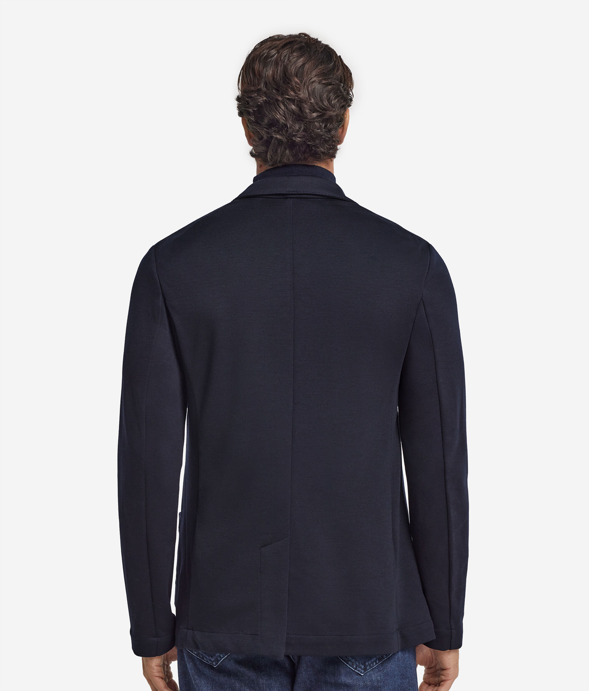 ウールの柔らかさとジャージーの伸縮性がひとつになった、タイムレスなスタイリッシュさが特徴のジャケット。トップステッチ入りのラペルと中央のボタン開閉部がテーラード感をプラスし、バックスリットが動きに自然にフィットします。左胸の内側にはウェルトポケットを設けて控えめで機能的なデザインを完成させ、細部にまでこだわった本質をおさえたアイテムを作り出しました。
