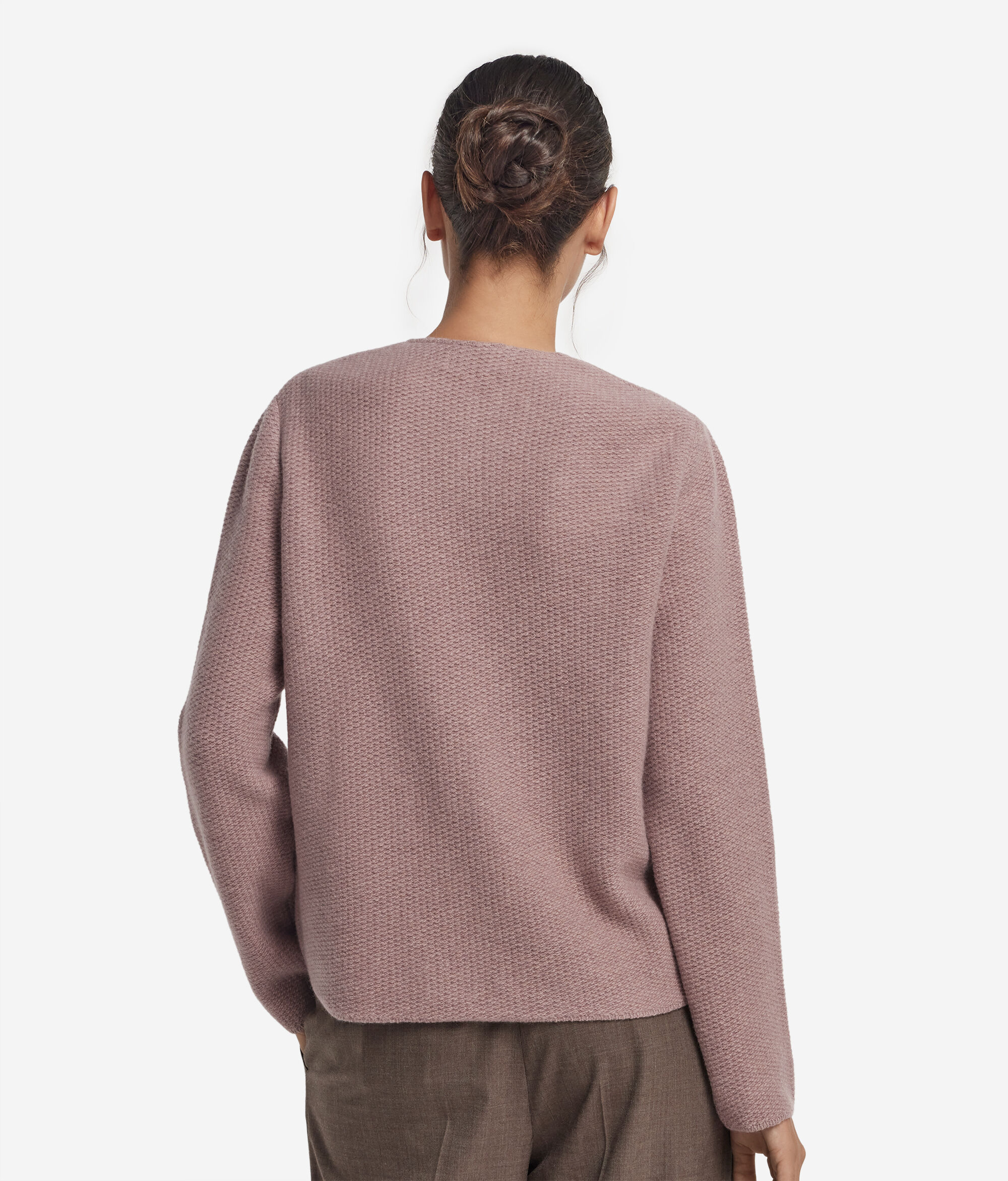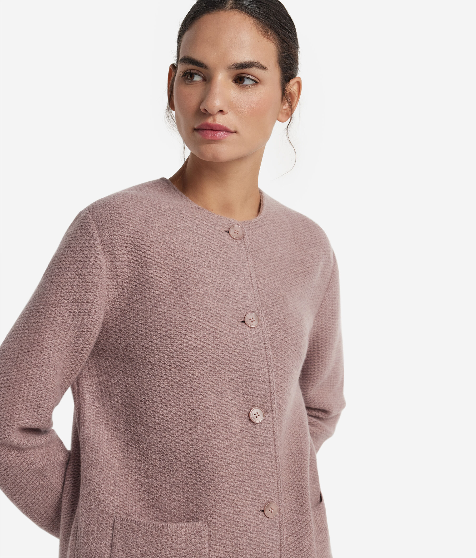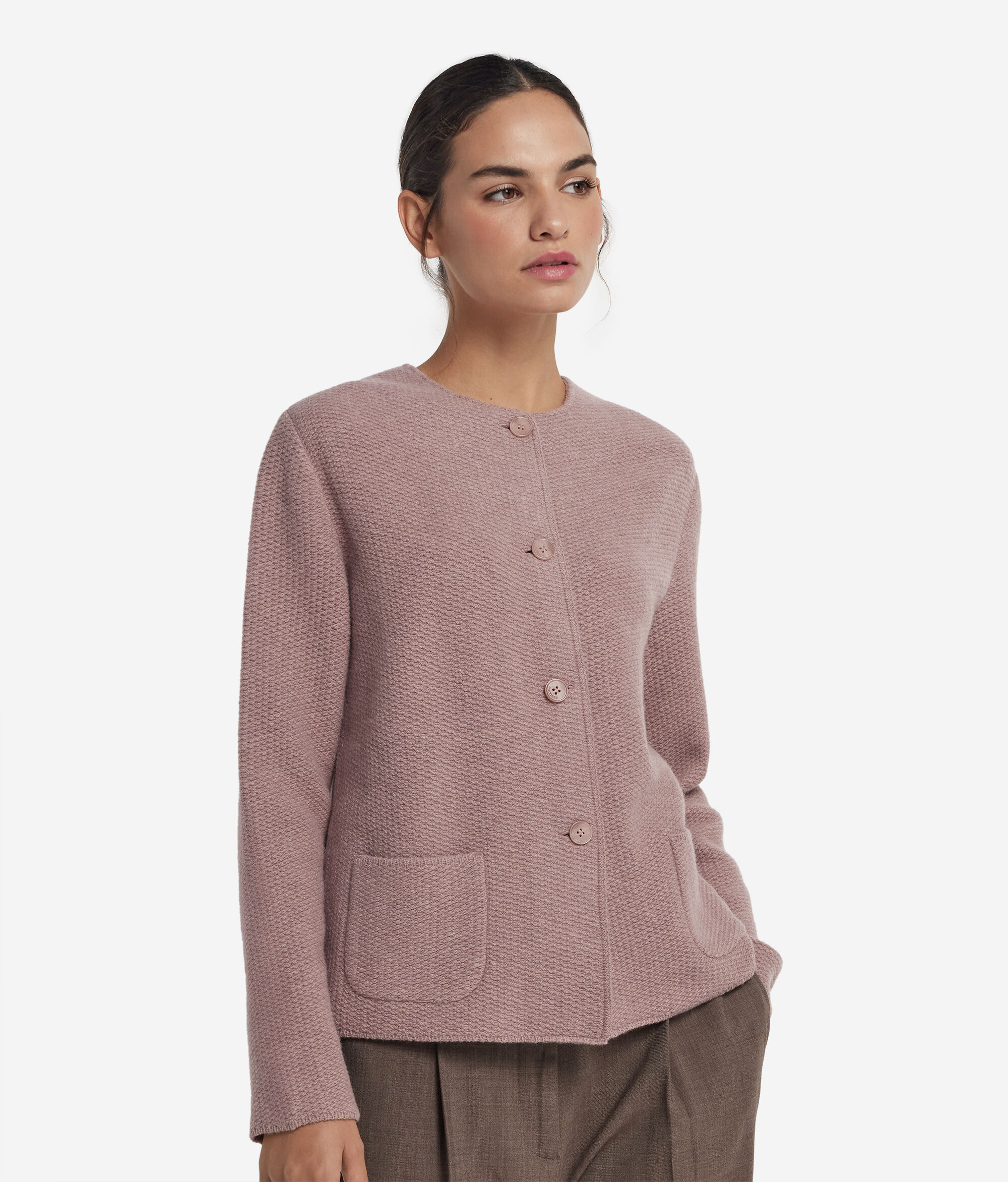 ウールとウルトラソフトカシミヤの混紡ニット生地で作られたジャケット。柔らかさと洗練性がひとつになったアイテムです。シンプルなクルーネックとフロントボタン留めが、活躍の場を選ばないすっきりとしたルックを演出します。フロントのパッチポケットで実用性を添え、レギュラーフィットと長袖で心地よくバランスの取れたフィット感をお約束しました。腰上の長さとレギュラーフィットに仕上げた、スタイリッシュさと日常の機能性のバランスを求める方にとって理想的な一点です。