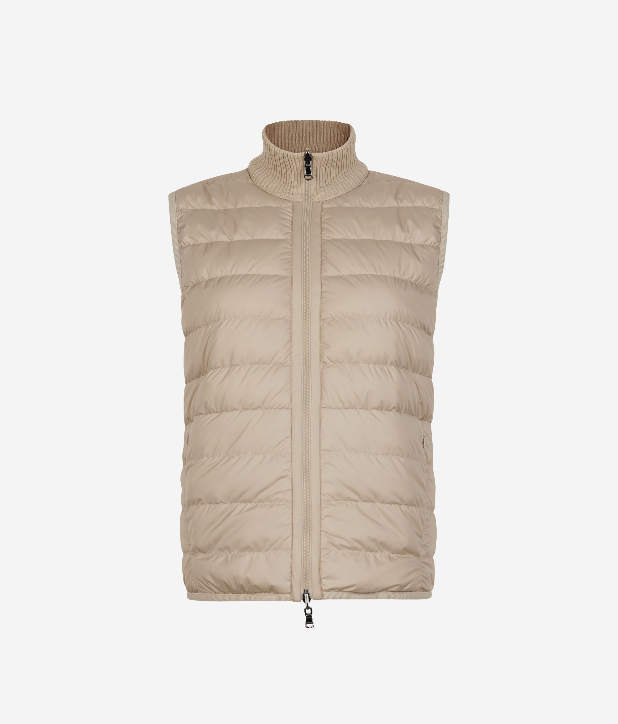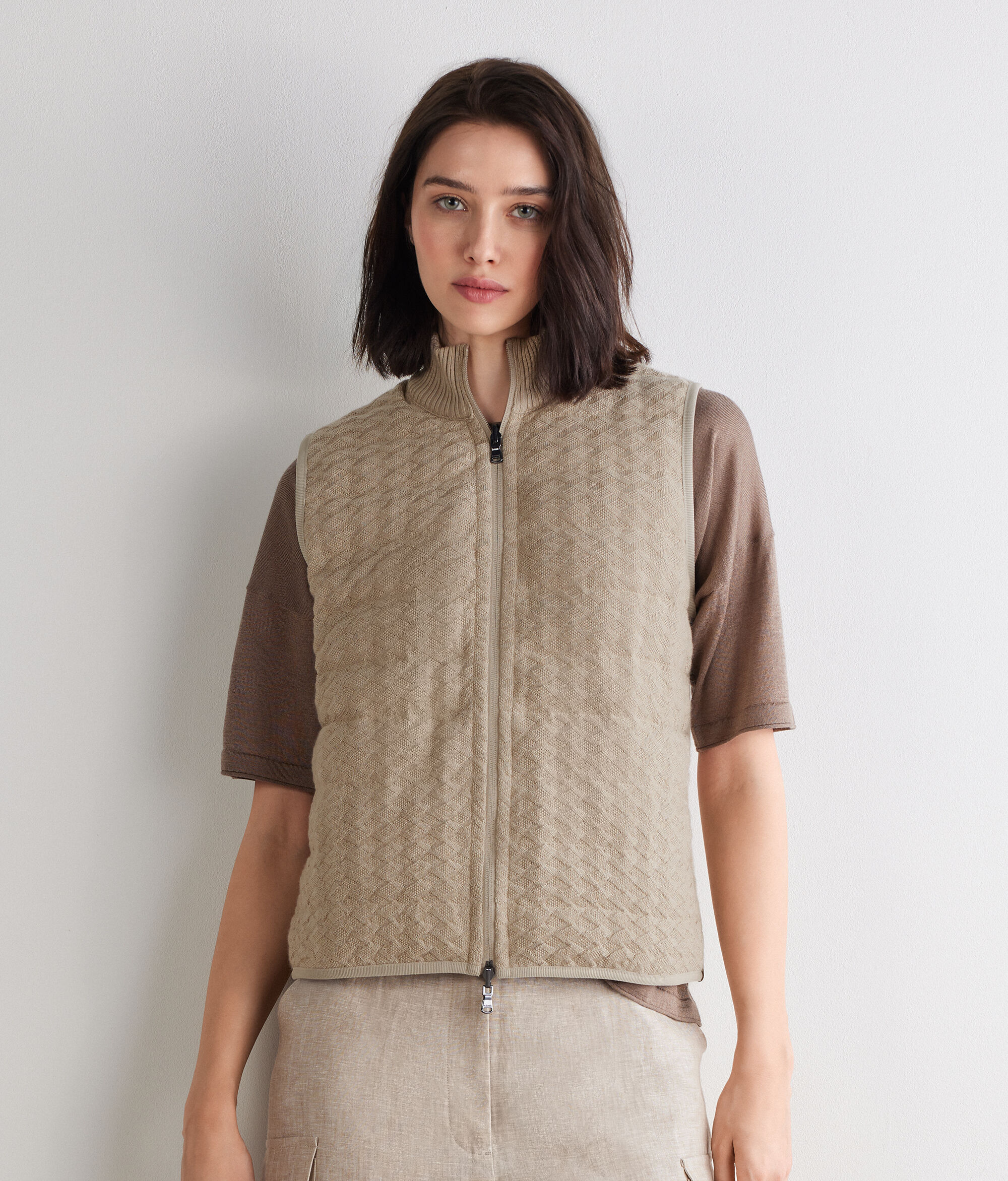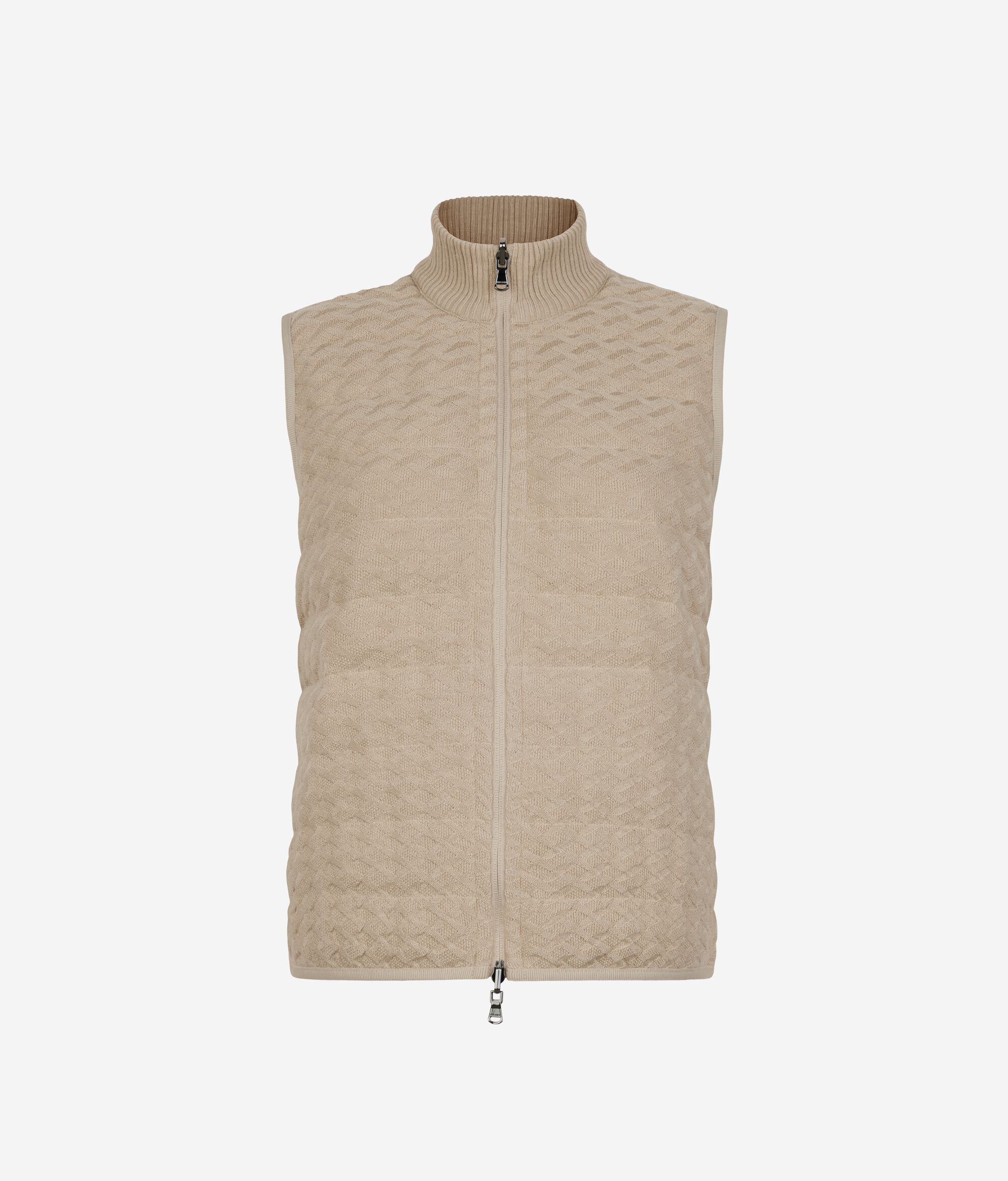 • ハイネックの襟には、ウルトラファインカシミヤのリブ編みのニット地を使用