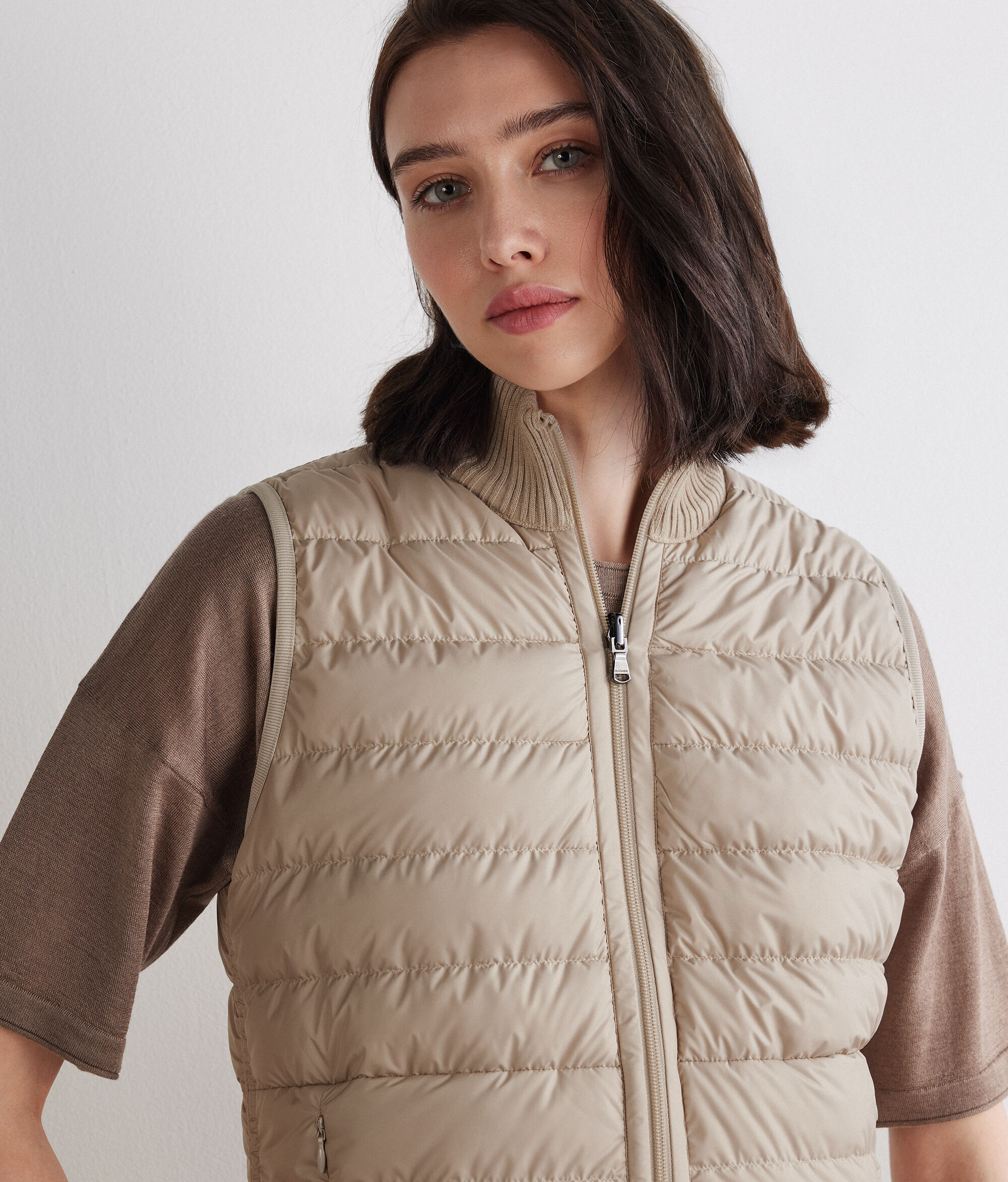 シンプルなデザインが洗練を感じさせるリバーシブル仕様のダウンベスト。片面にはマットなナイロン素材、もう片面には上質なウルトラファインカシミヤを使用したリバーシブルなので、場面に合わせて異なる雰囲気をお楽しみいただけます。スリムフィットのモデルで、ダブルファスナーや、表から見えないように配されたポケットなど細部にもこだわり、巧みな仕立ての技術を感じさせる一枚です。