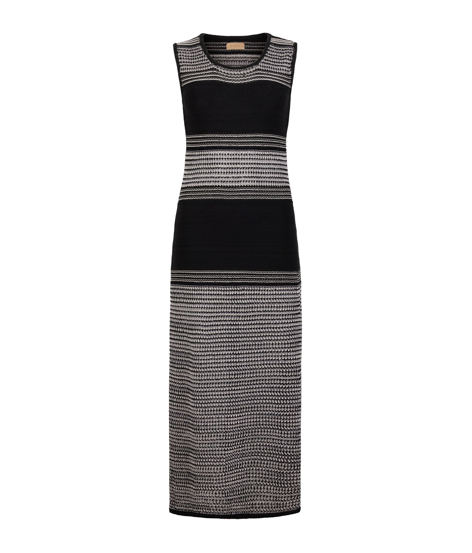コットンとリネンの混紡素材のワンピース。上品な透かし編みが目をひく薄手の生地を使用しています。生地にさり気なく編み込まれたラメ糸が品よく輝きをプラスし、クラス感のあるデザインに仕上げています。シルエットを強調するスリムフィットで、丈はスタイリッシュに旬の魅力を醸し出すようにふくらはぎにかかる長さでカット。特別なシーンにも、ちょっぴりエレガントなルックを演出したい日にもぴったりな一着です。