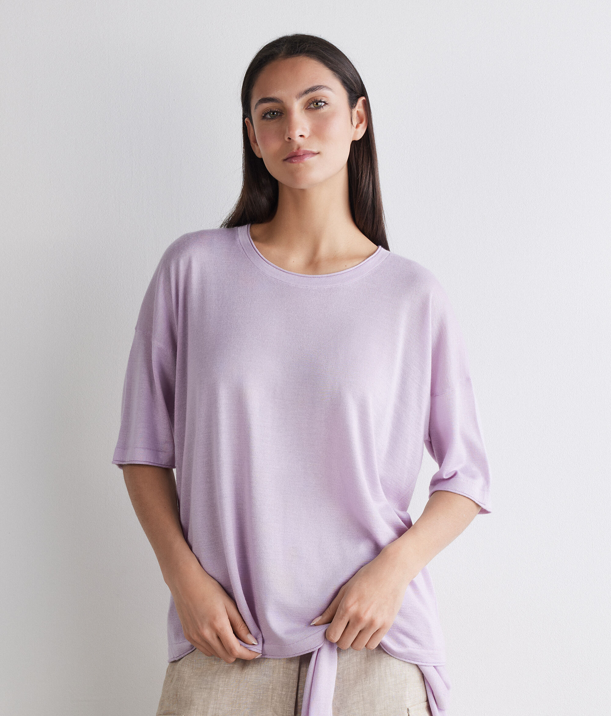 肌触りの良い、上質なカシミヤとシルクの生地で作られたオーバーサイズのTシャツ。ゆったりとしたダウンショルダーのモデルで、全体的に調和のとれたシルエットが現代らしい装いを演出。リブ編みのネックラインと裾はロールヘムで仕上げるなど、細部へのこだわりがさりげなく光る一枚。レギュラー丈で、ゆとりのある着心地です。