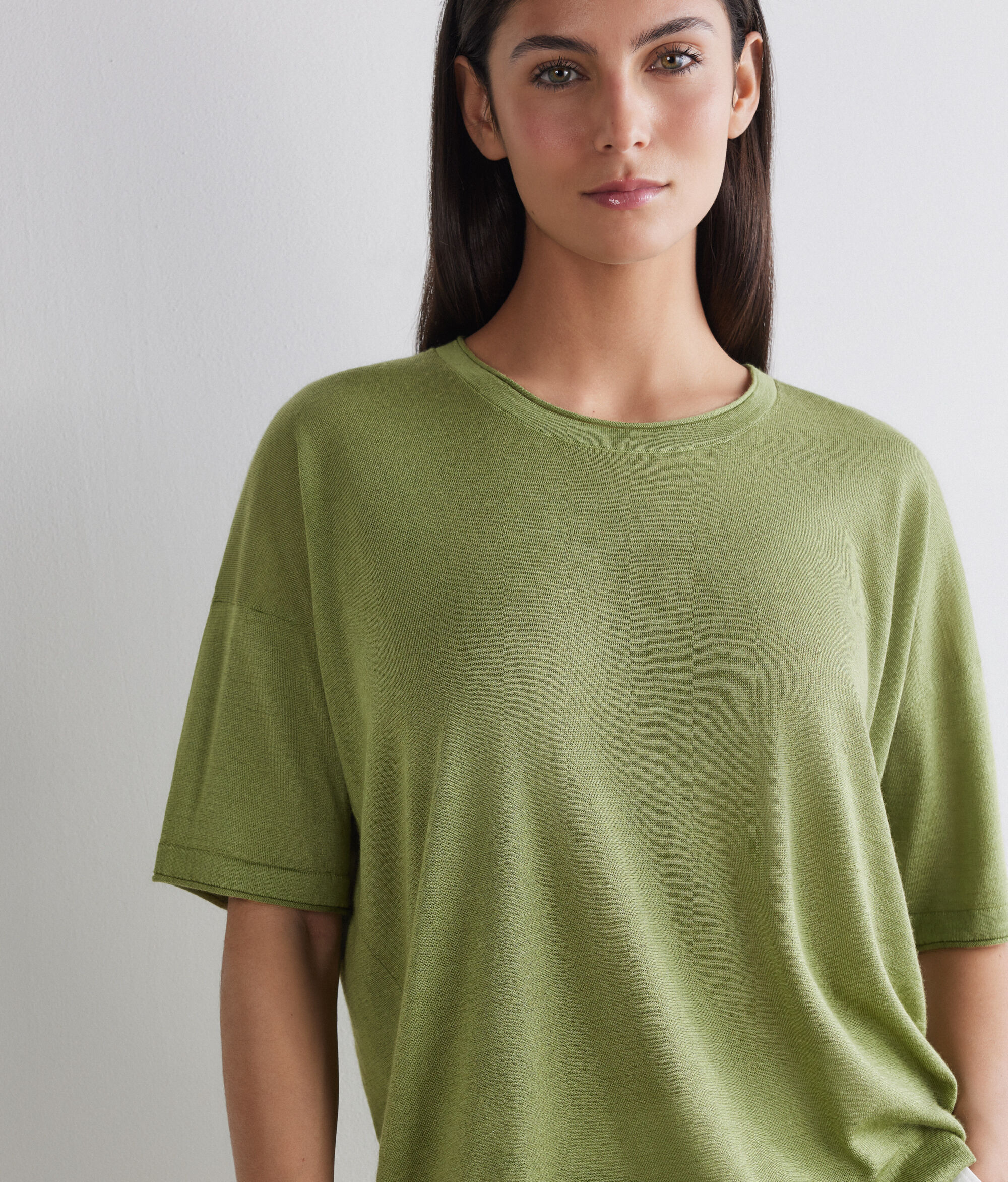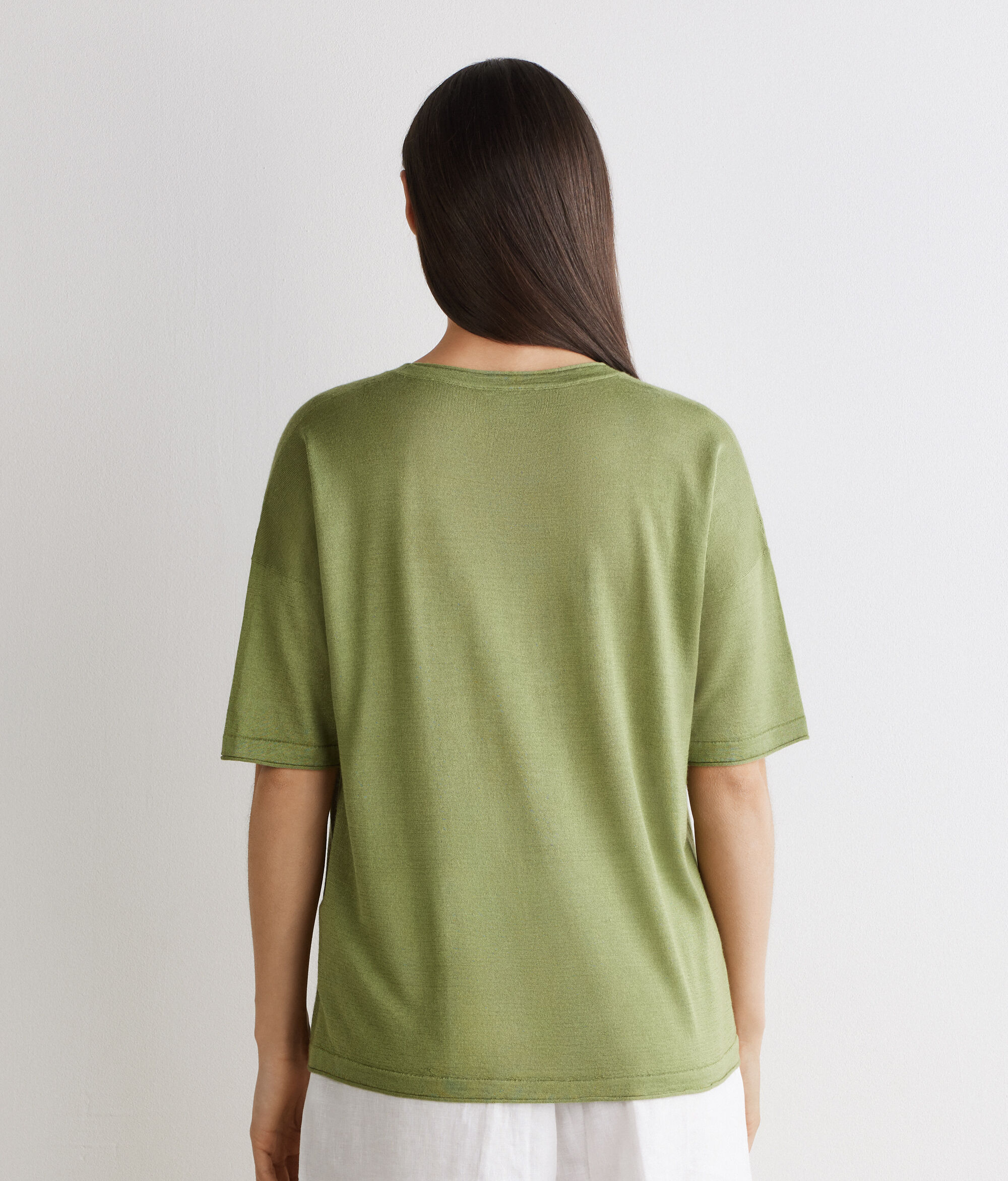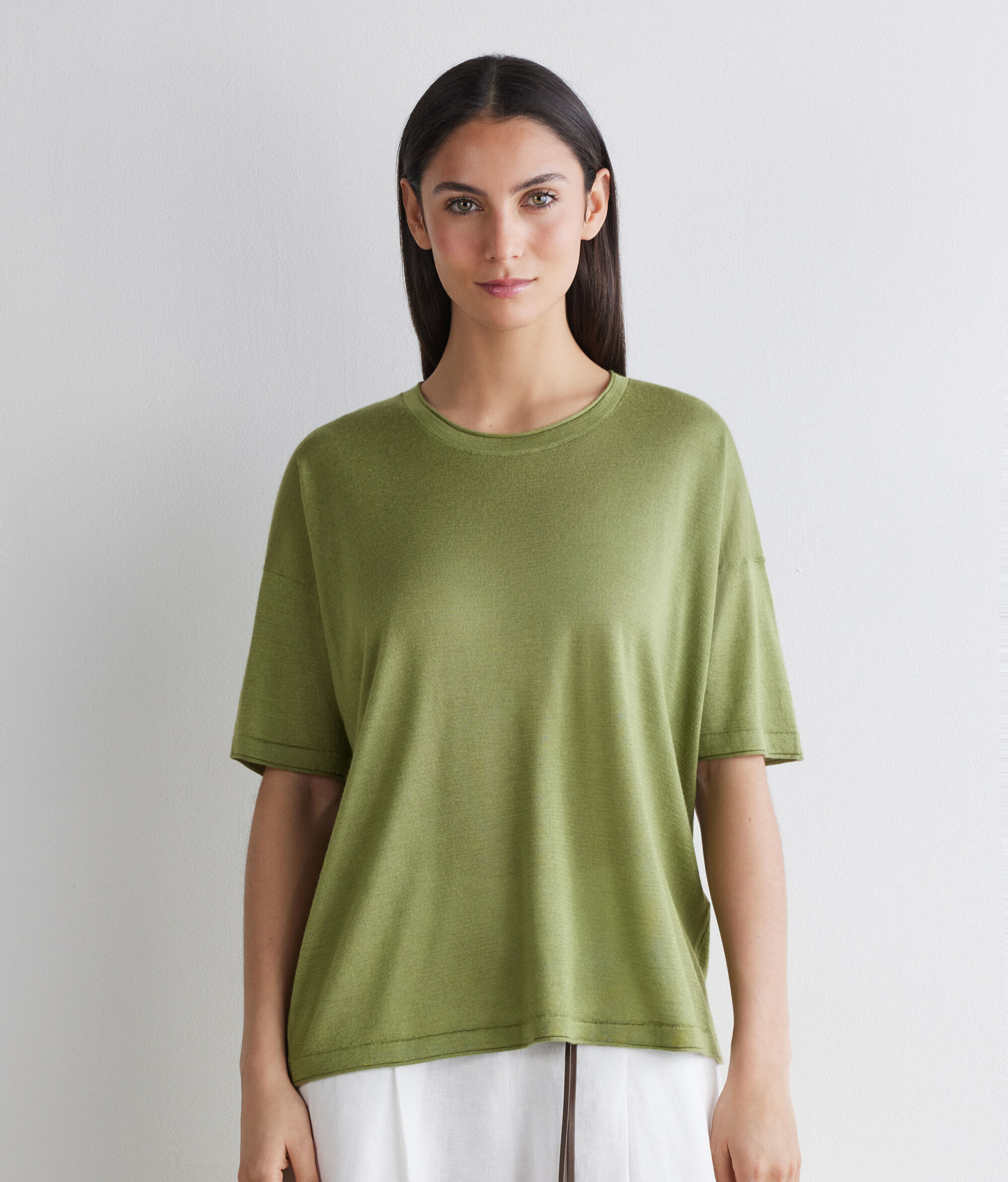 肌触りの良い、上質なカシミヤとシルクの生地で作られたオーバーサイズのTシャツ。ゆったりとしたダウンショルダーのモデルで、全体的に調和のとれたシルエットが現代らしい装いを演出。リブ編みのネックラインと裾はロールヘムで仕上げるなど、細部へのこだわりがさりげなく光る一枚。レギュラー丈で、ゆとりのある着心地です。