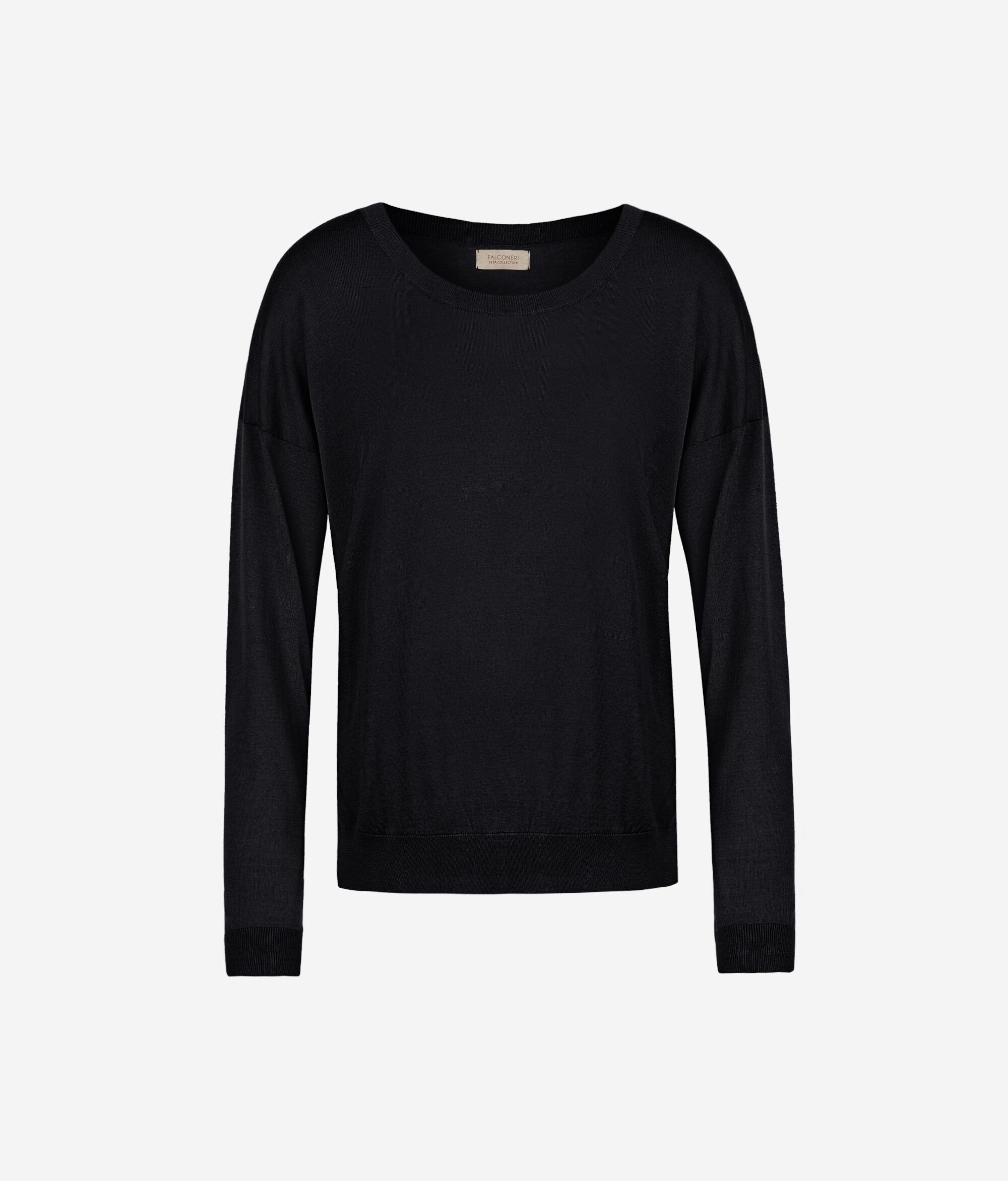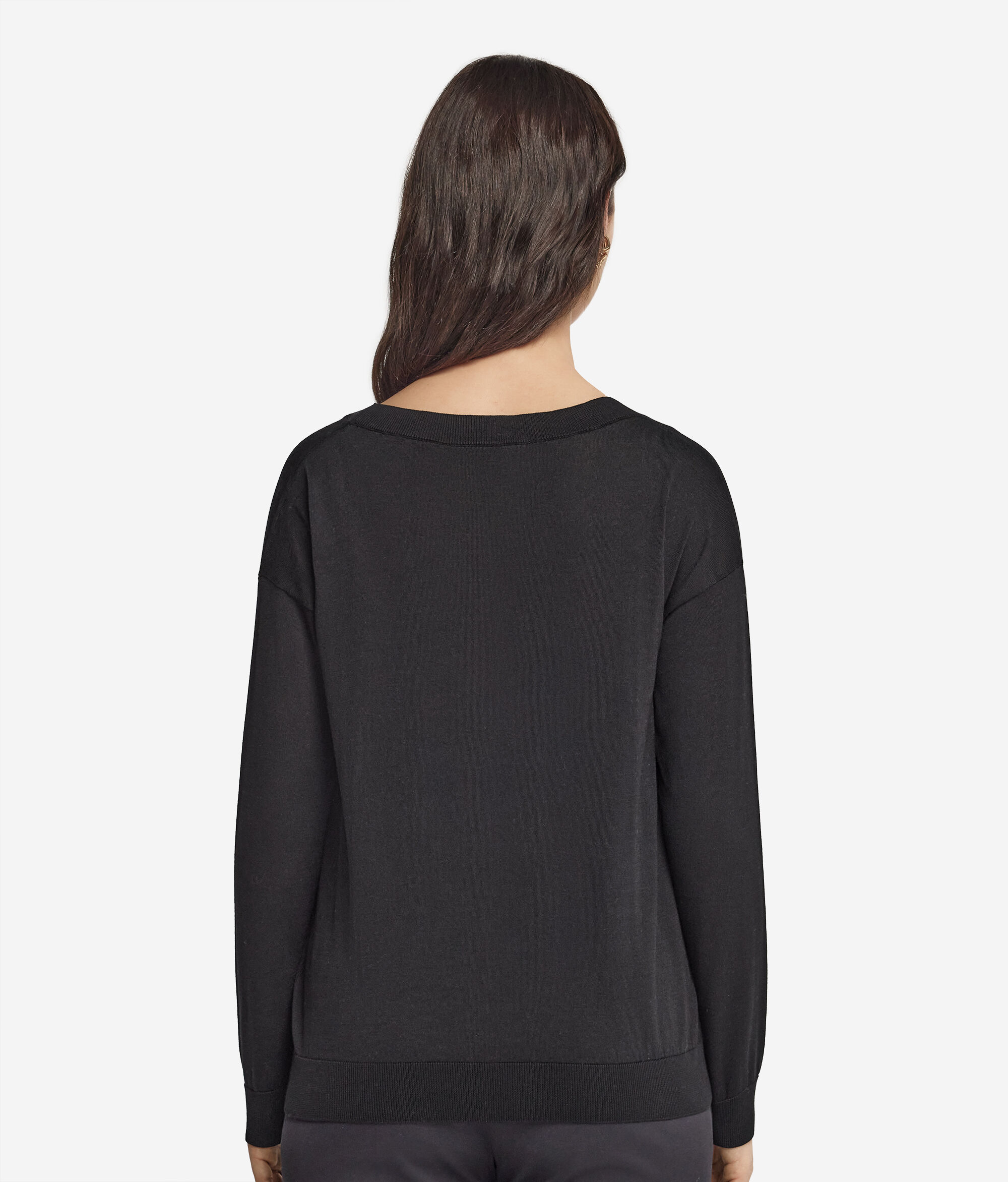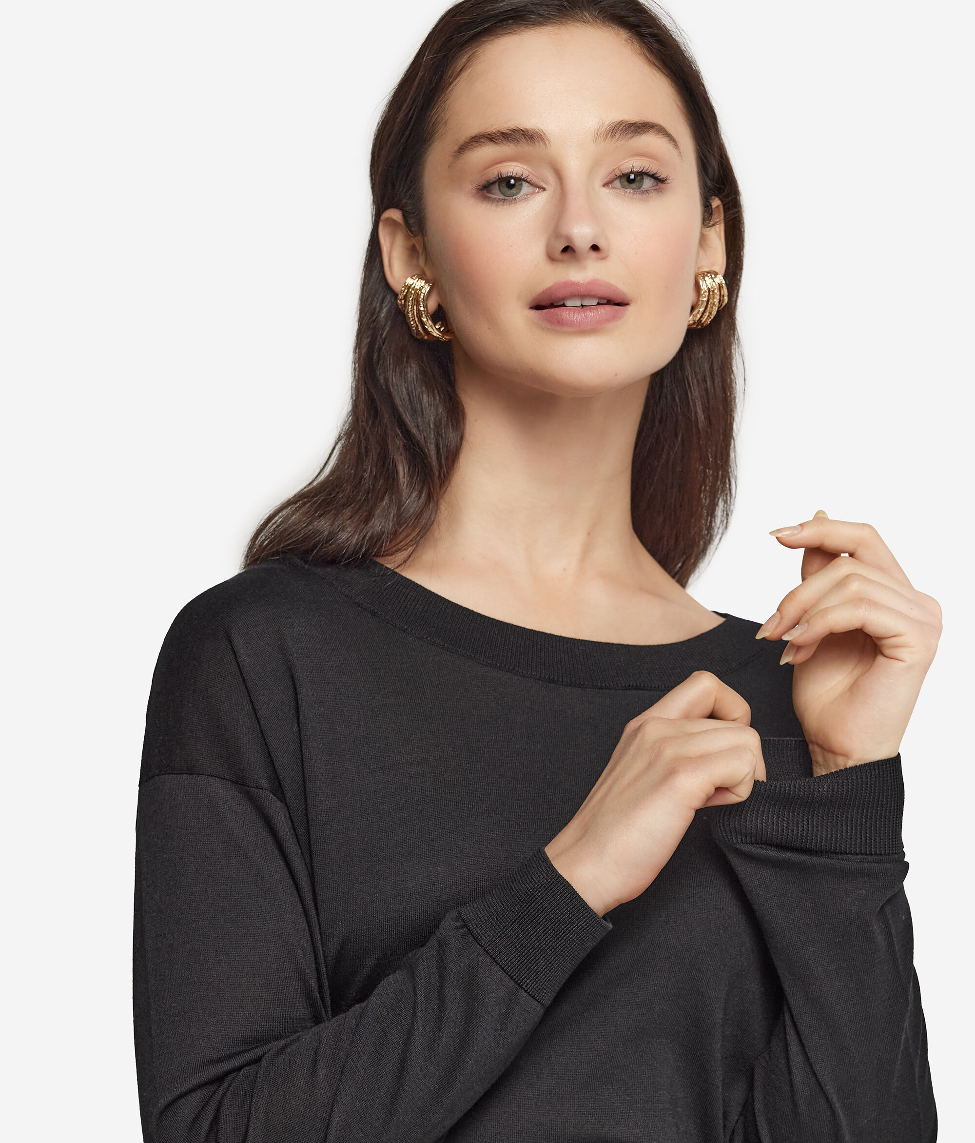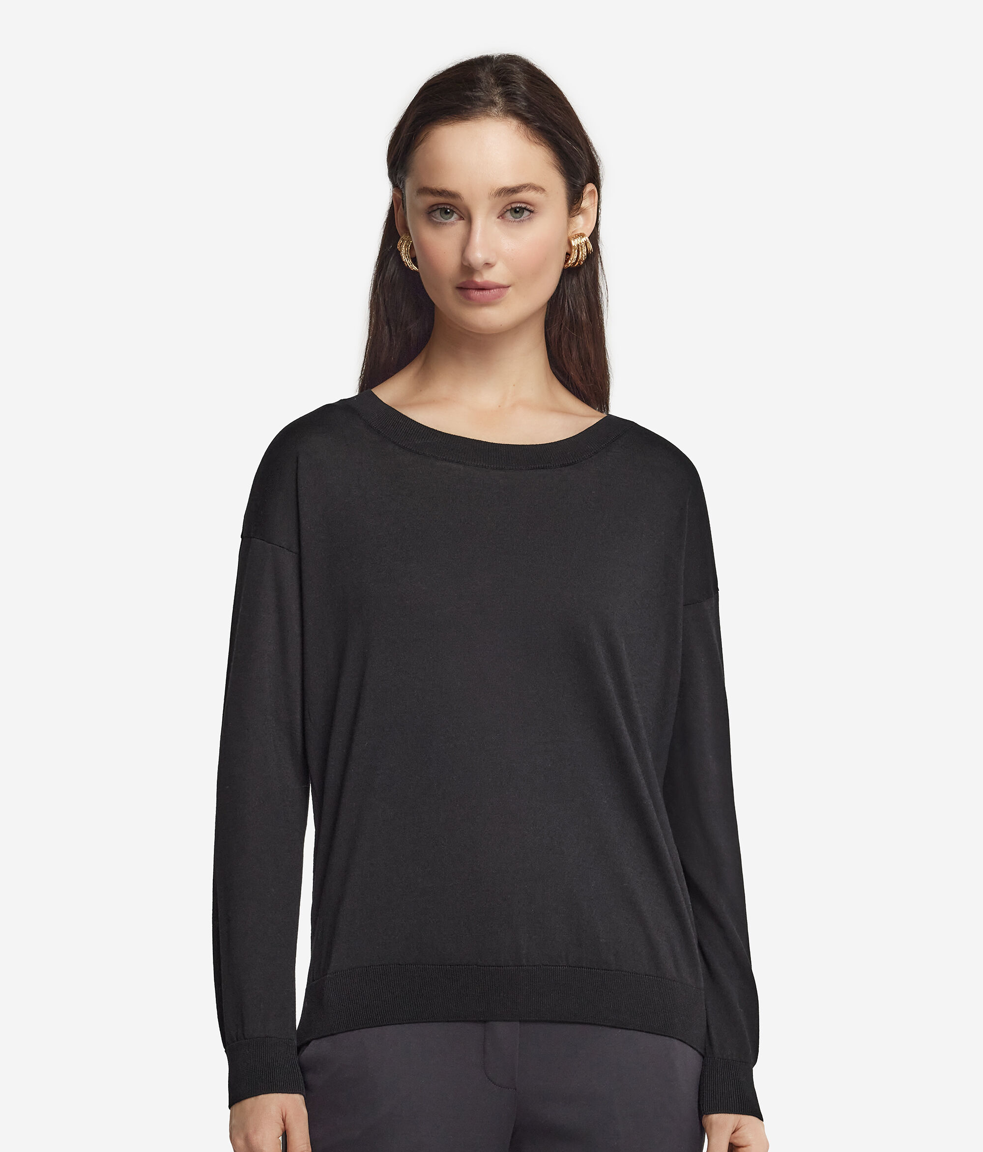 上質なシルクとコットンを使用し、柔らかなフォルムに仕上げたセーター。襟は広く開いたクルーネックで、滑らかな手触りと心地よい着心地が特長です。どのようなウェアとも合わせやすく、幅広い着こなしに対応して装いに個性を効かせる、ワードローブに欠かせないアイテム。