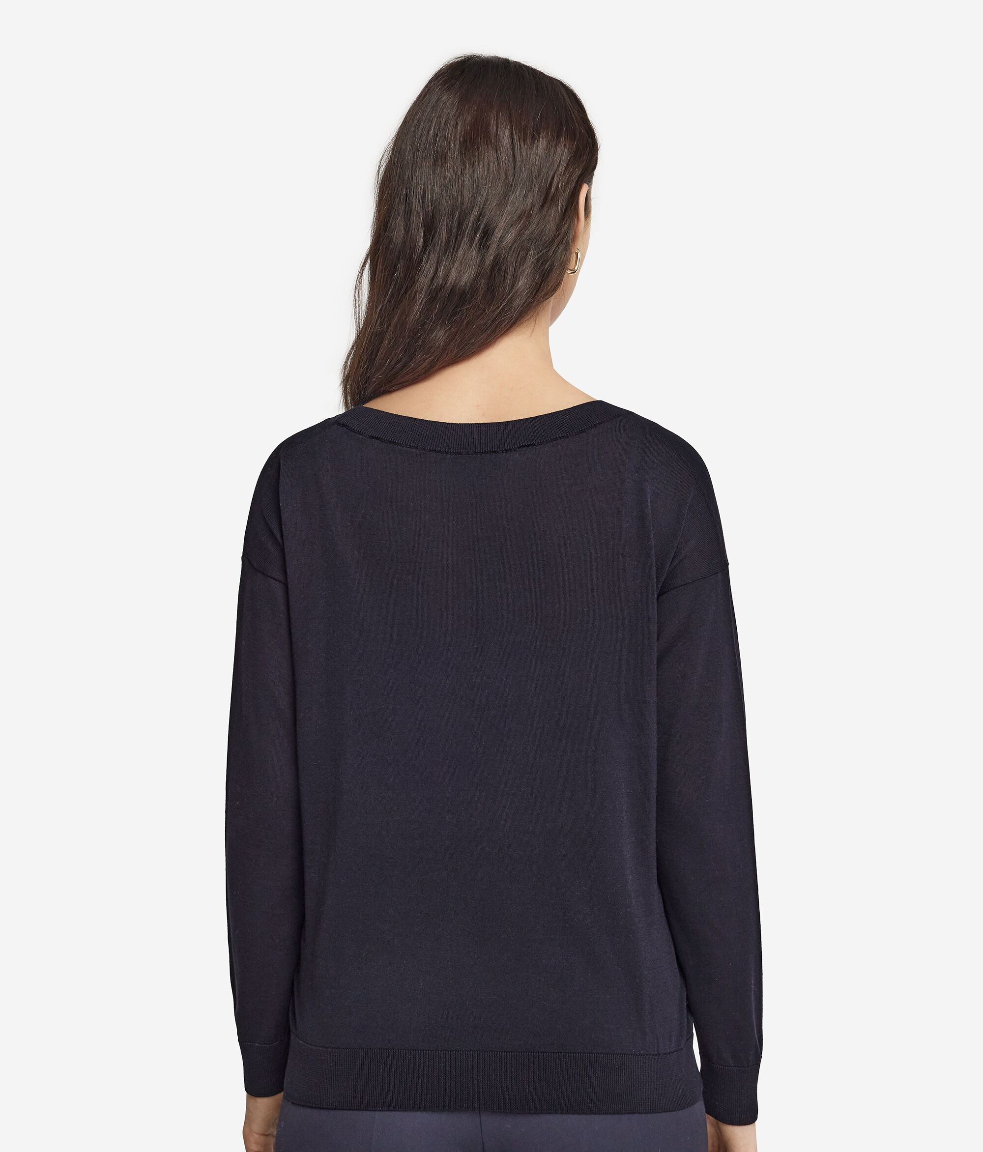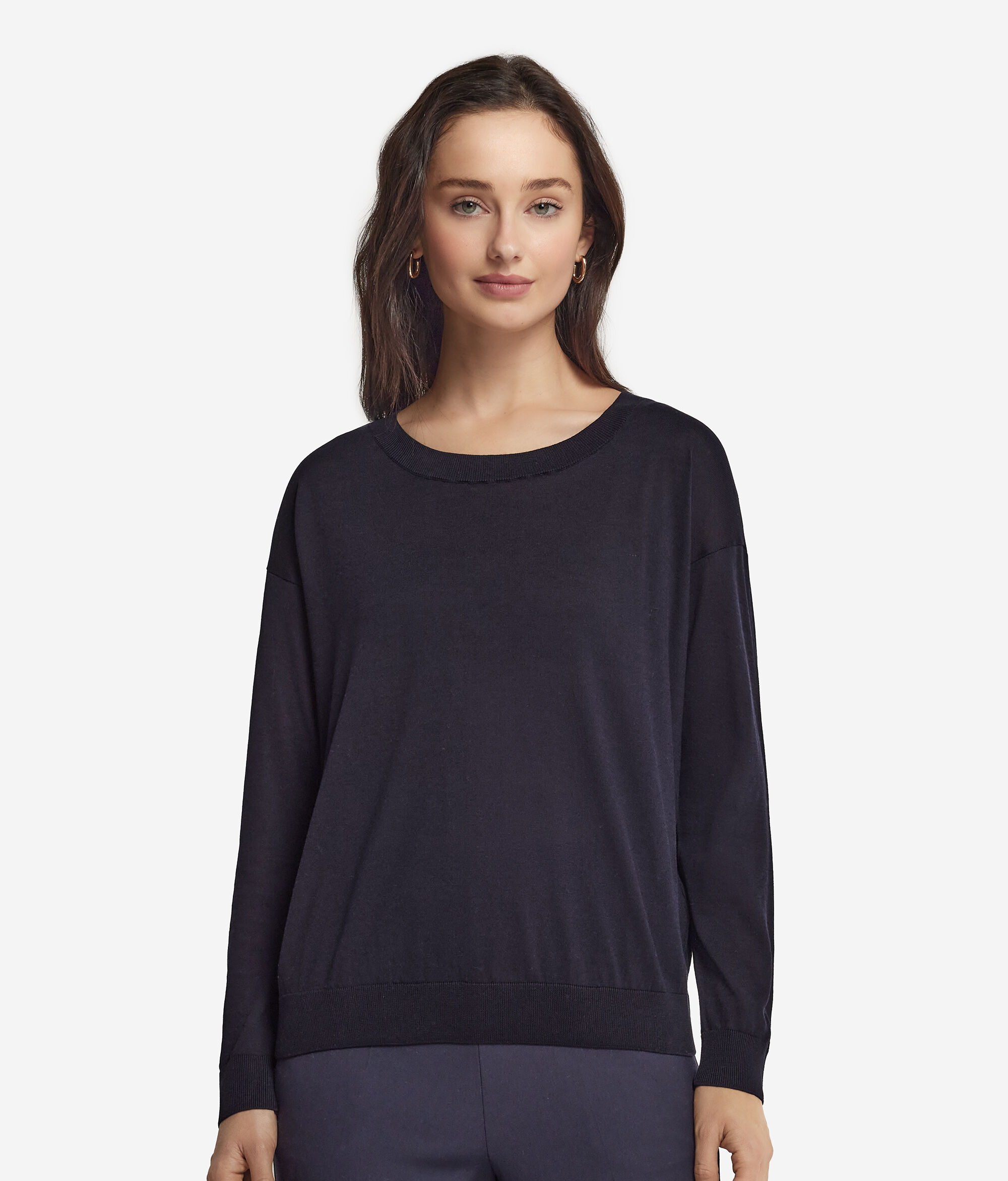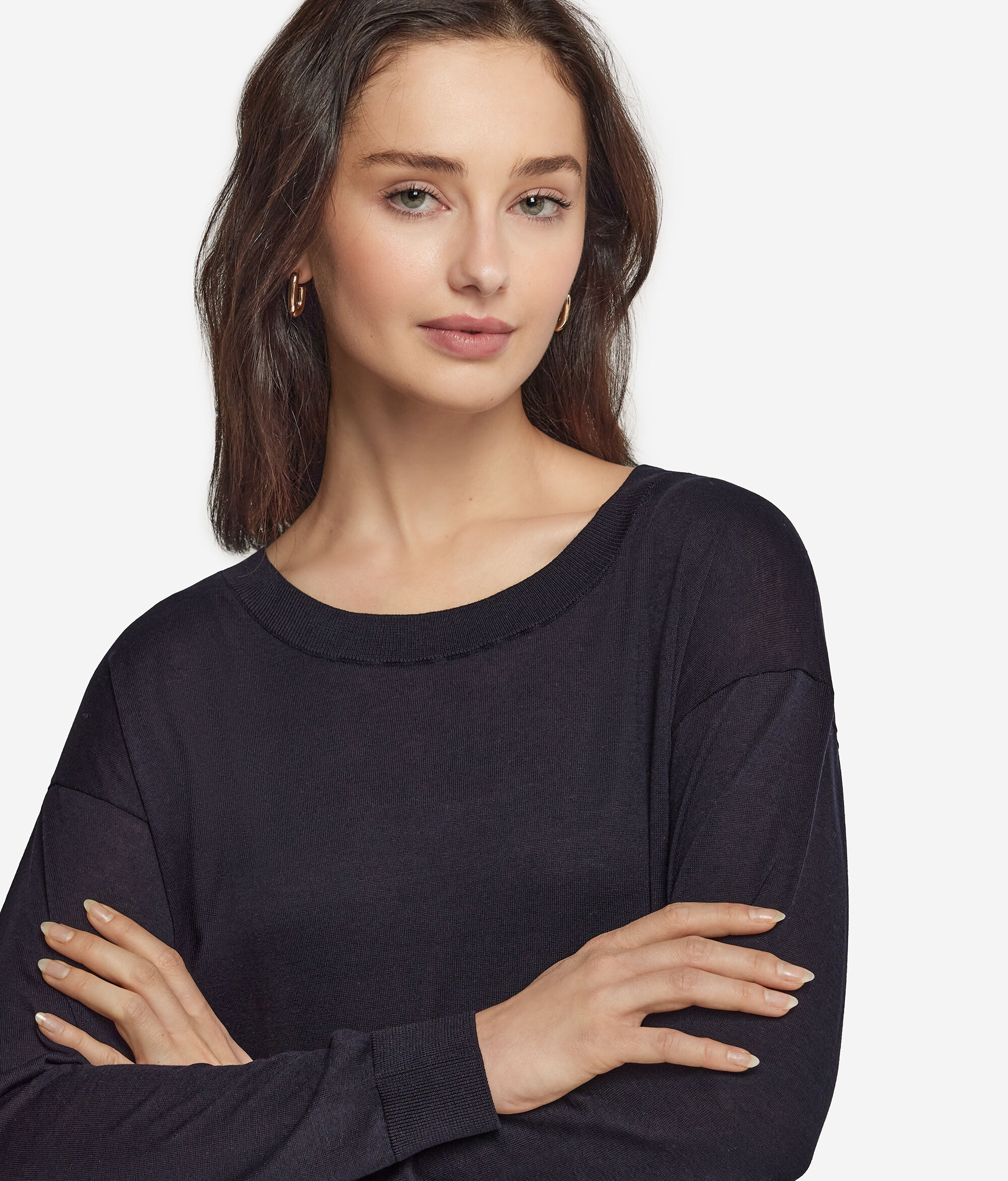 上質なシルクとコットンを使用し、柔らかなフォルムに仕上げたセーター。襟は広く開いたクルーネックで、滑らかな手触りと心地よい着心地が特長です。どのようなウェアとも合わせやすく、幅広い着こなしに対応して装いに個性を効かせる、ワードローブに欠かせないアイテム。