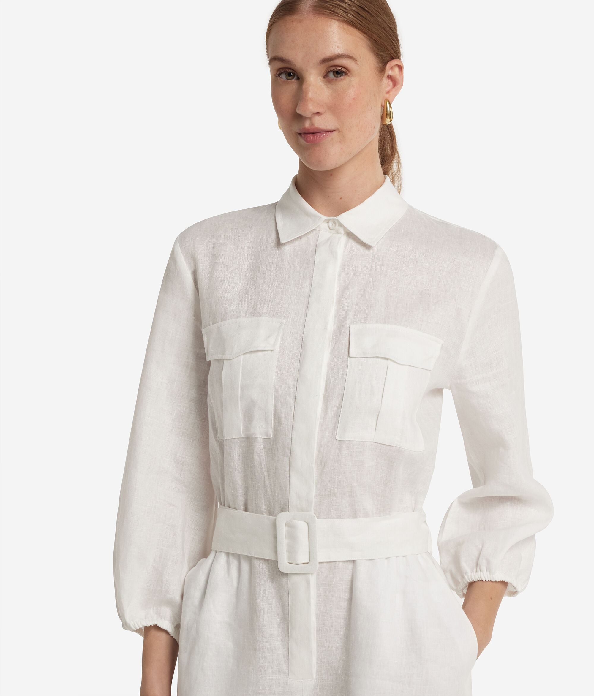 薄手の生地を使用して、ゆったりとしたボリューム感のあるカジュアルなスタイルに仕上げたリネン製のジャンプスーツ。トップス部分はクラシックな襟付きのメンズライクなシャツのデザインで、パンツはサファリスタイルを連想させるゆったりとしたシルエットが冒険心をくすぐります。ウエストラインをベルトで強調し、ボディラインを美しく引き立てながら、機能性とコンテンポラリーなテイストを掛け合わせています。