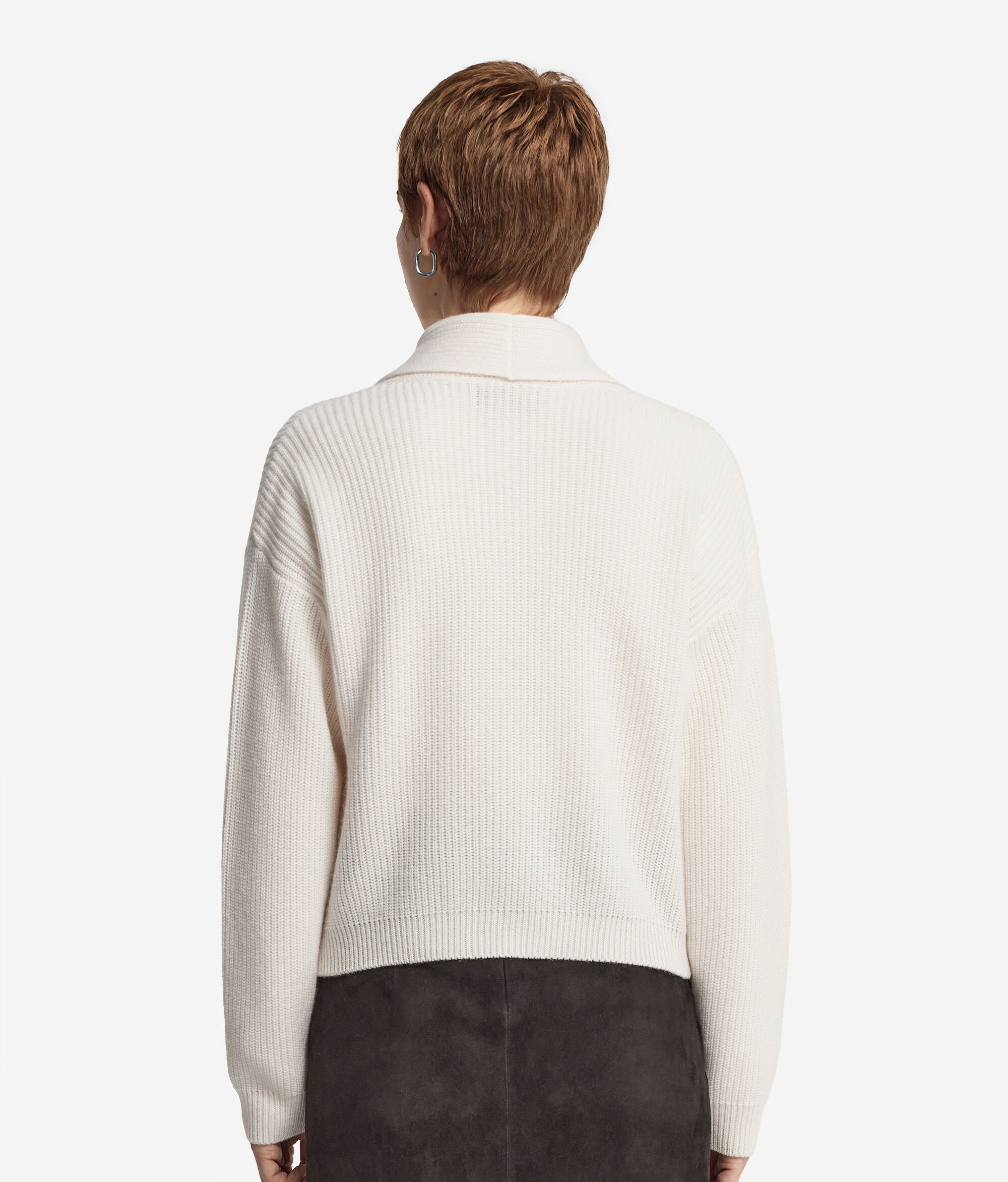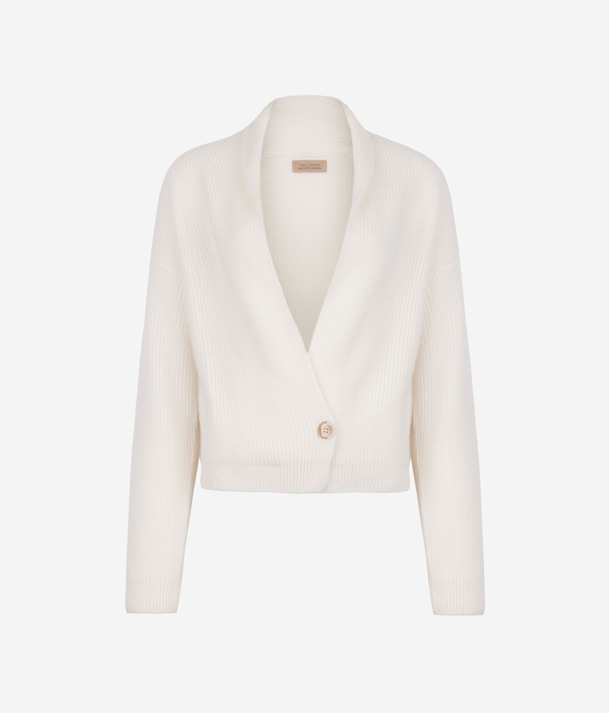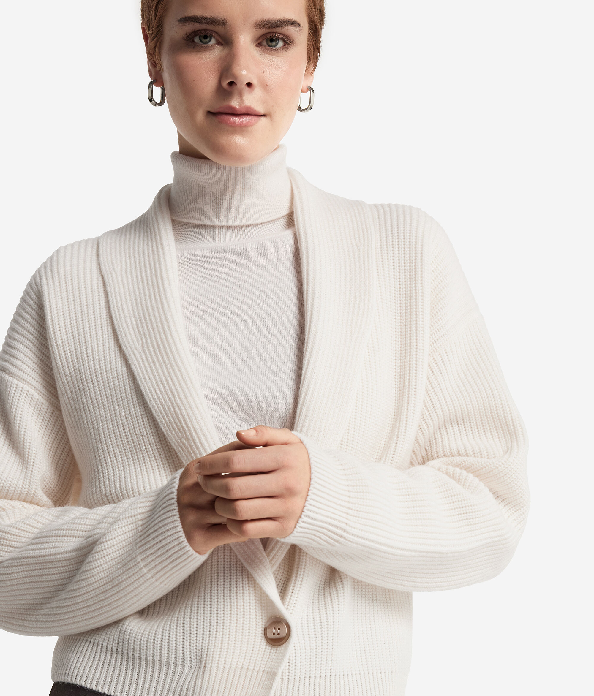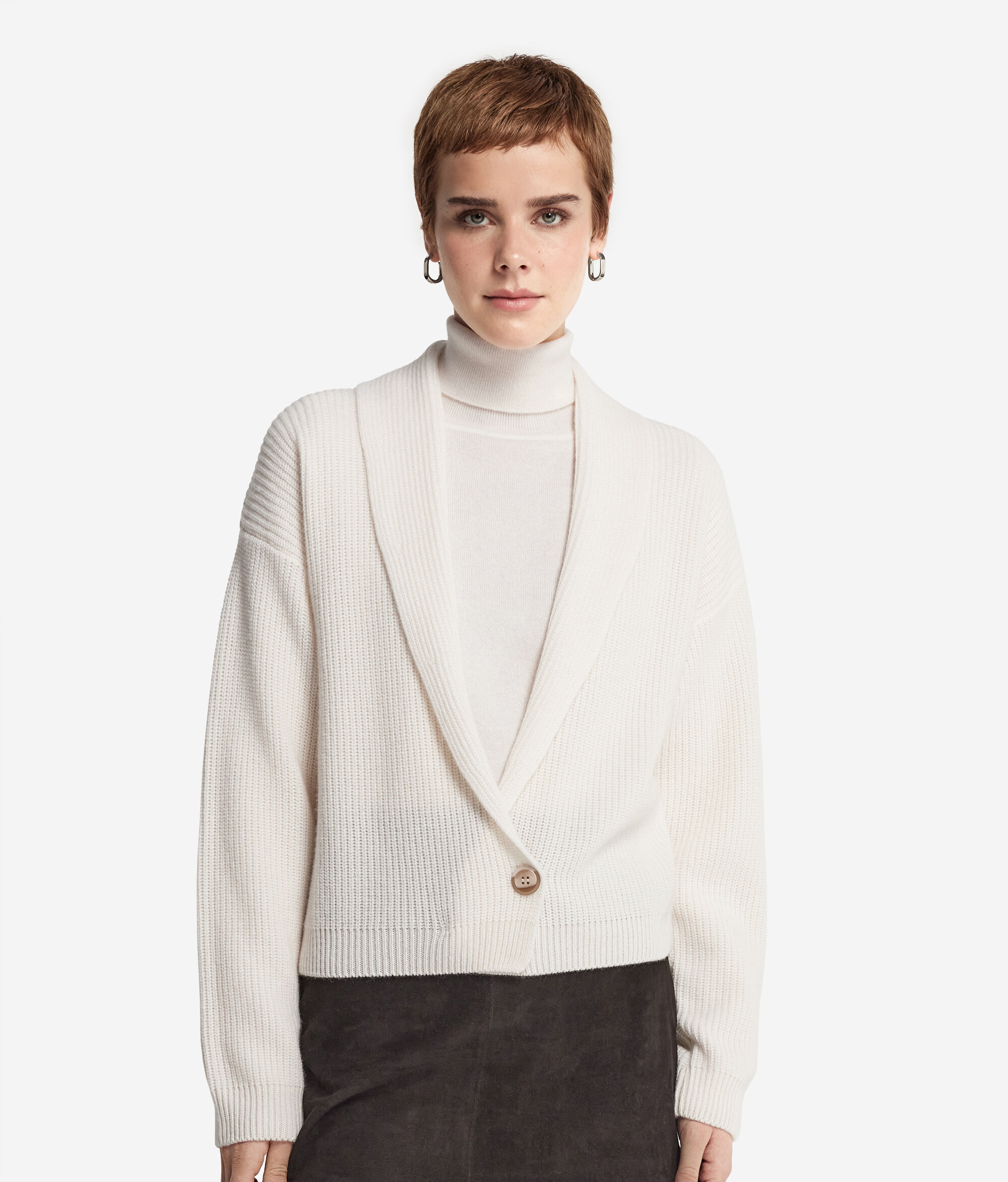 高級感あふれるウルトラソフトカシミヤヤーンで優雅なデザインを引き立てたカーディガン。ショールカラーにカットされたアイテムで、中央のボタン式開閉部とラペルでインパクトの大きいVネックを形作りました。控えめでありながら洗練性が際立つこのアイテムは、品質と趣向を凝らしたスタイリッシュさをお探しの方のワードローブに欠かせません。