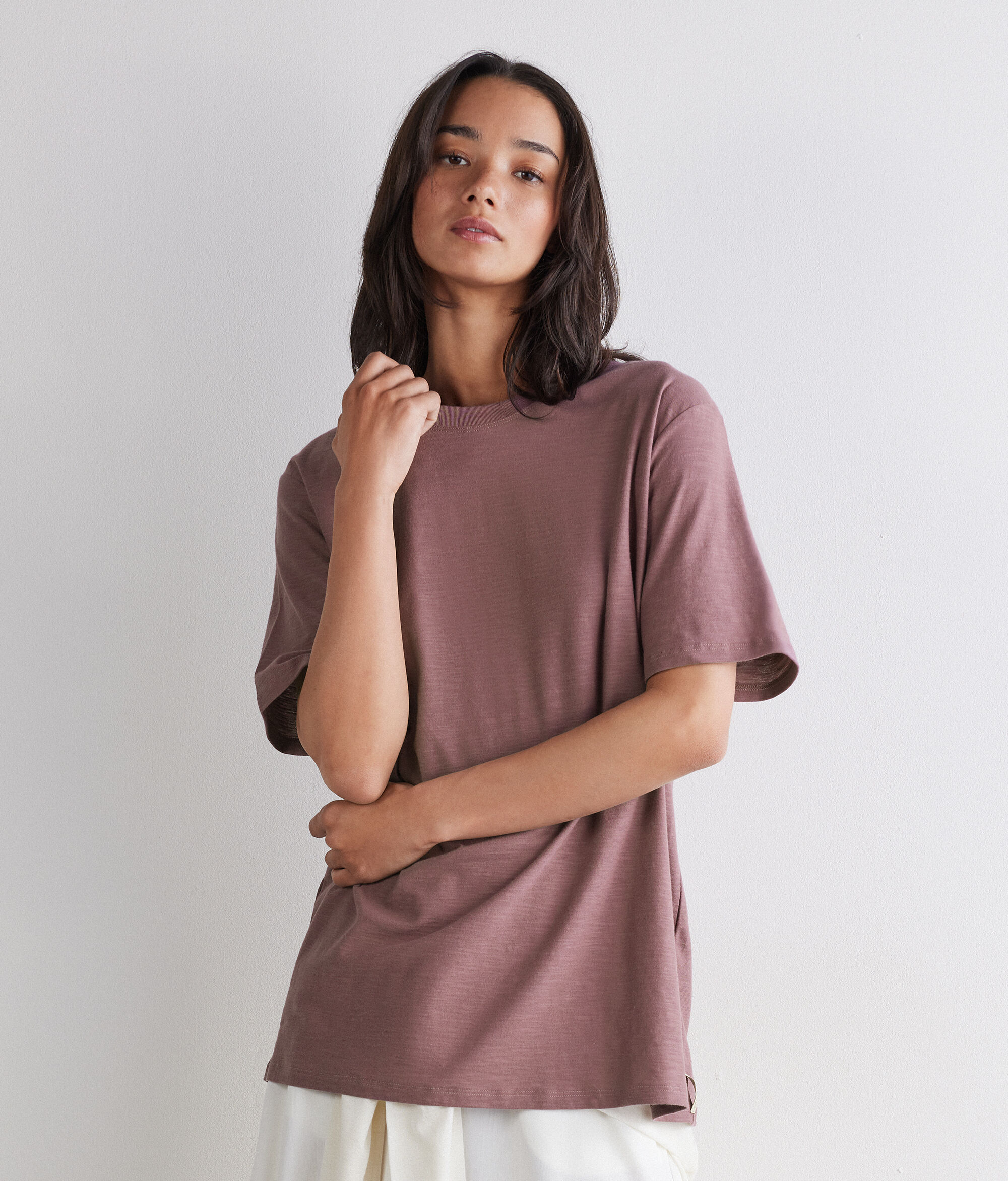 天然ヤーンの品質でなめらかで快適な質感を実現した、コットン100%のTシャツ。ゆったりとしたフィット感と完璧な腰丈が現代感を引き立てる、カジュアルなルックをシンプルかつスタイリッシュに仕上げるために理想的なアイテムです。