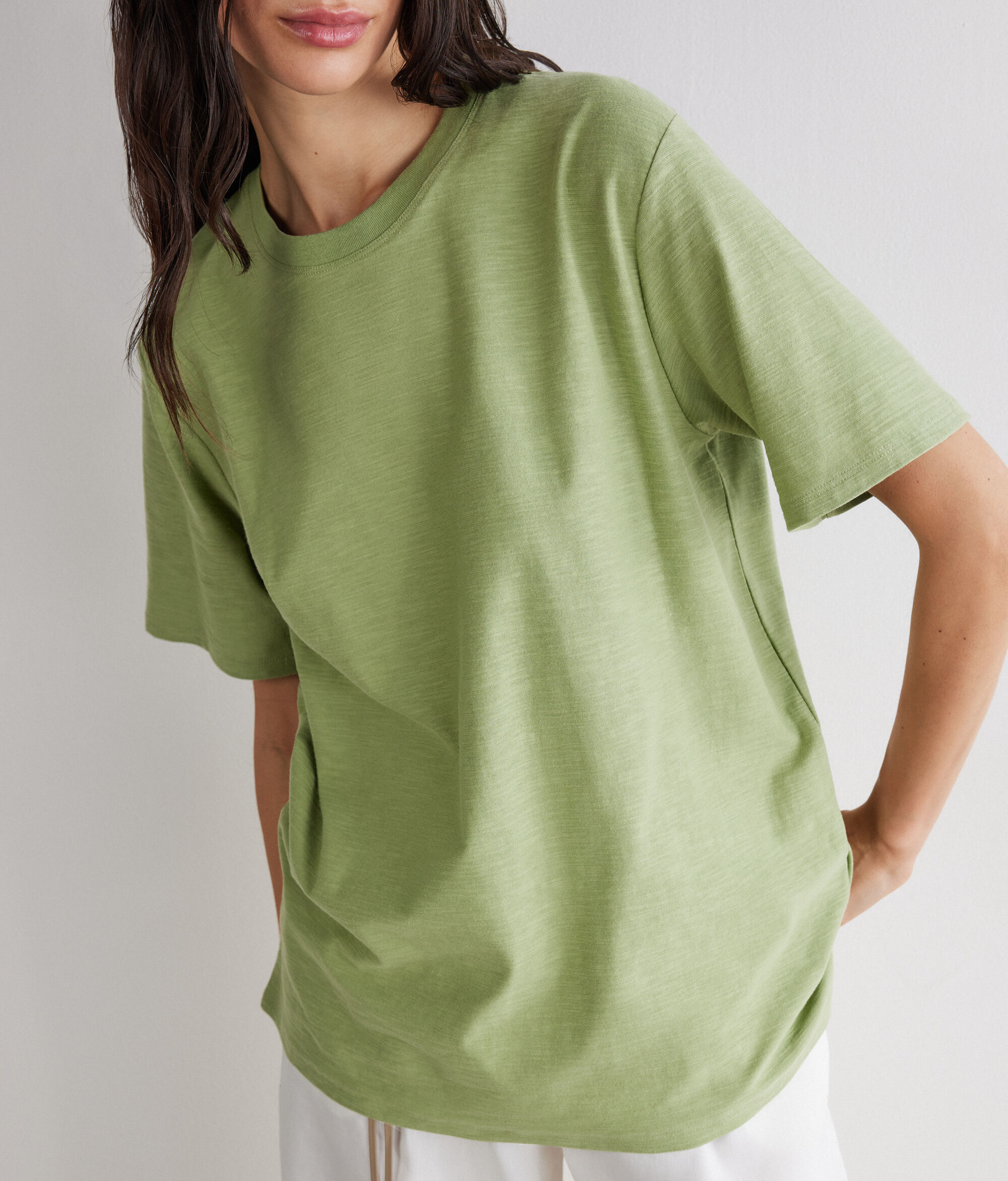天然ヤーンの品質でなめらかで快適な質感を実現した、コットン100%のTシャツ。ゆったりとしたフィット感と完璧な腰丈が現代感を引き立てる、カジュアルなルックをシンプルかつスタイリッシュに仕上げるために理想的なアイテムです。