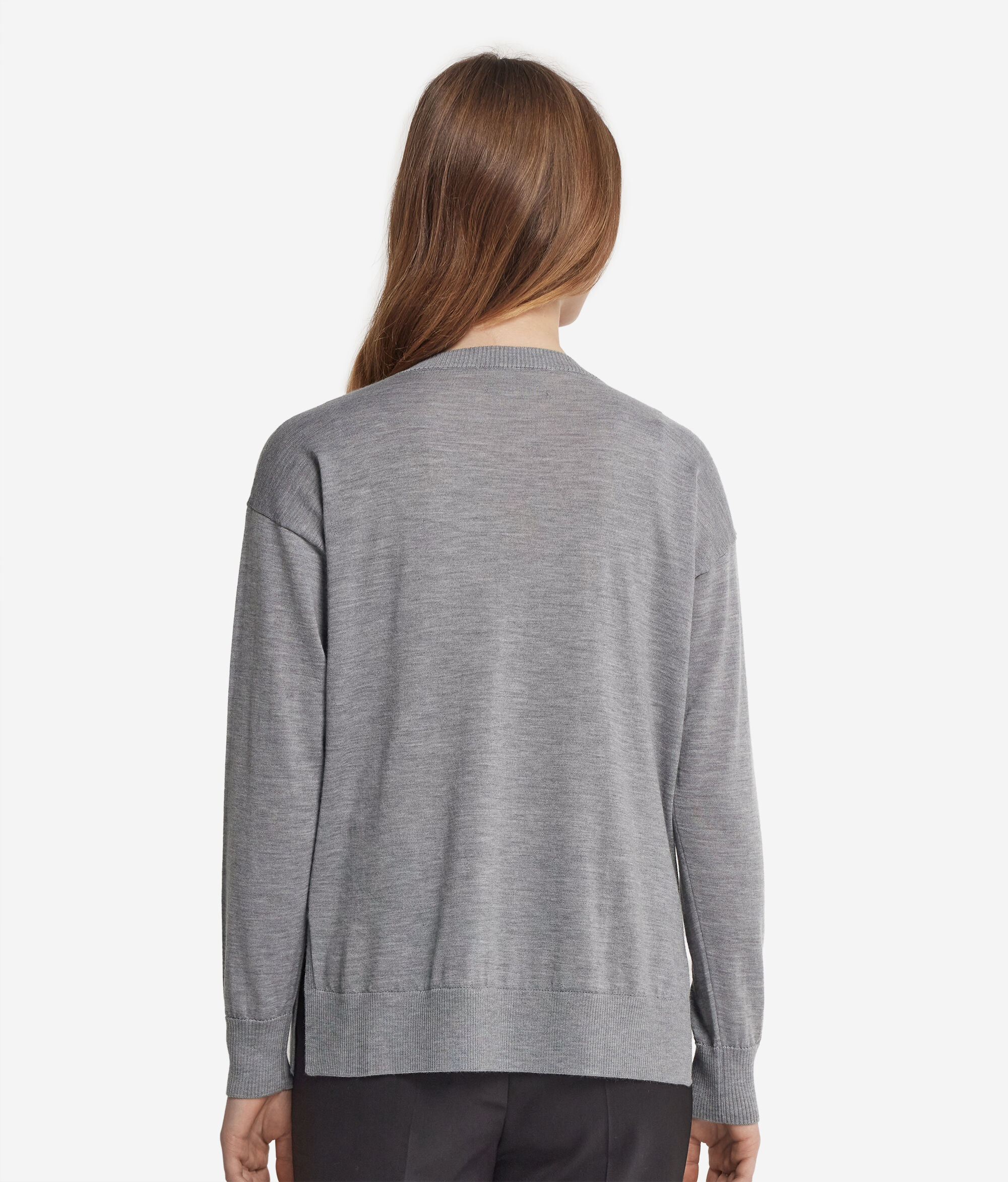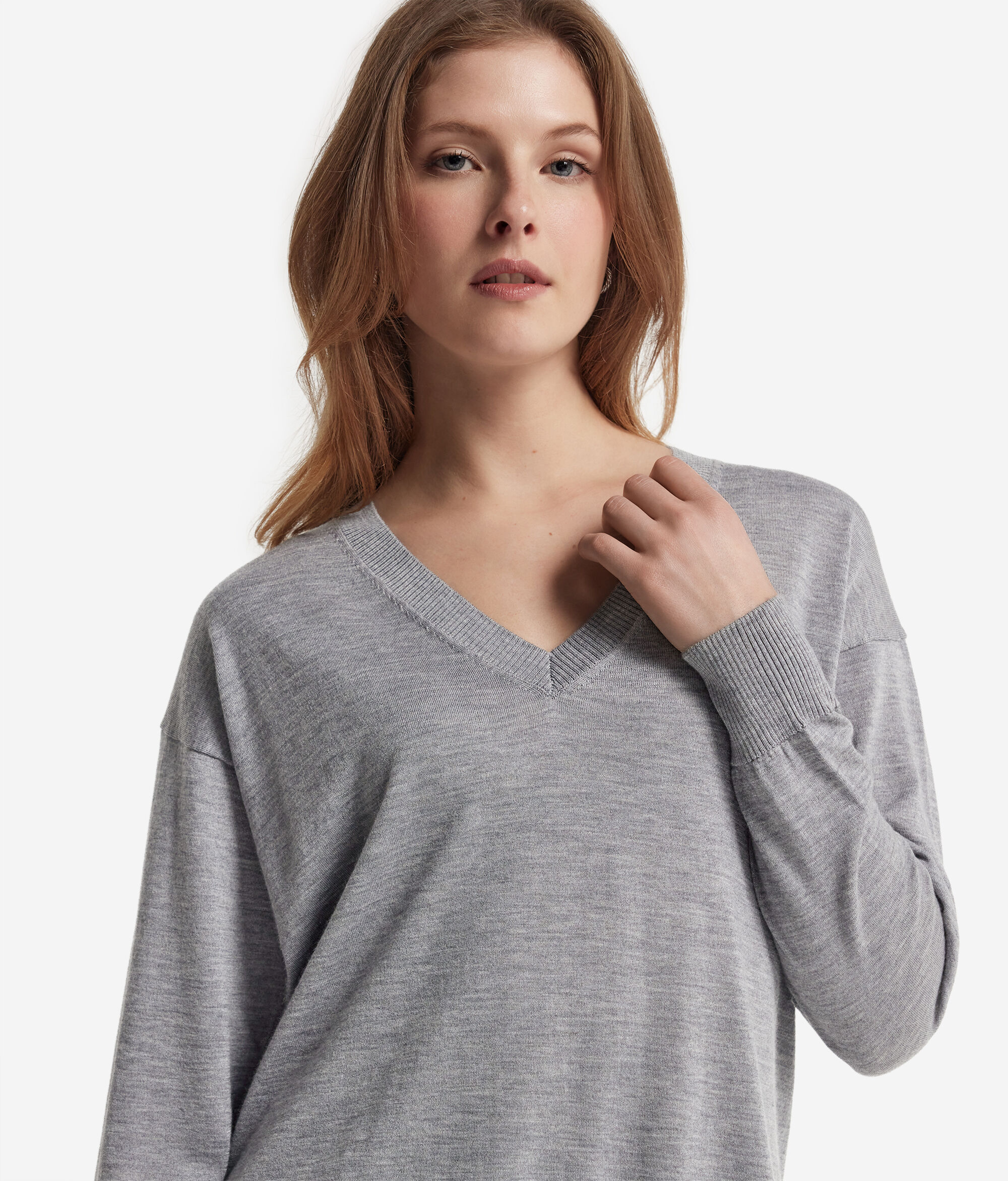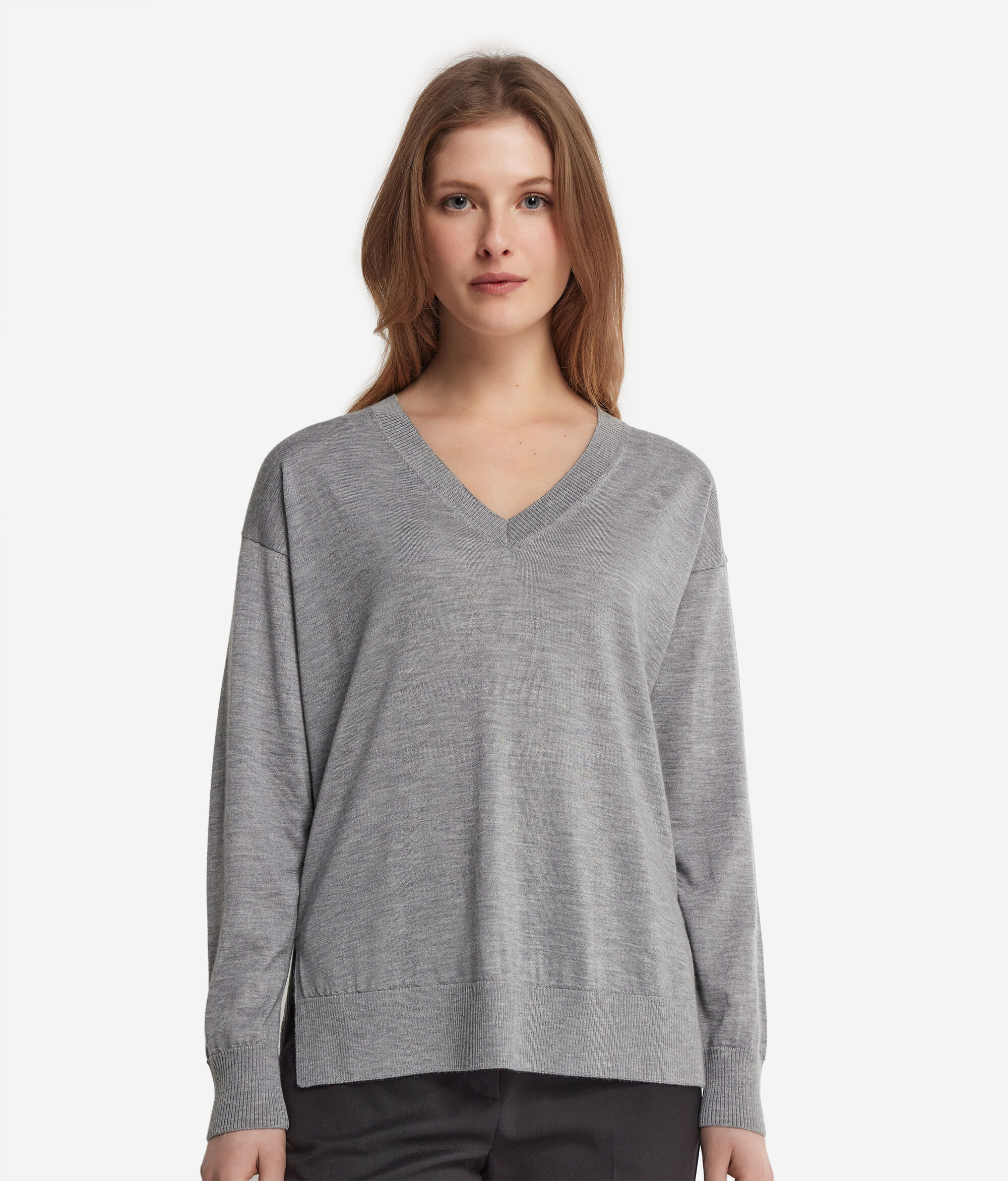 ウルトラファインカシミヤ素材を用いた長袖のVネックセーター。ネックライン、袖口と裾にあしらったリブ編みが特徴になっています。サイドのスリットが個性的なモデルです。肩はドロップショルダー気味で、ソフトなフィット感に仕上げています。