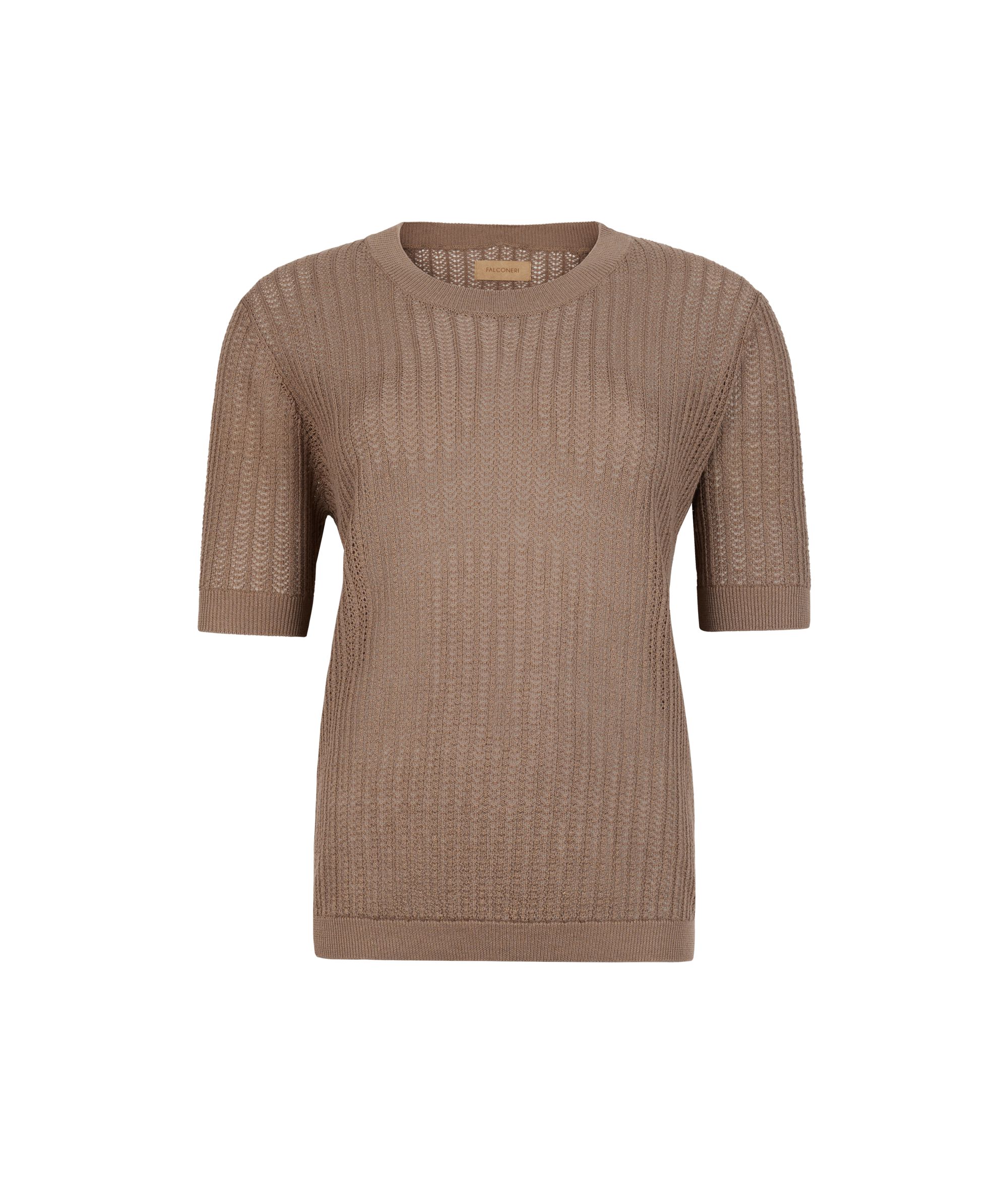 リブ風の繊細な透かし編みと、天然素材のナチュラルな軽やかさでリラックス感と爽やかさを出したコットン製のTシャツ。ややドロップショルダーのデザインとヒップ丈の長さが、ゆったりと流れるようなシルエットを自然と生み出すこのアイテムは、毎日のルックを美しくロマンチックに仕上げたい女性におすすめです。