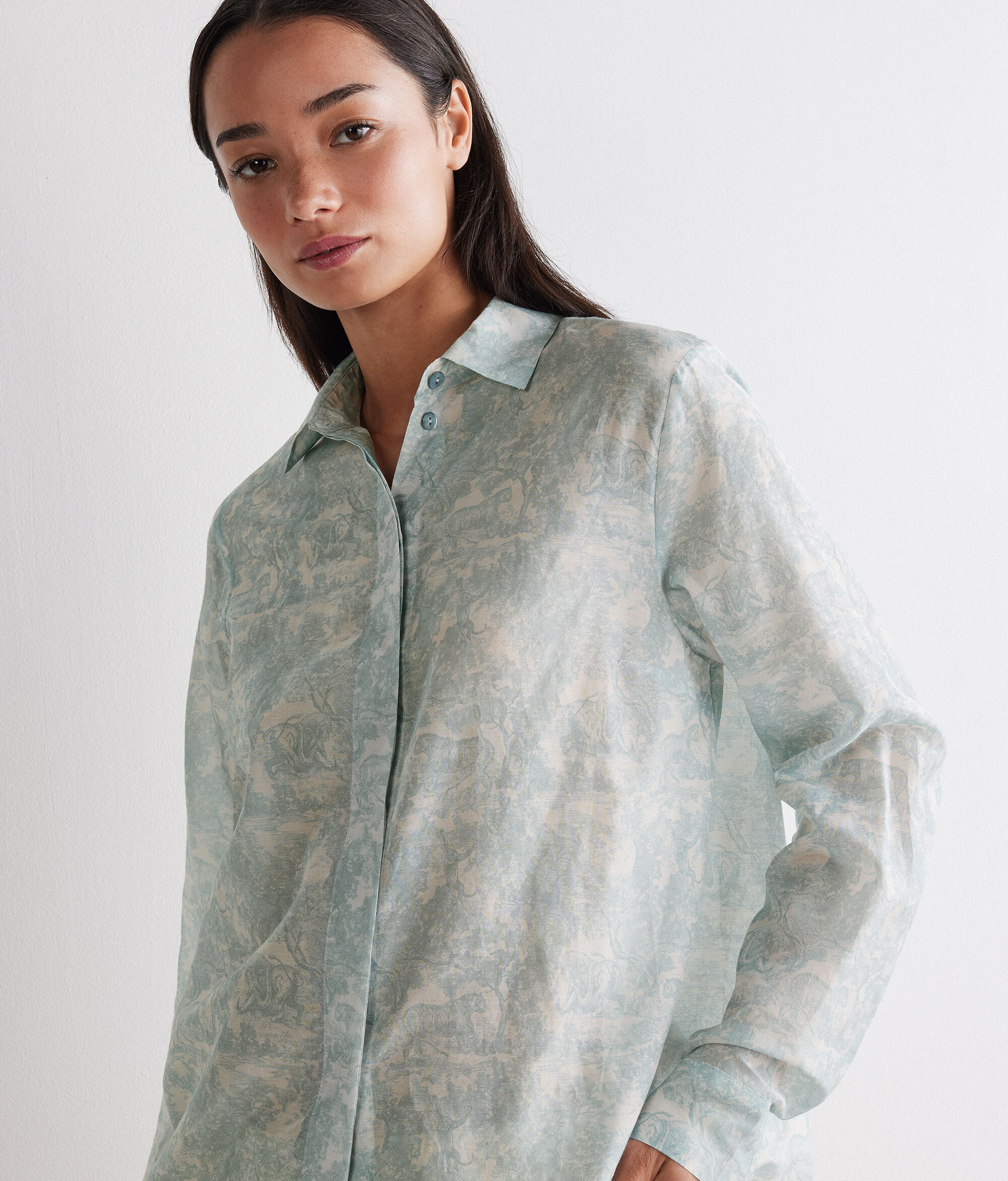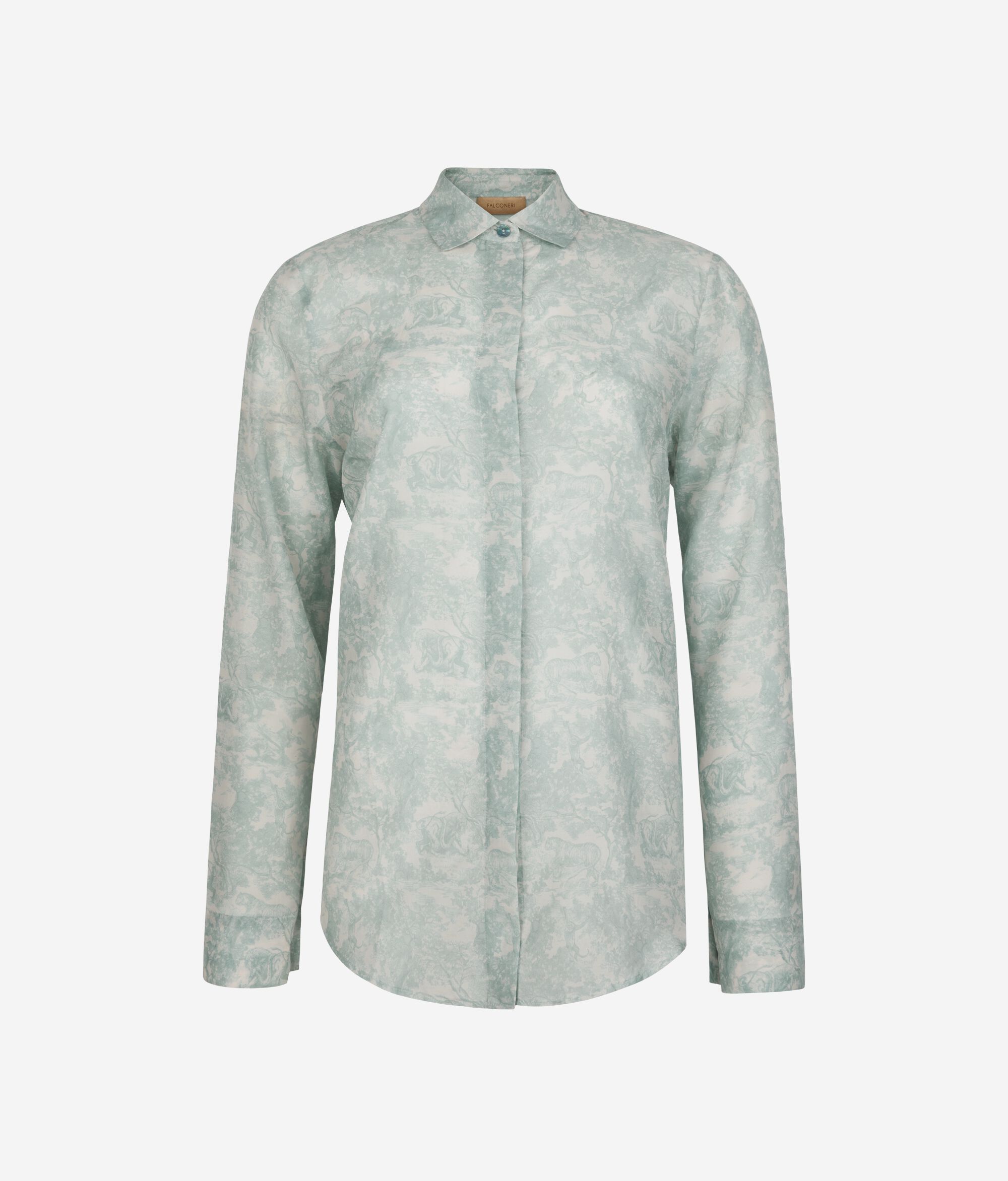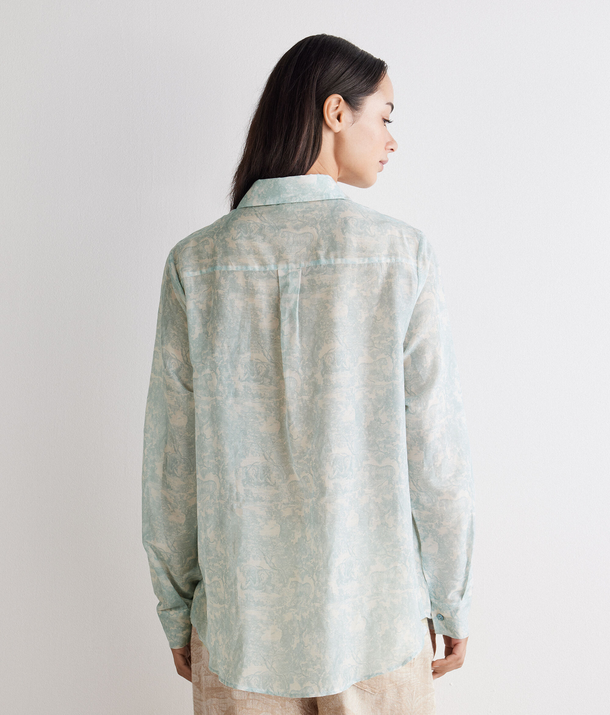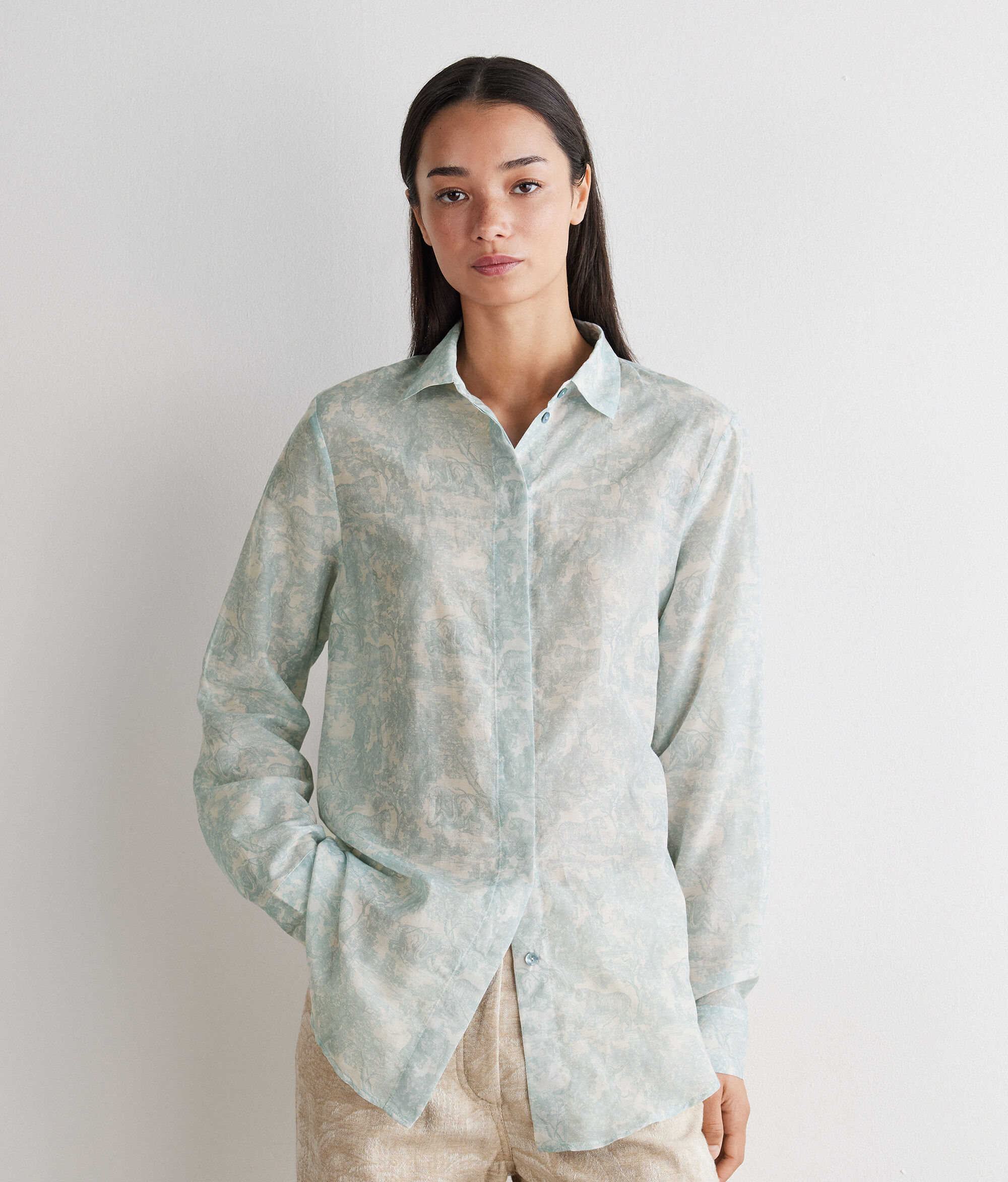 柄をプリントしたコットンとシルクの軽やかな生地が、エレガントで洗練された印象を放つシャツ。開閉部には隠しボタンを使用することで、全体的にすっきりとしたデザインに。丸みを帯びた裾のラインがゆるやかなシルエットを演出し、さりげなく個性を放ちます。腰丈、リラックスフィットのモデルで、どのようなコーディネートもスタイリッシュに仕上げ、幅広いシーンで活躍するアイテムです。