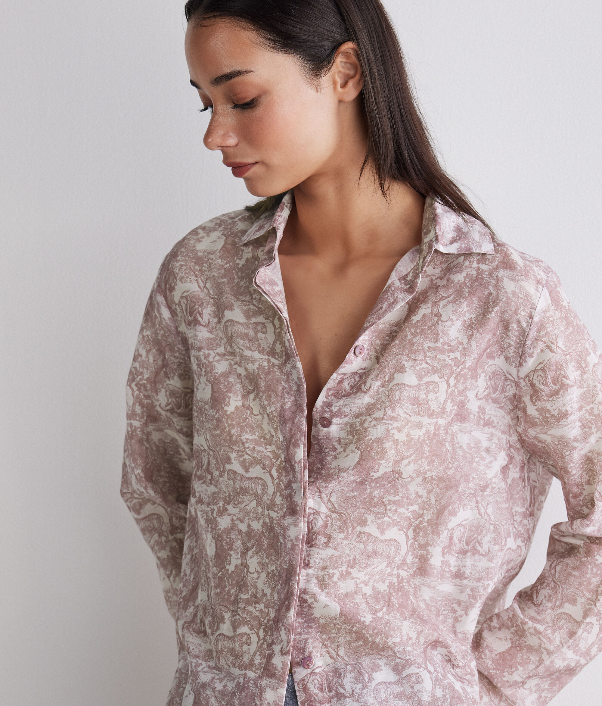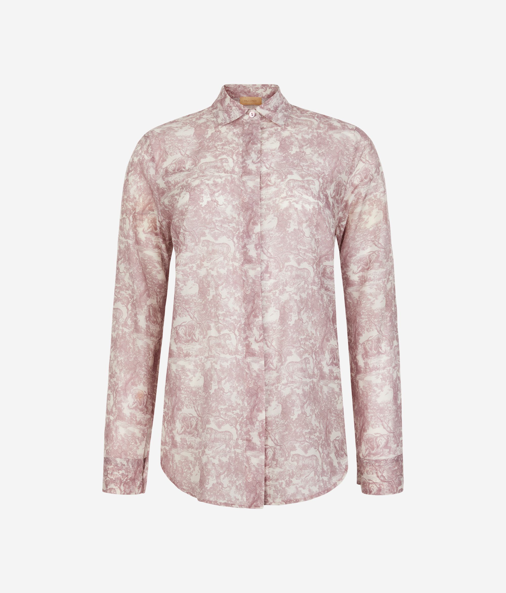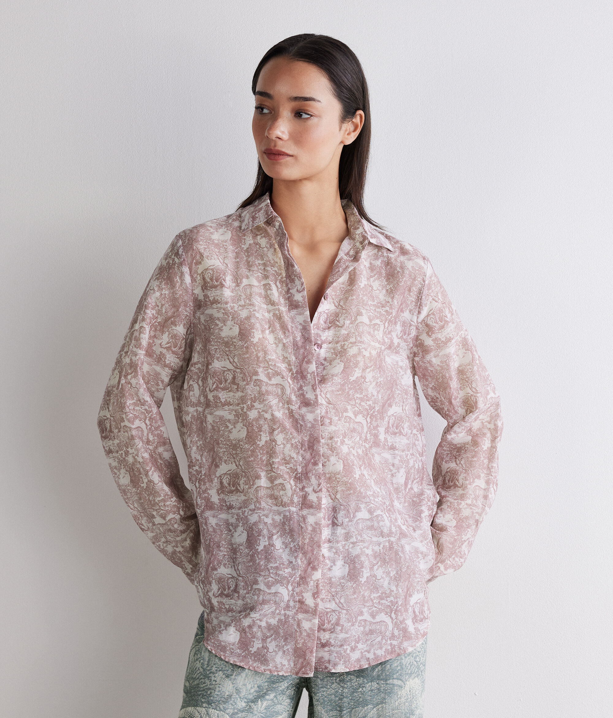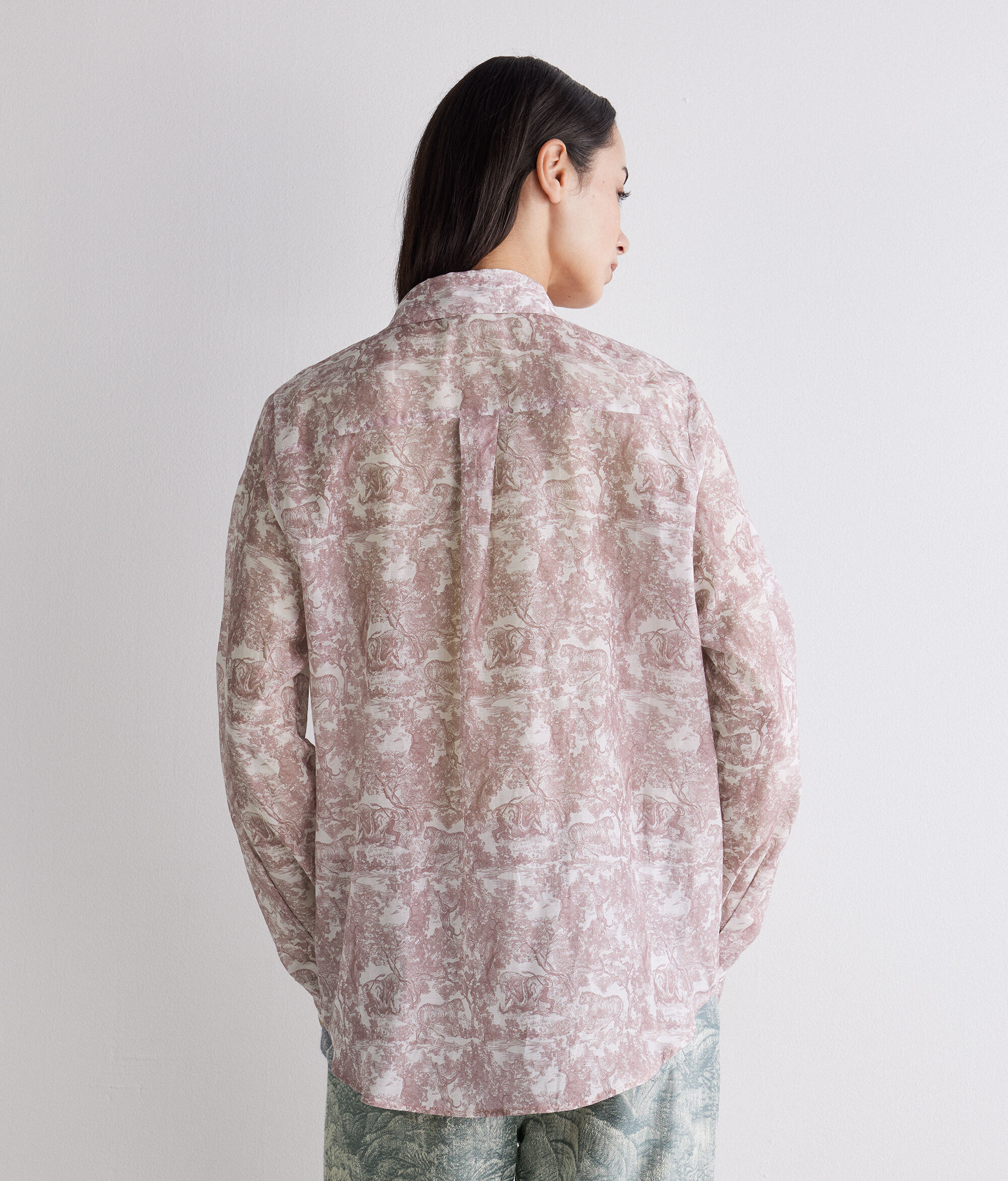 柄をプリントしたコットンとシルクの軽やかな生地が、エレガントで洗練された印象を放つシャツ。開閉部には隠しボタンを使用することで、全体的にすっきりとしたデザインに。丸みを帯びた裾のラインがゆるやかなシルエットを演出し、さりげなく個性を放ちます。腰丈、リラックスフィットのモデルで、どのようなコーディネートもスタイリッシュに仕上げ、幅広いシーンで活躍するアイテムです。