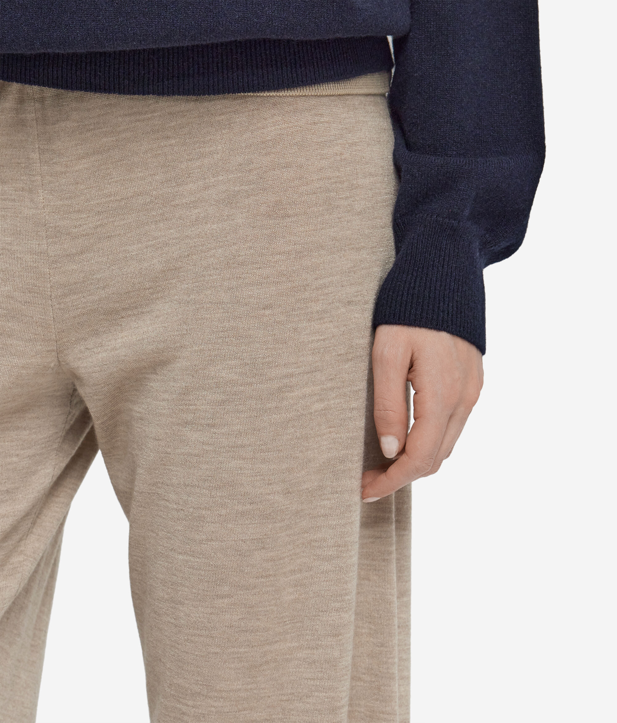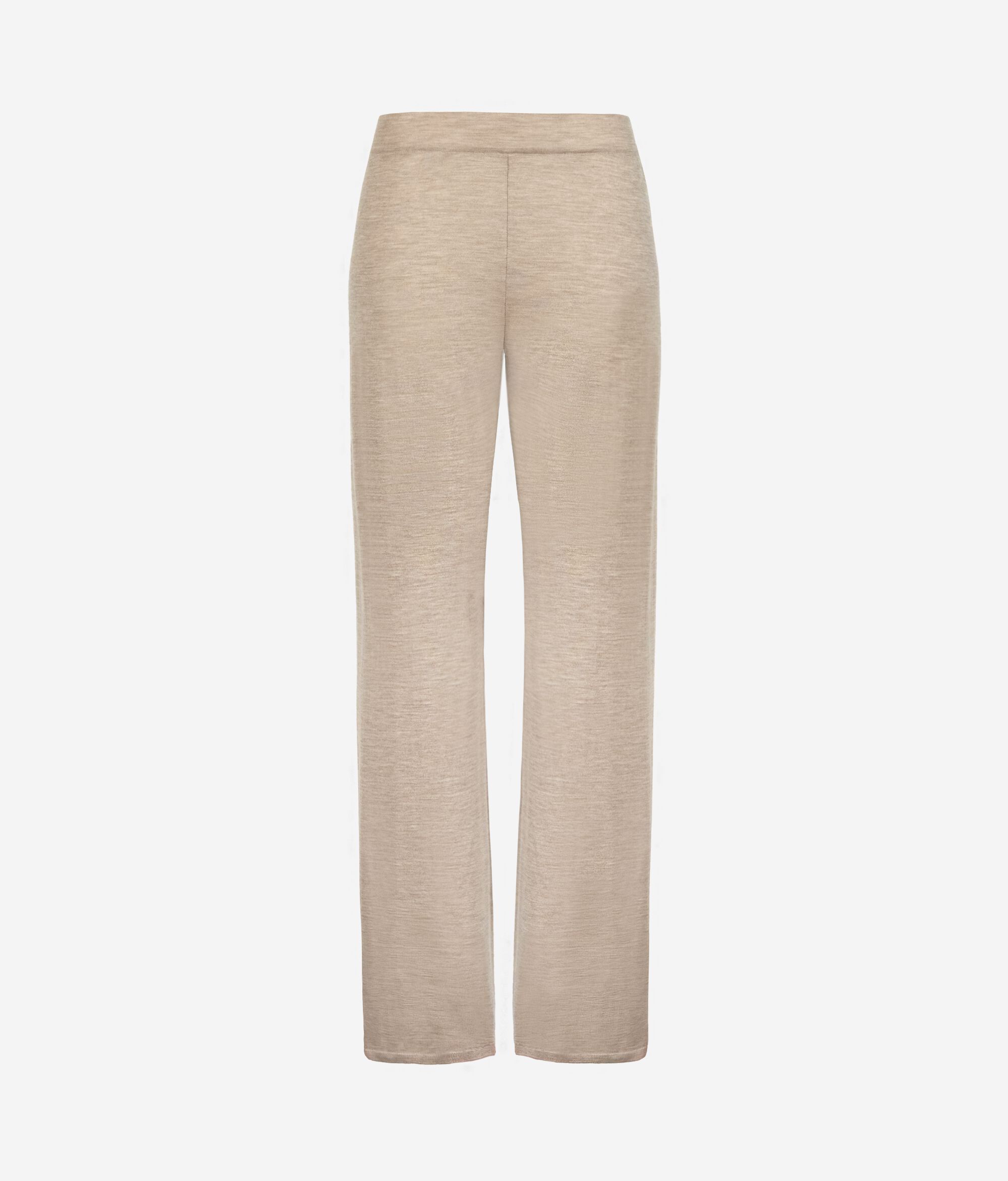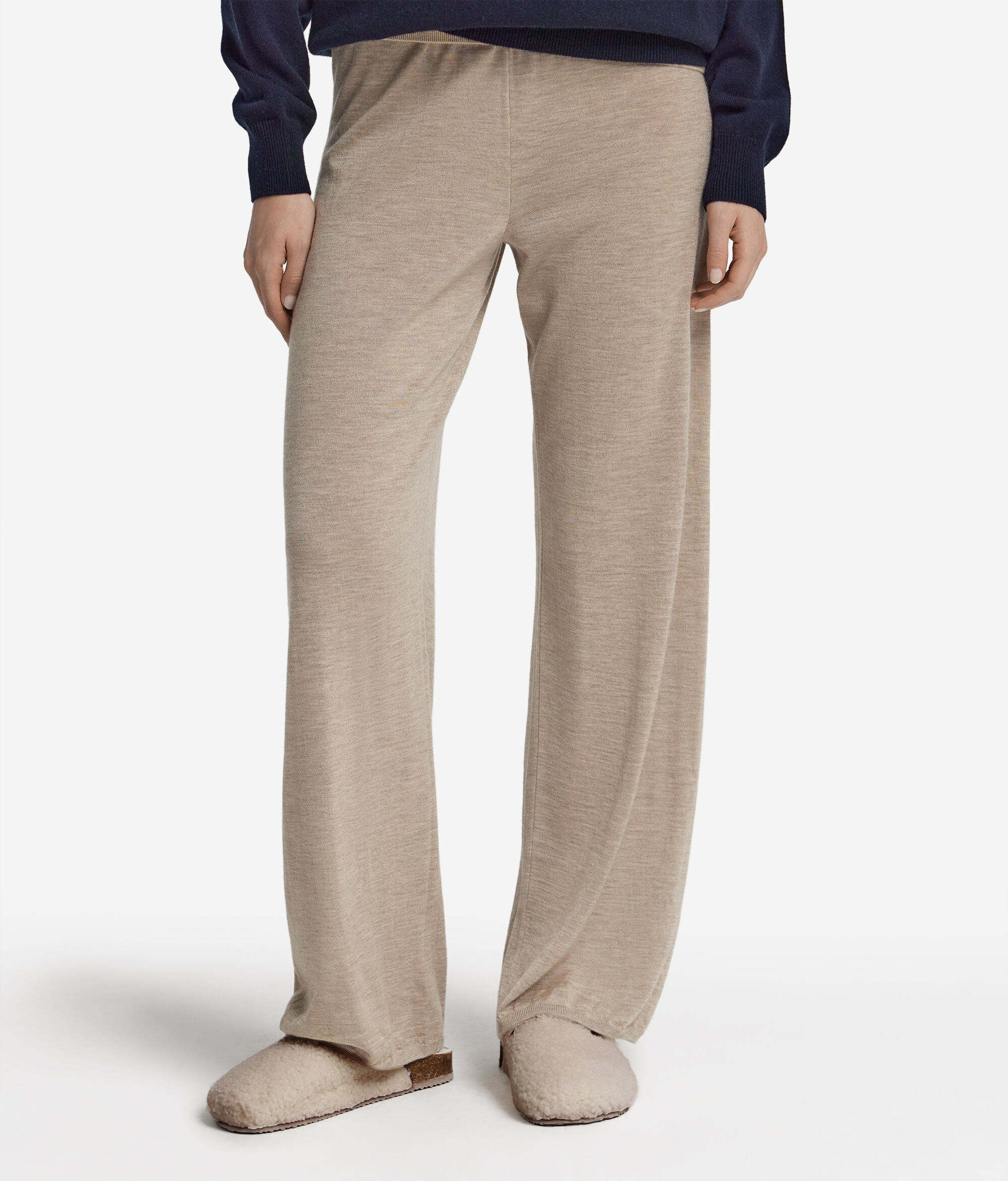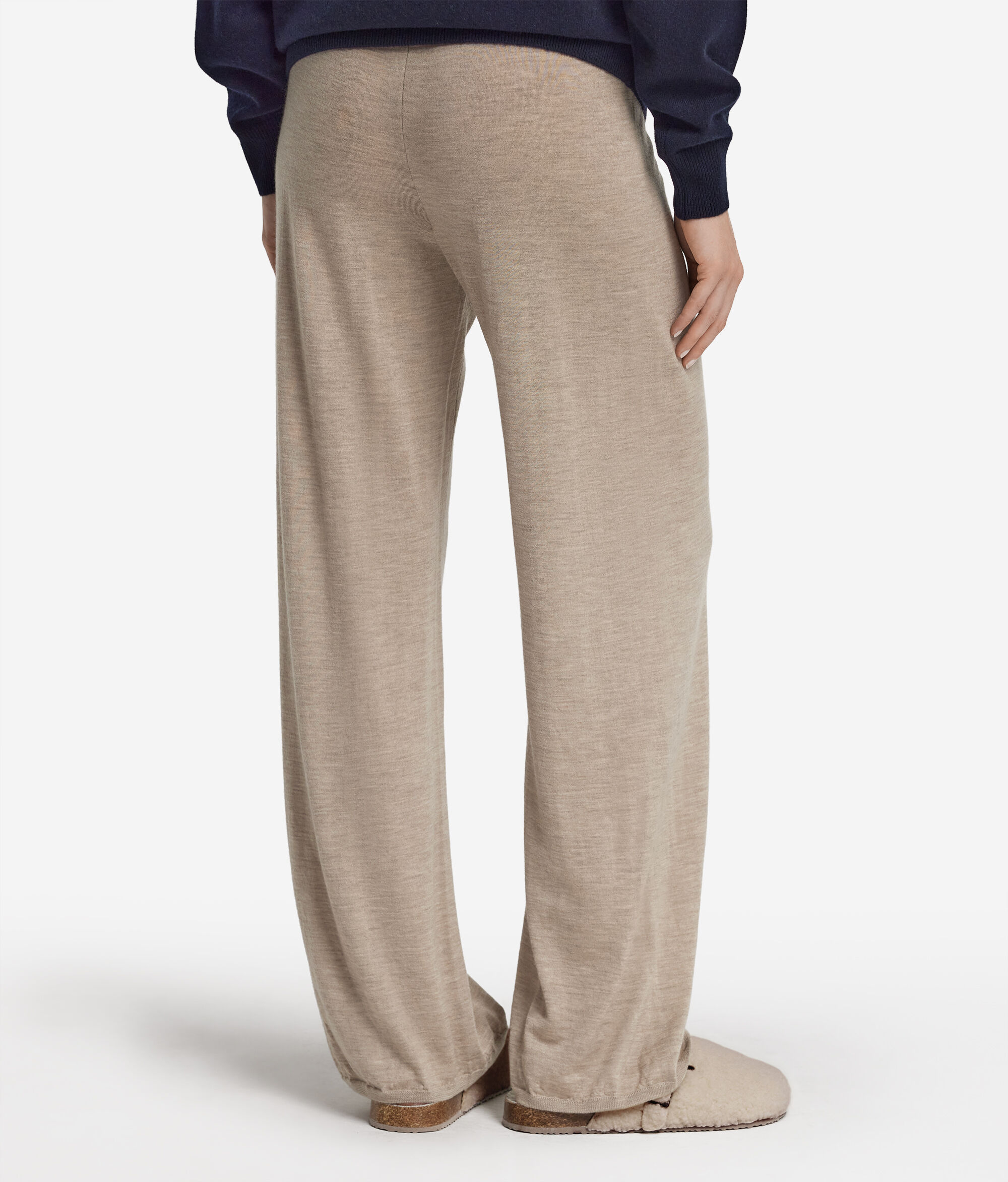 ウルトラファインカシミヤ素材を使用したパラッツォモデルのパンツ。ウエストに伸縮性のバンドをあしらいました。カシミヤ素材特有の柔らかさを生かしたソフトなフィット感のアイテムです。