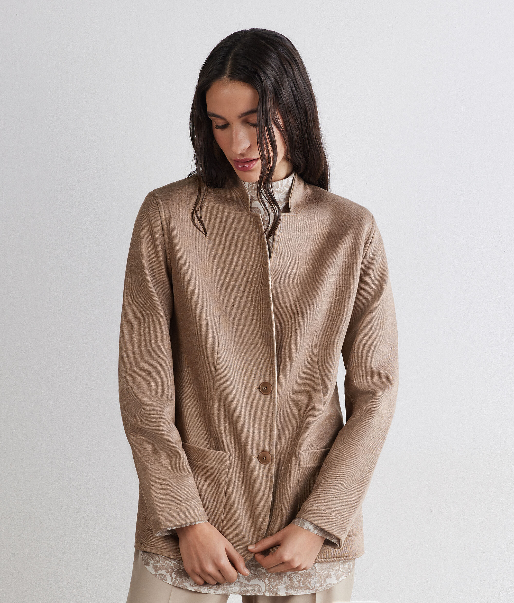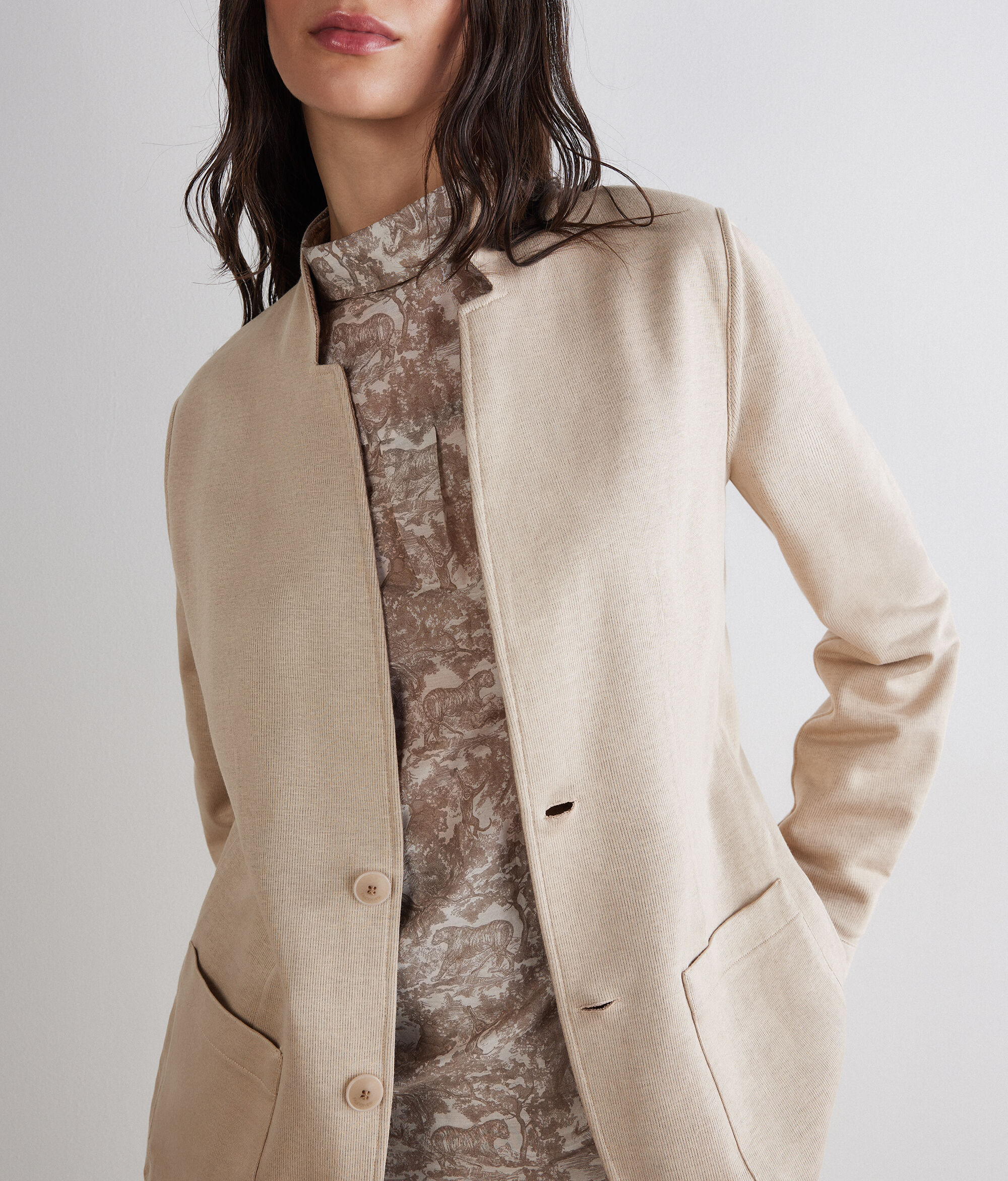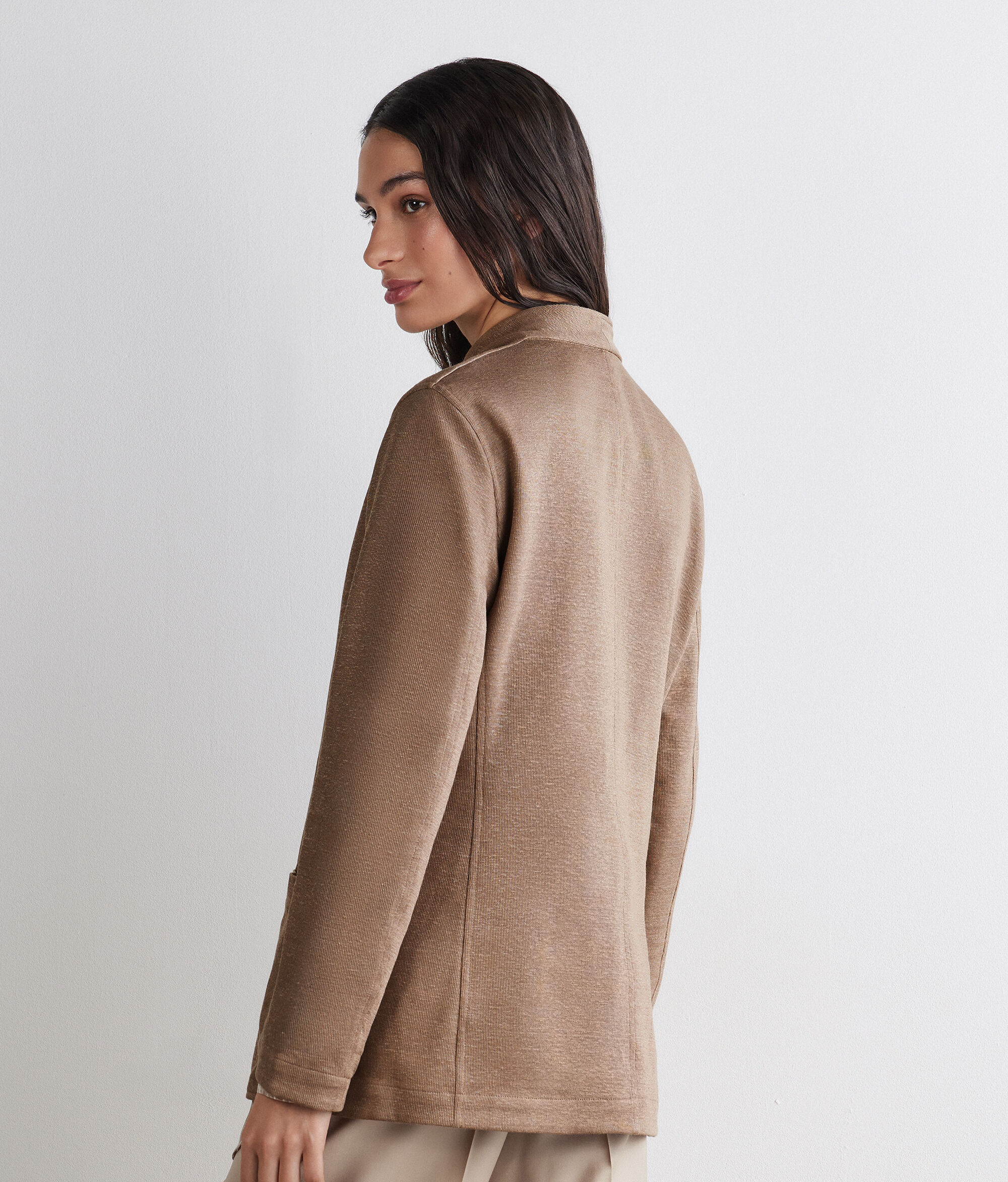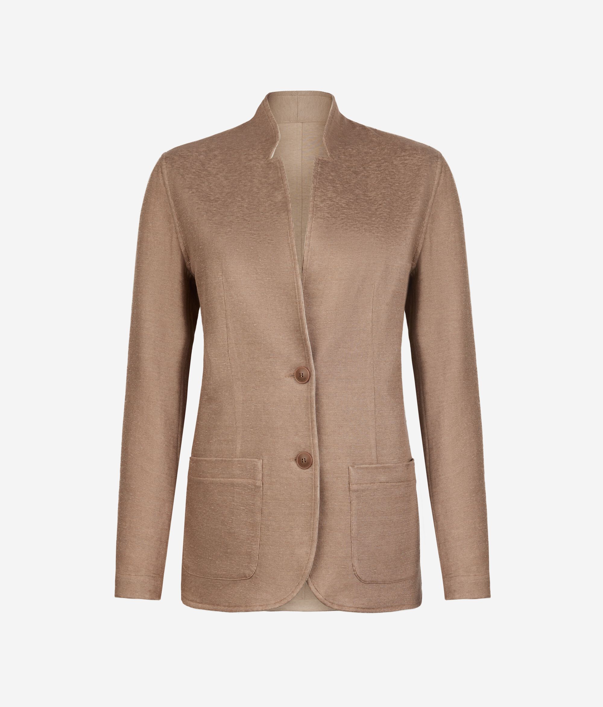 2色のリバーシブル仕様で、幅広い着こなしやシーンに対応するフェミニンなジャケット。外側には上質なリネン、内側には柔らかなコットン素材を使用しています。ラペルカラーとシングルブレストのデザインが、すっきりとしたラインを演出。両面にパッチポケットを備えています。シルエットをスタイリッシュに整えるスリムフィットのモデルです。