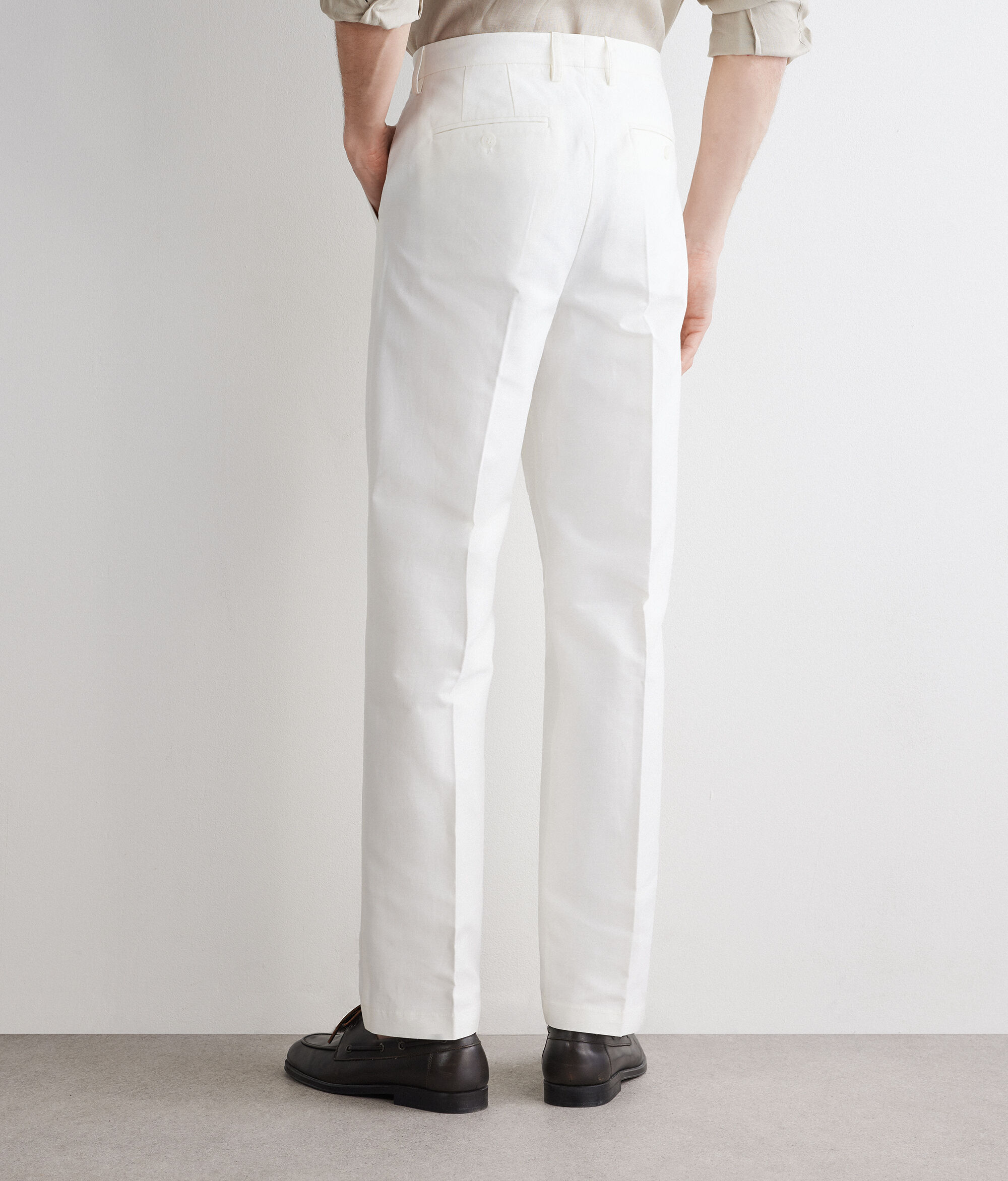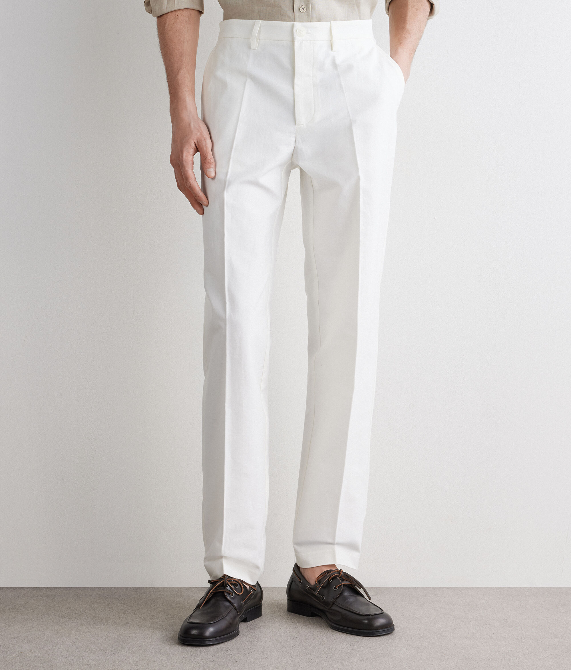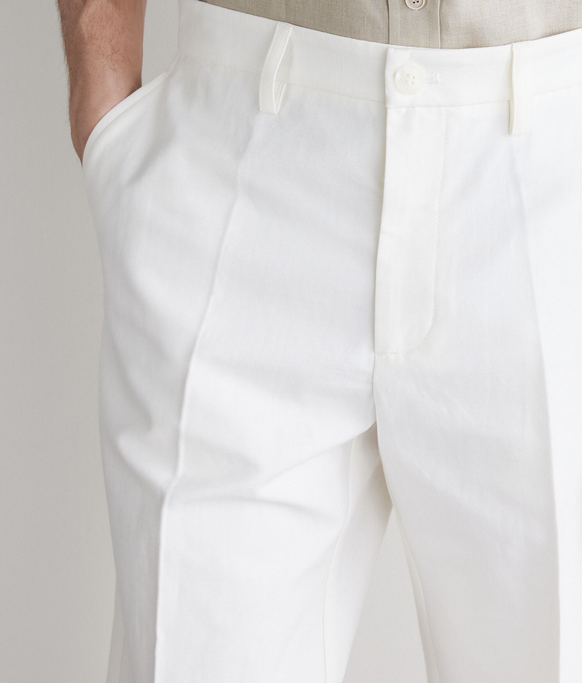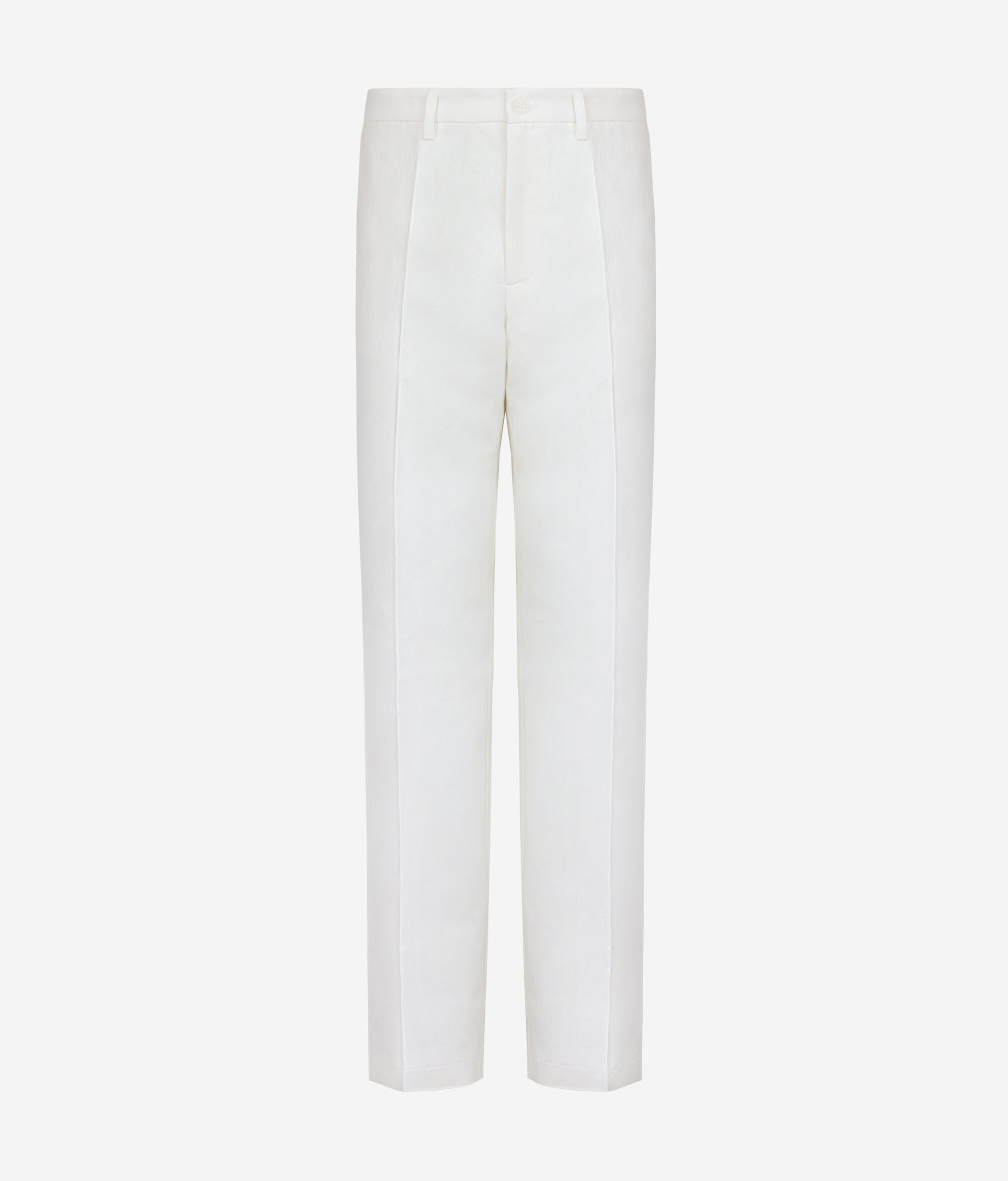 Pantalon en coton et lin avec coupe à jambes larges. Ce modèle est doté d'une taille à passants, d'une fermeture éclair à bouton et de plis marqués sur le milieu des jambes pour une touche élégante.