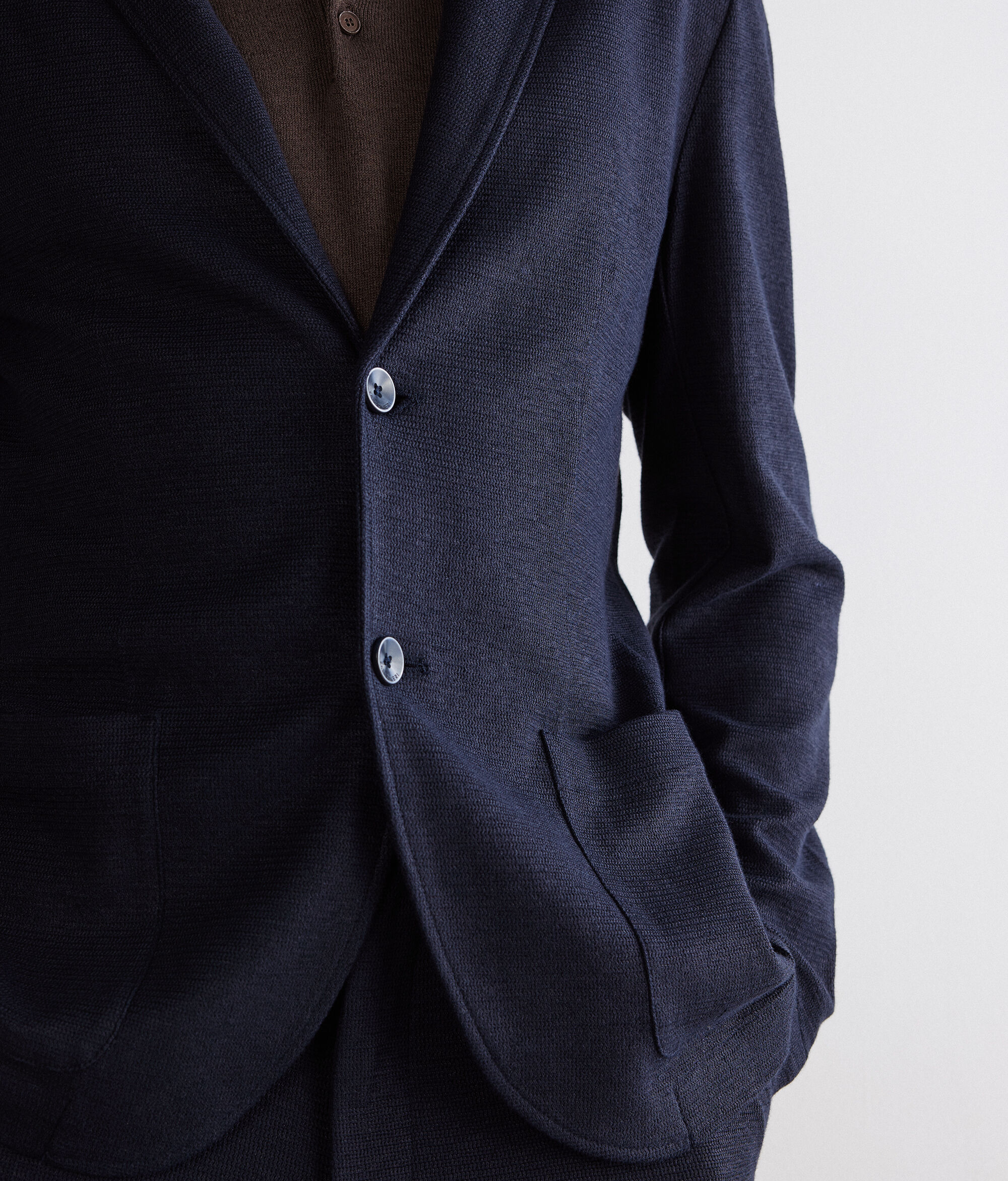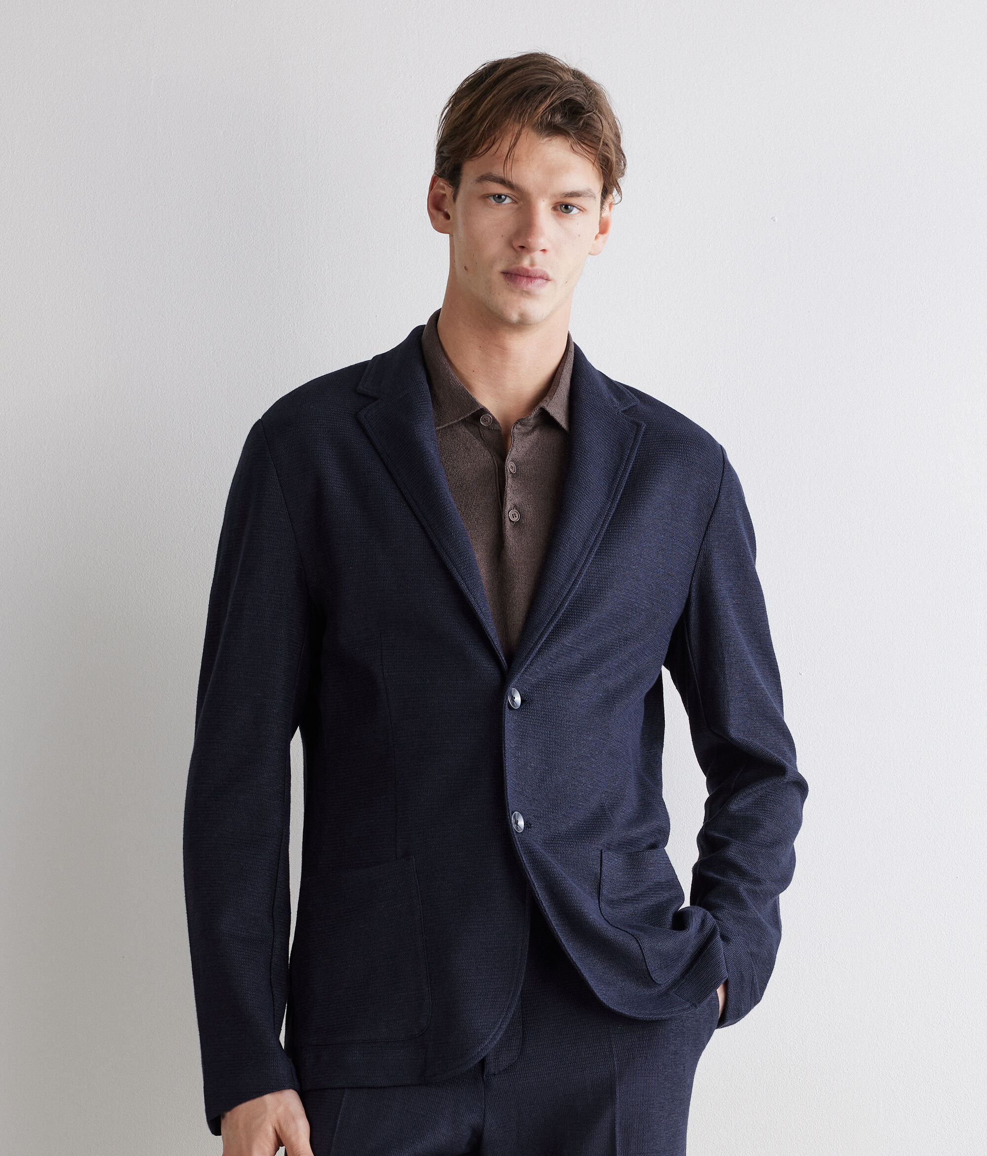Confectionnée dans un mélange de lin et de coton gaufré de haute qualité, cette veste associe texture raffinée et design moderne. Ses revers classiques et sa fermeture à deux boutons droite lui confèrent une élégance intemporelle, tandis que les poches plaquées et la fente centrale au dos complètent ce modèle à coupe standard, parfait pour un look chic et soigné.