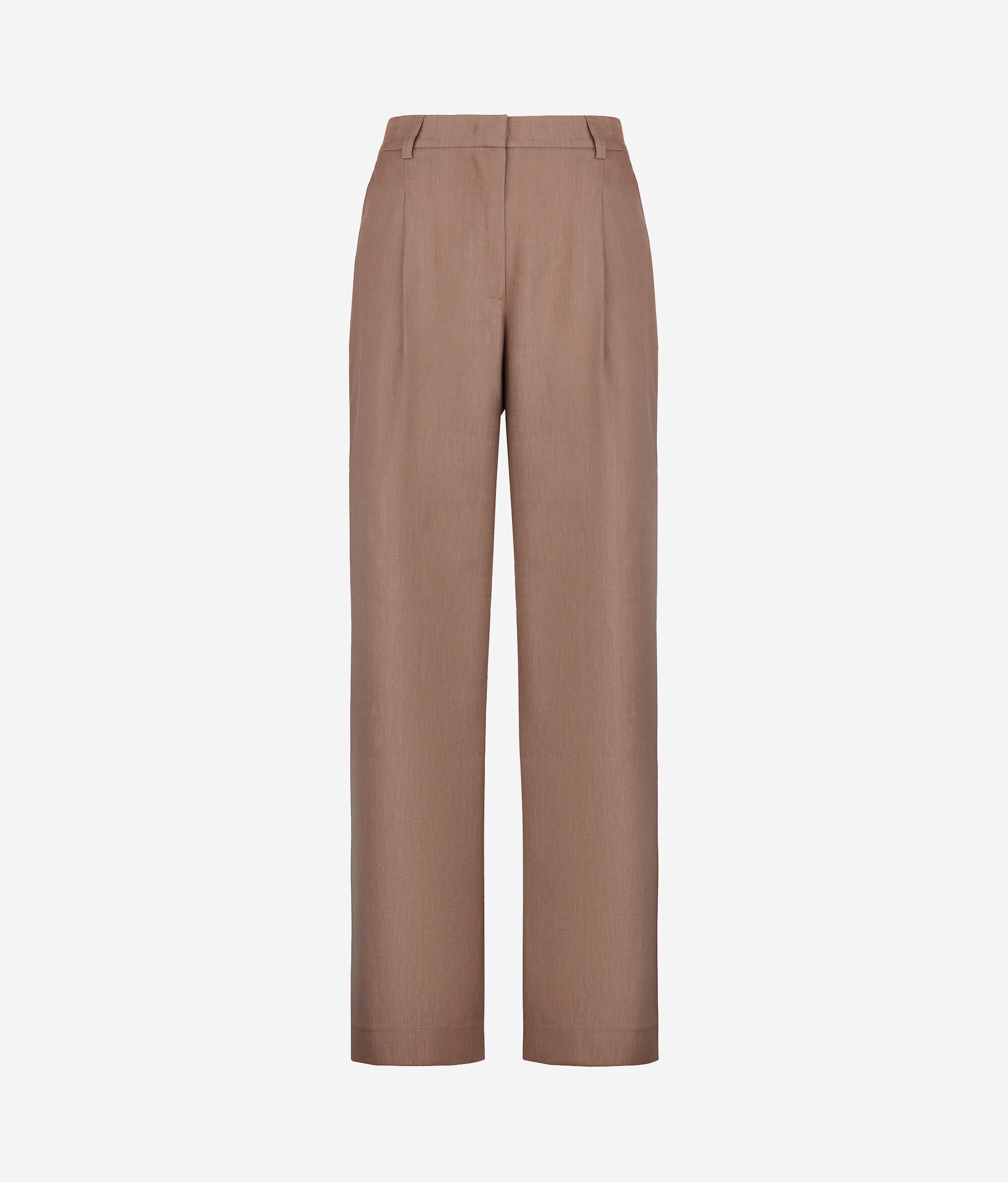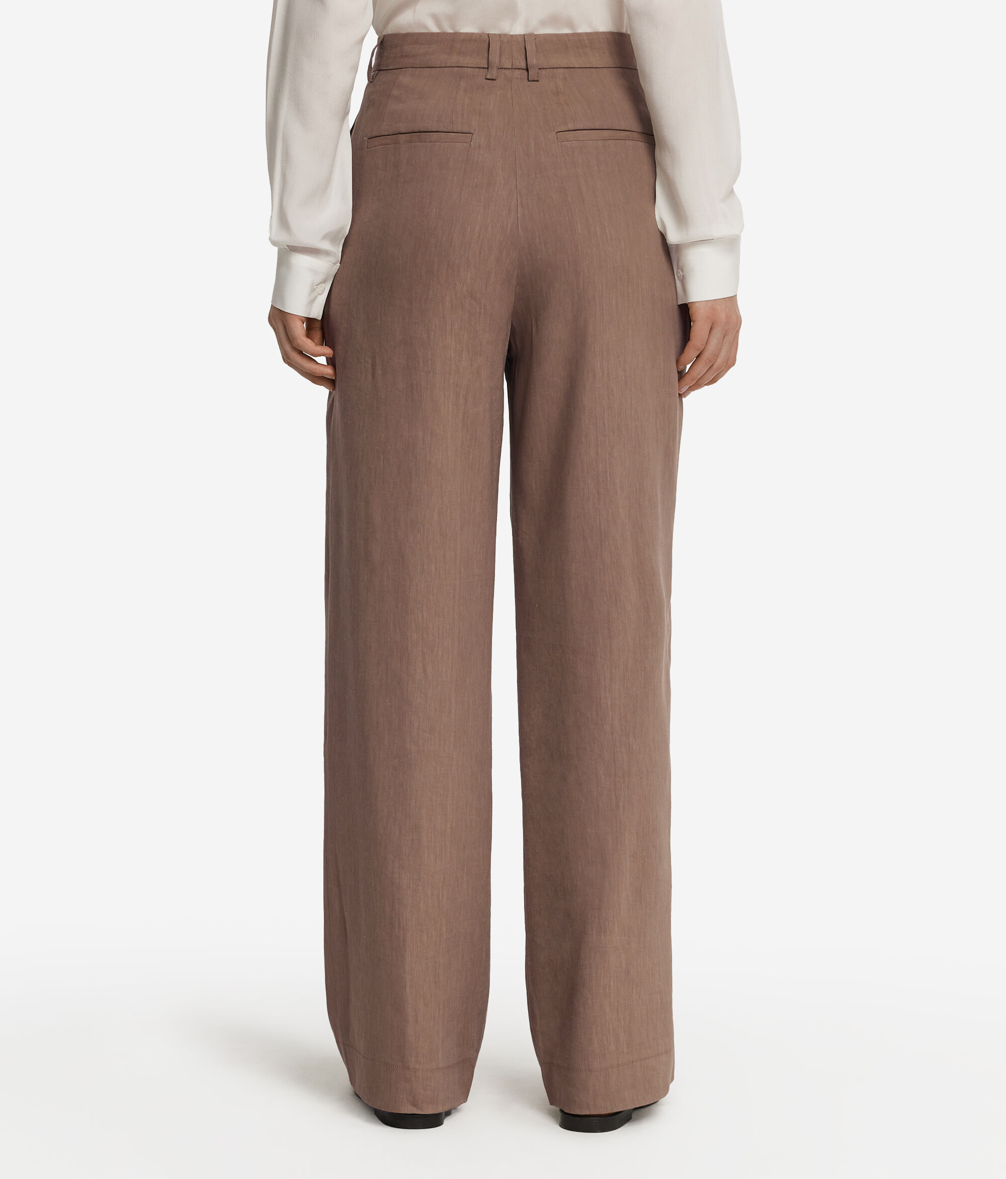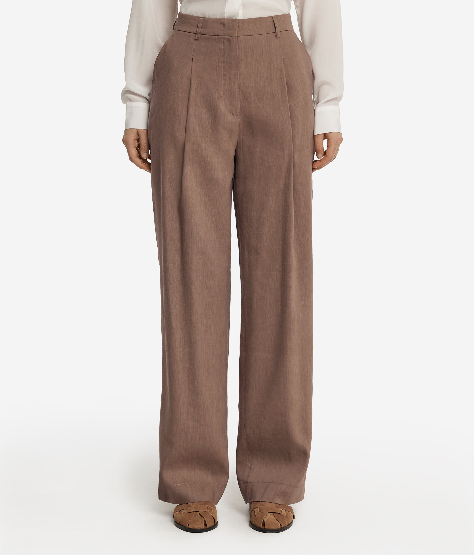 A cool mix of linen and viscose enhances the relaxed silhouette of these wide-leg trousers. The casual volumes are embellished by soft pleats that run the full length of the garment, adding a contemporary touch. The large side pockets and the belted waist complete the unique and timeless design.