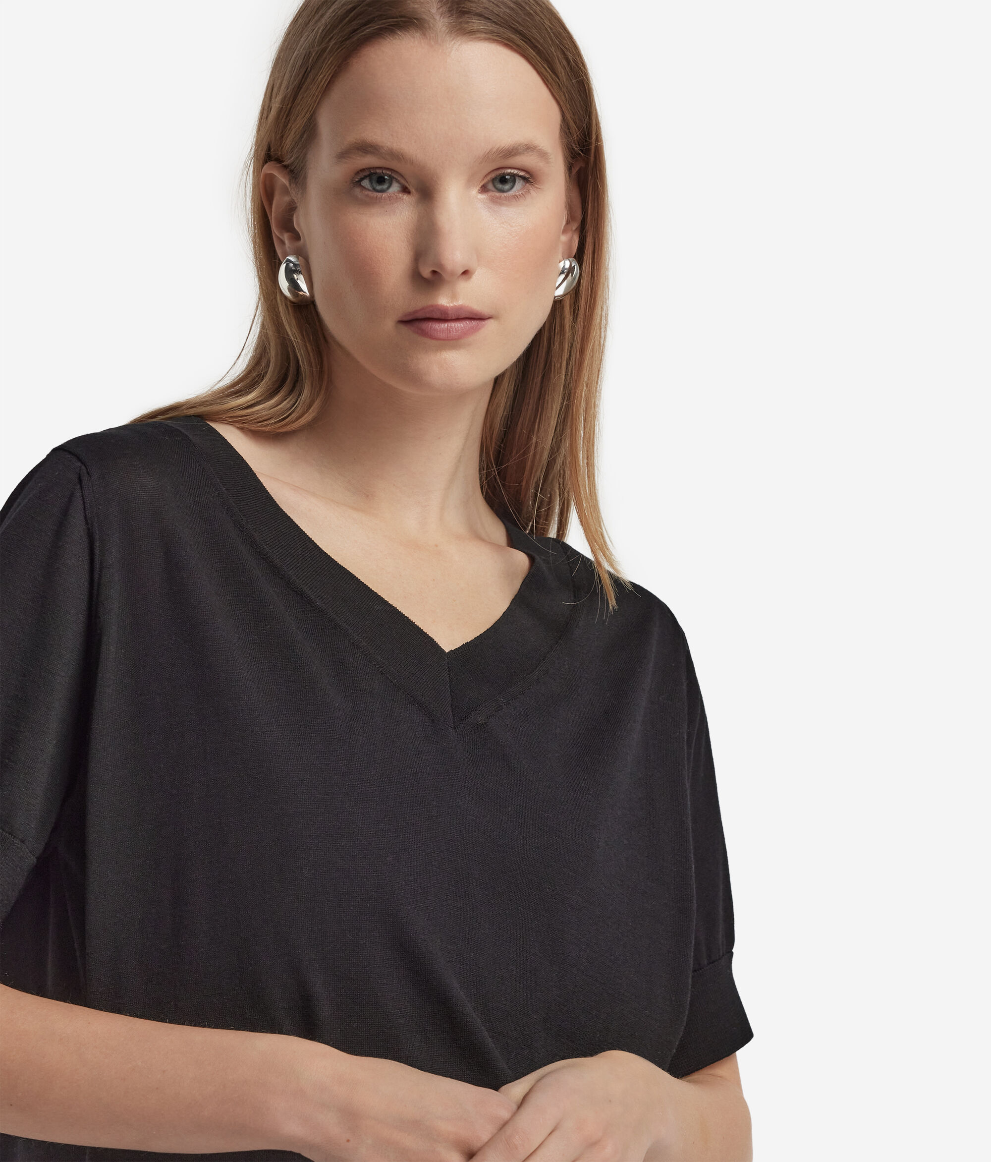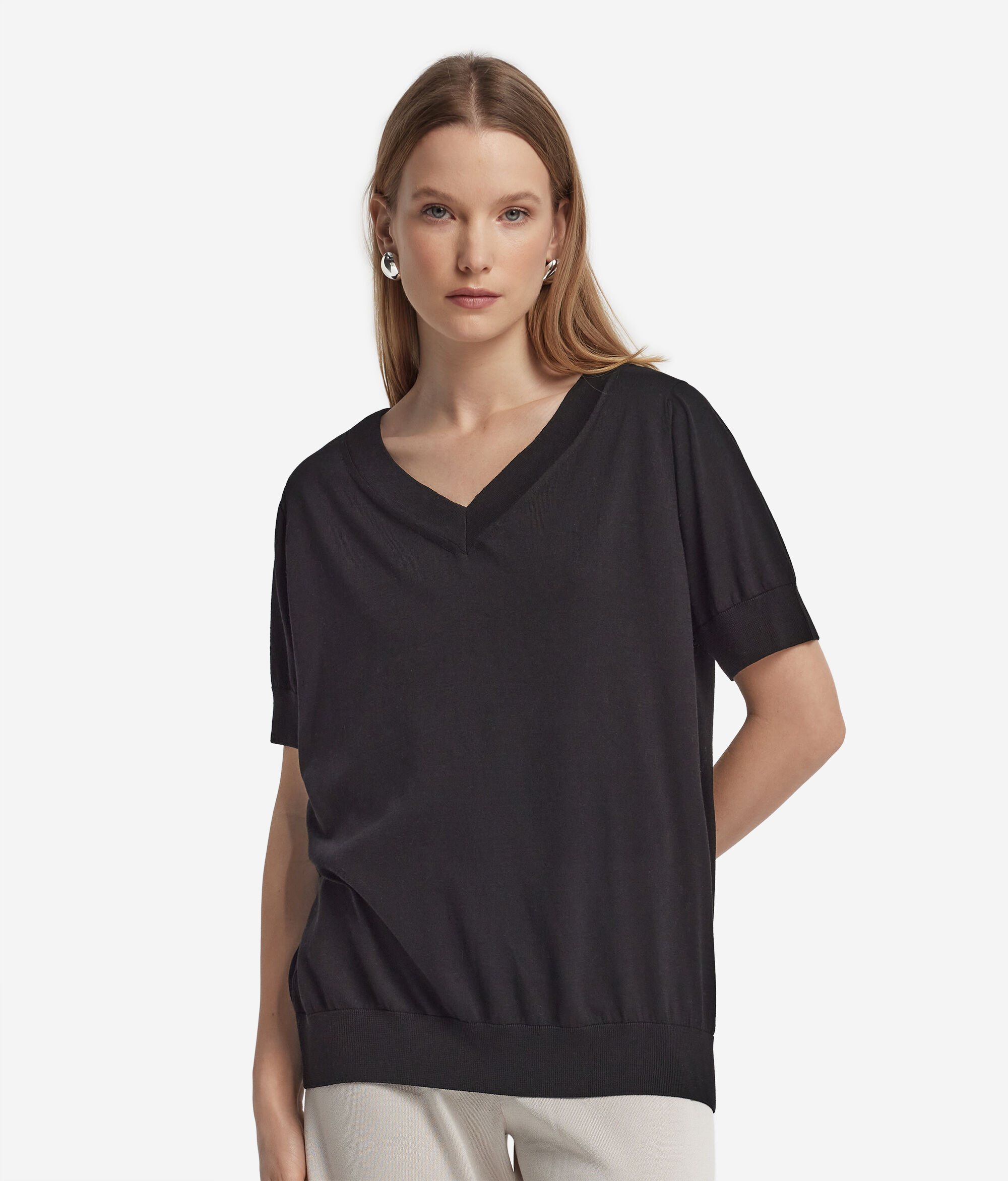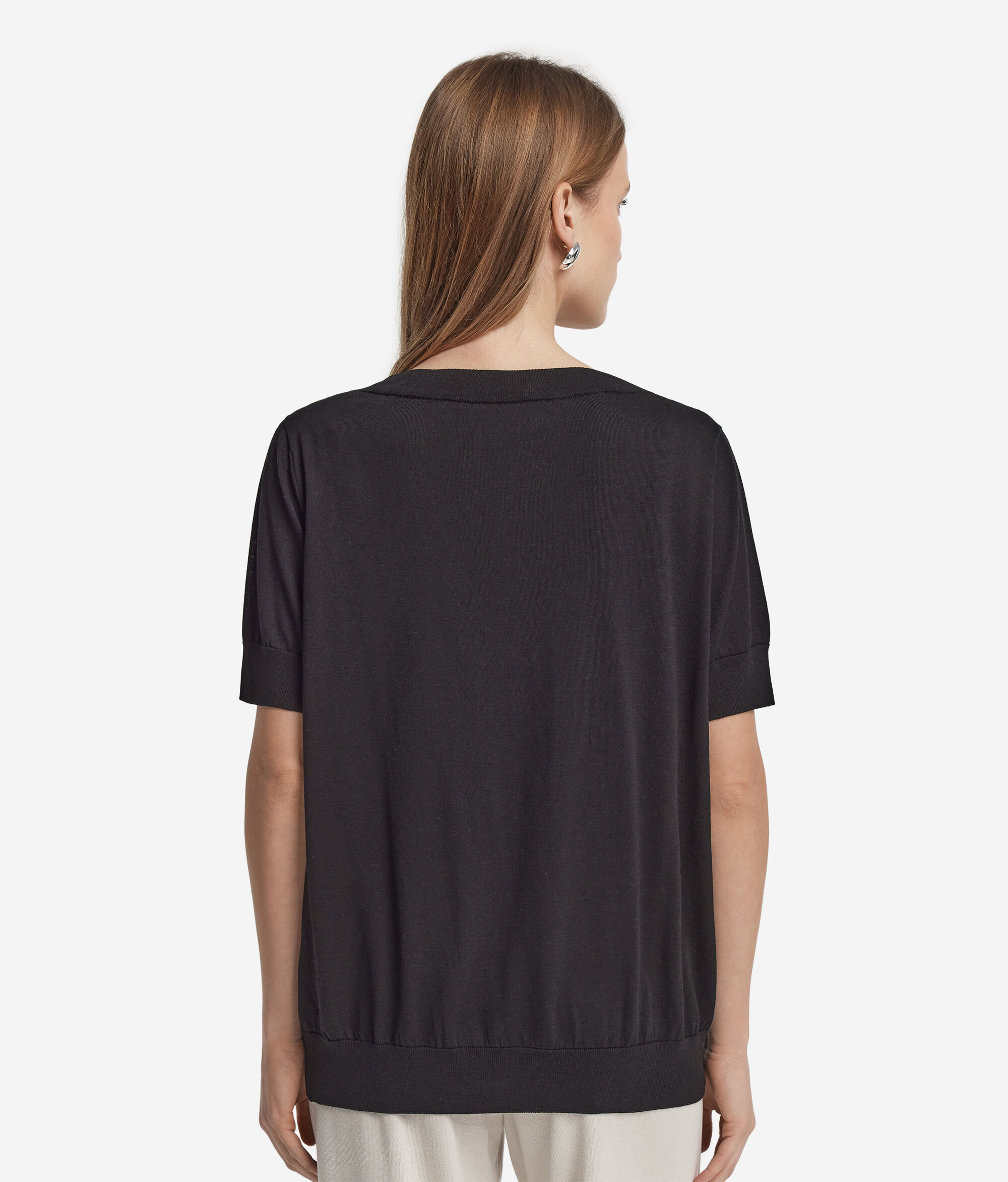 Short-Sleeved V-Neck Silk and Cotton Jumper