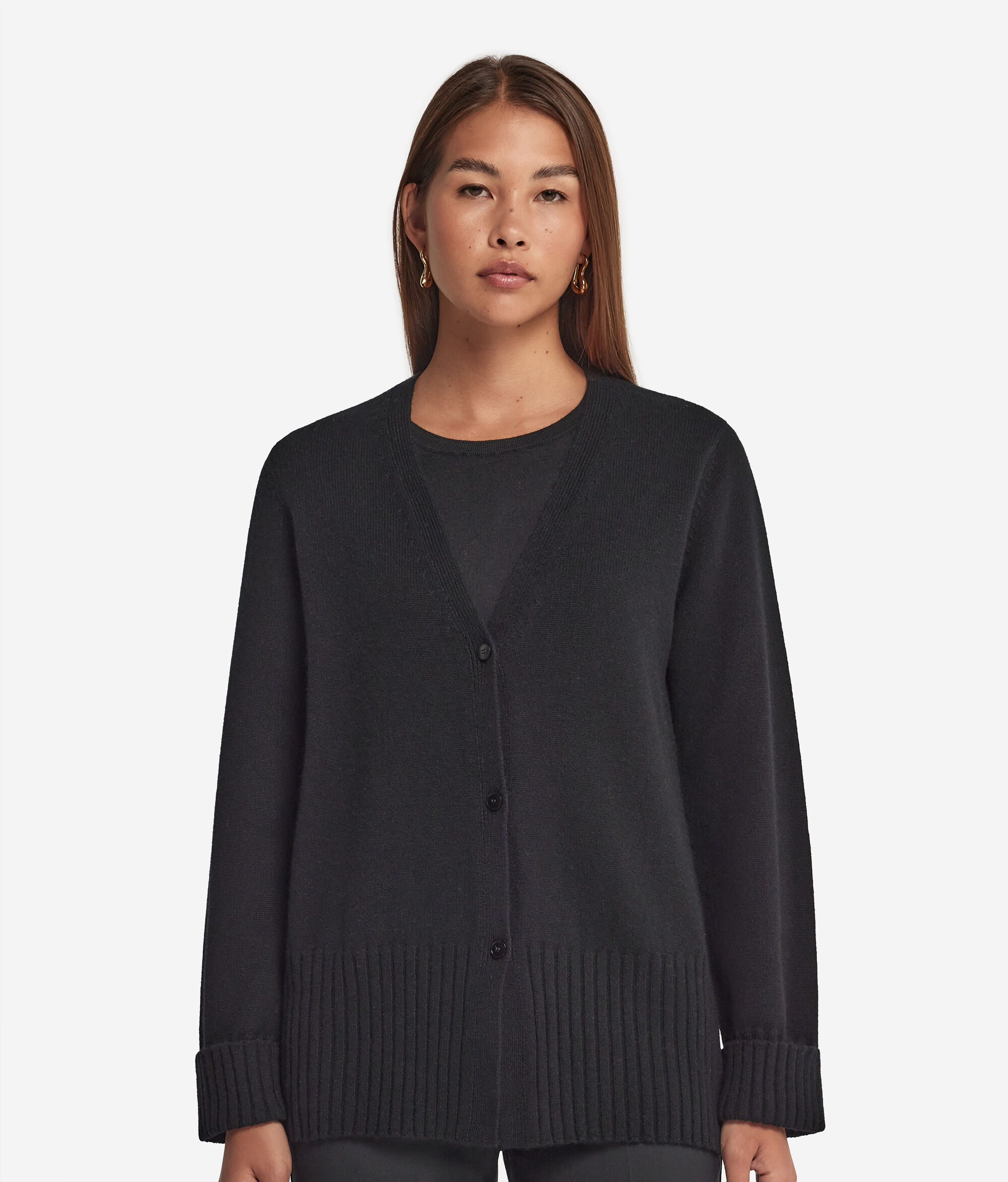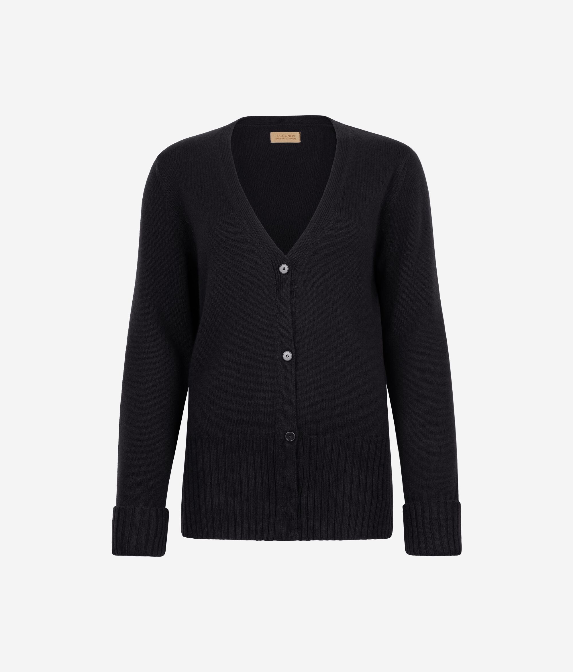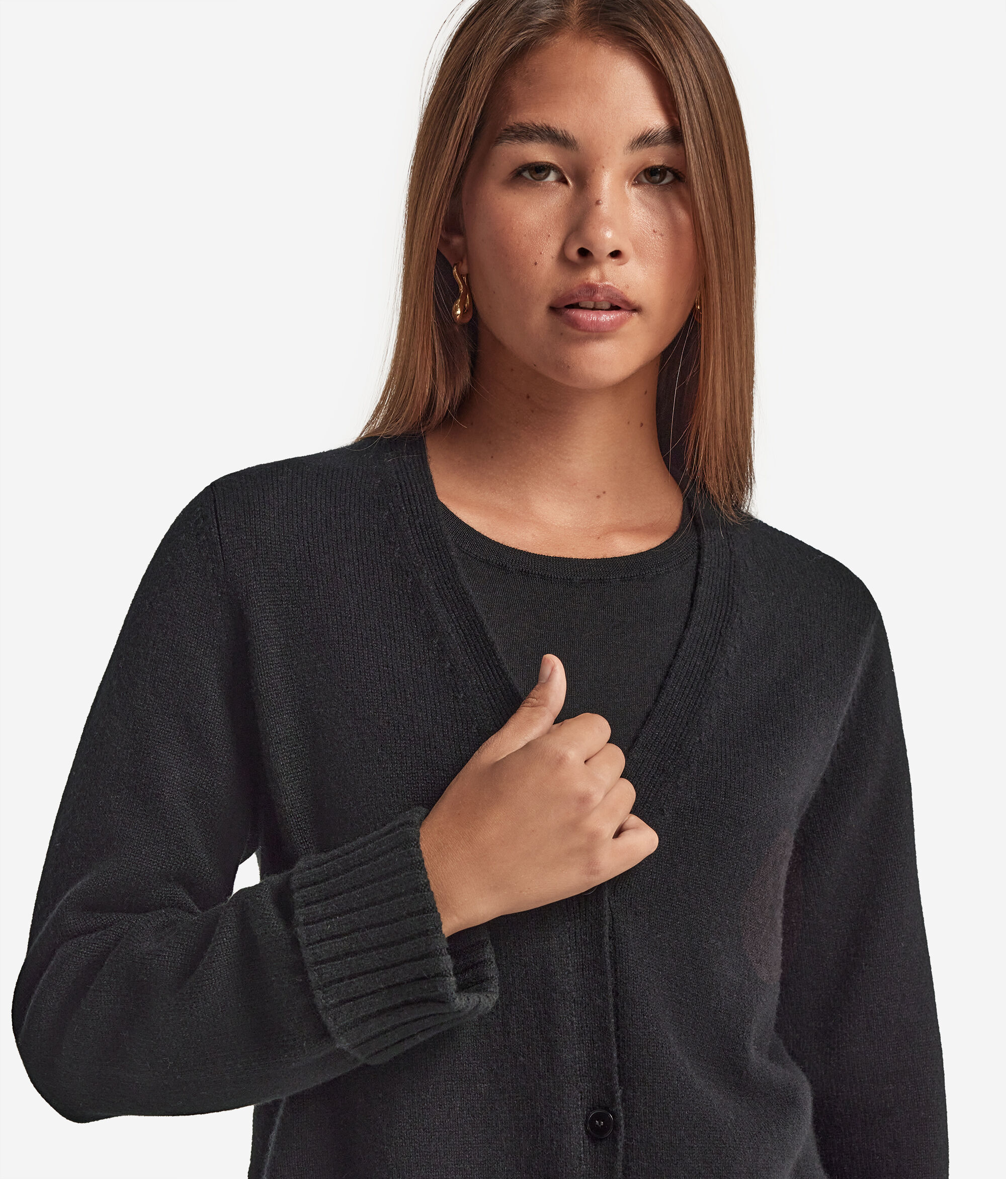 Luxurious Ultrasoft cashmere has been elegantly crafted into a soft V-neck cardigan with character. The front fastening with three tone-on-tone buttons adds a touch of elegance and sobriety, while the slits at the hem give the design fluidity and movement. Ribbing on the edge and reversed cuffs enriches the garment and gives it a refined and tidy appearance.