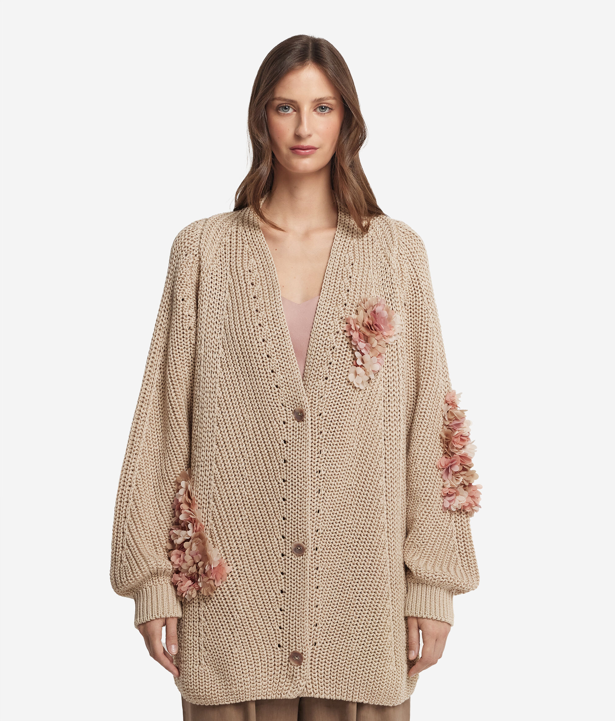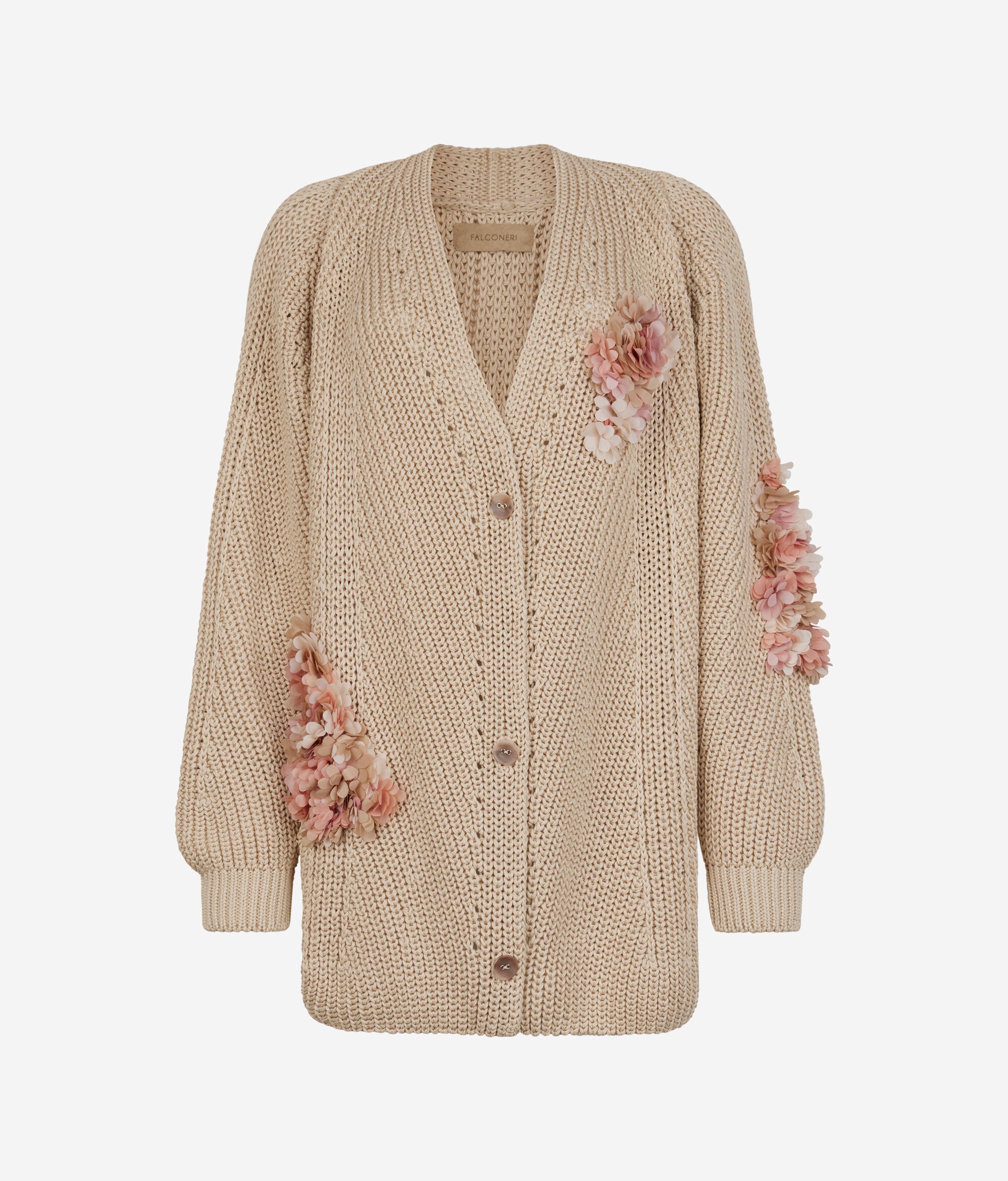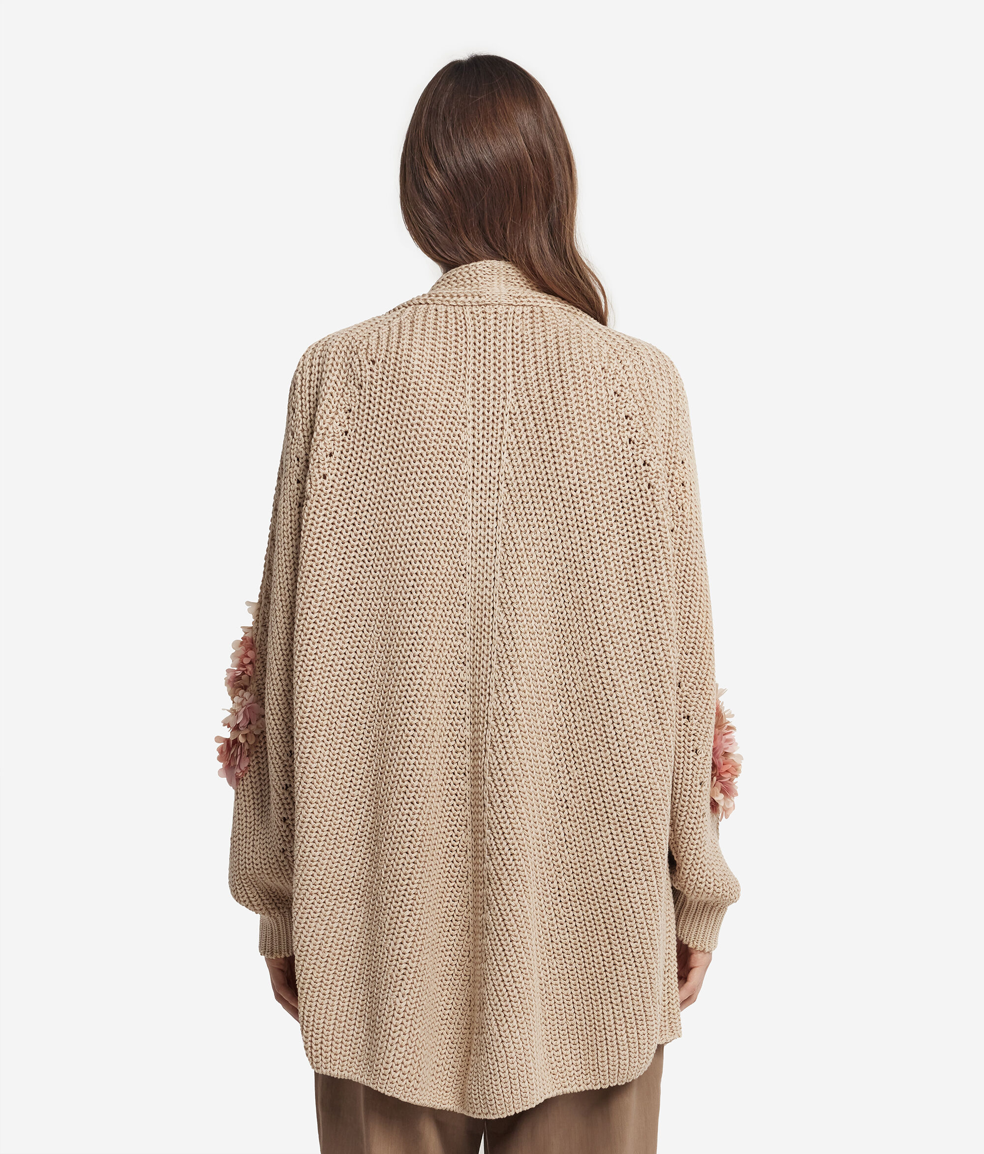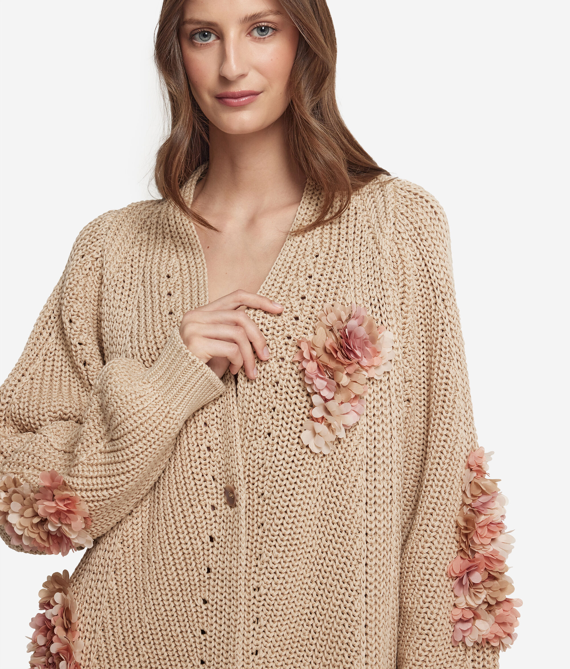 Ten kardigan wykonany z miękkiej bawełny łączy w sobie elegancję i wyrafinowanie. Szalowy dekolt w serek dodaje dyskretnej elegancji, a rękawy typu raglan gwarantują wygodne, luźne dopasowanie. Prążkowane i ażurowe ściegi tworzą wyjątkową fakturę, która dodaje głębi projektowi ubrania. Prążkowane wykończenie dołu tworzy delikatny efekt wykończenia, a kwiatowe naszywki na dekolcie i rękawach dodają odrobinę kobiecości i oryginalności.