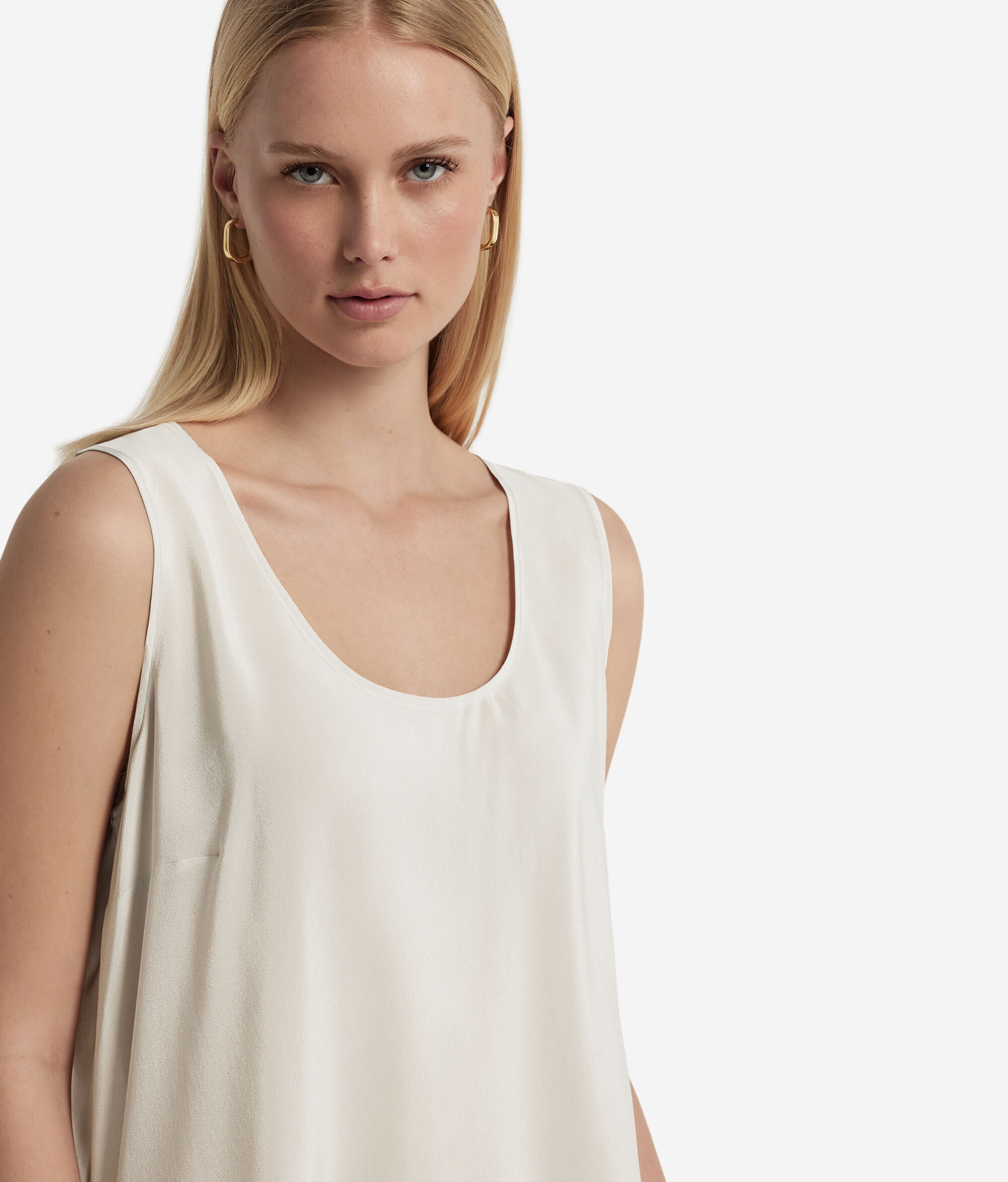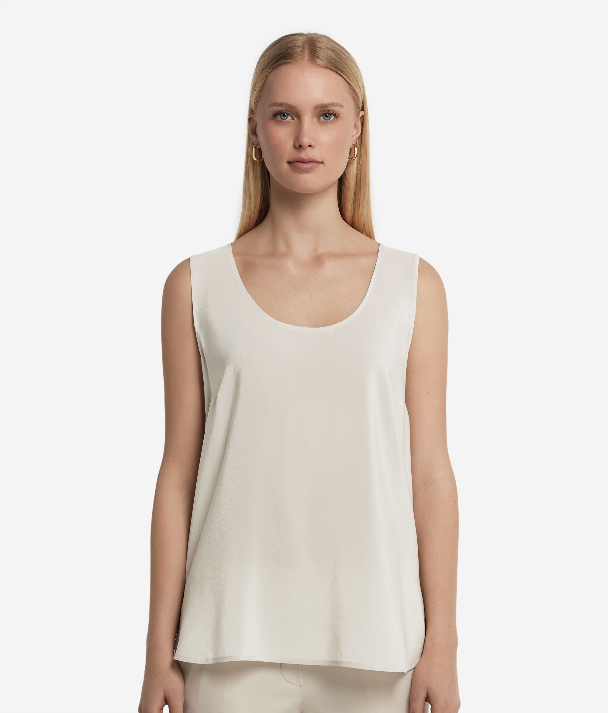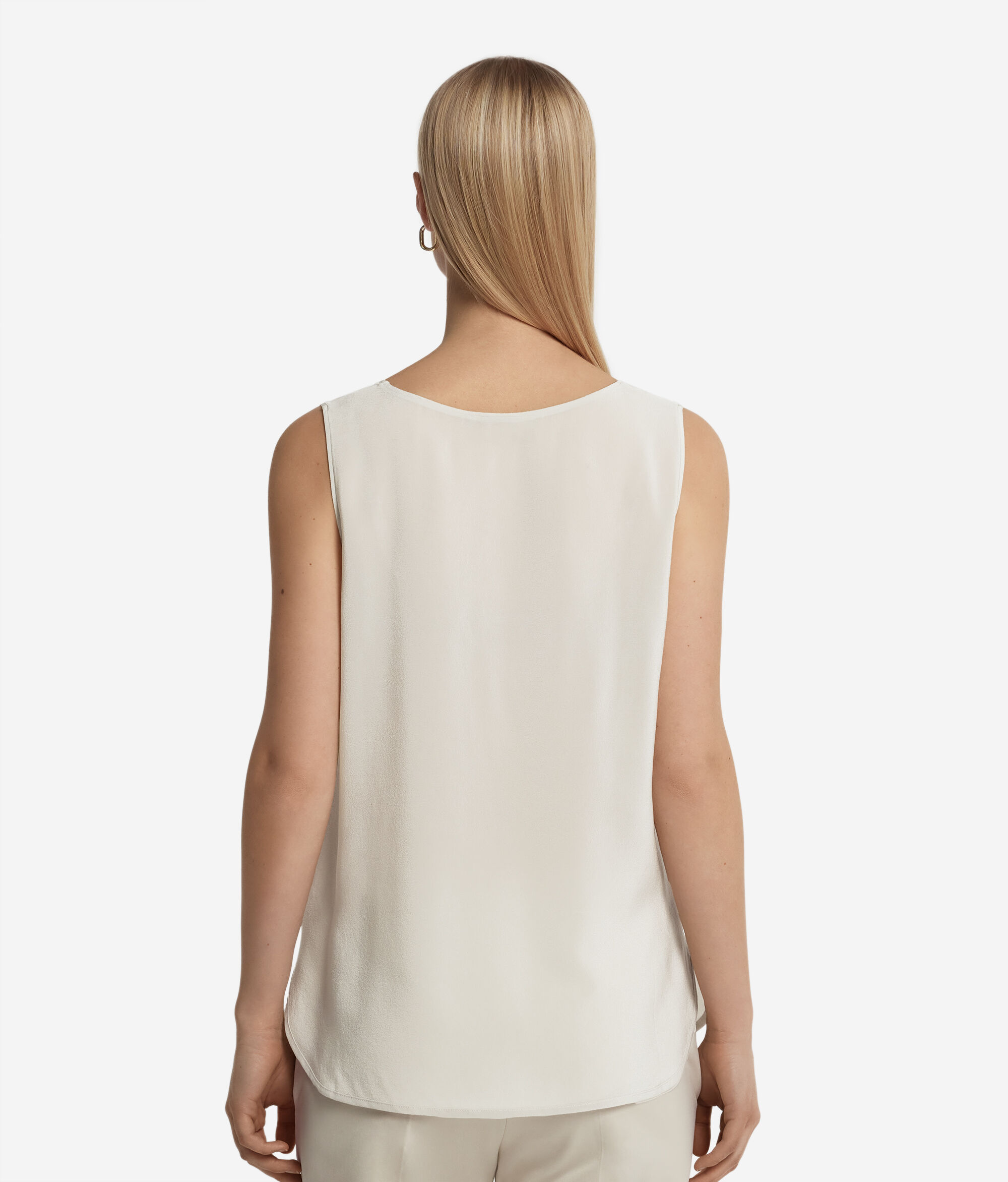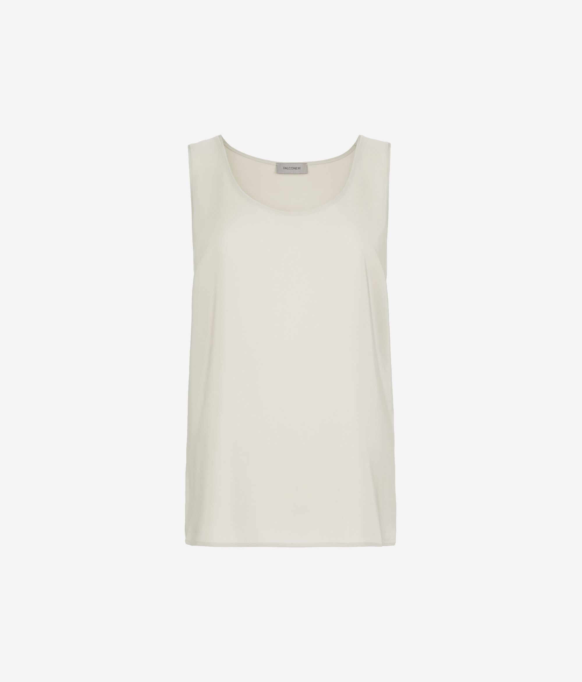 Nowa propozycja Falconeri dla miłośniczek wyrafinowanych stylizacji i stylowych detali: podkoszulek z dużym dekoltem w całości wykonany ze zwiewnego jedwabiu, który podkreśla jego luźny fason.