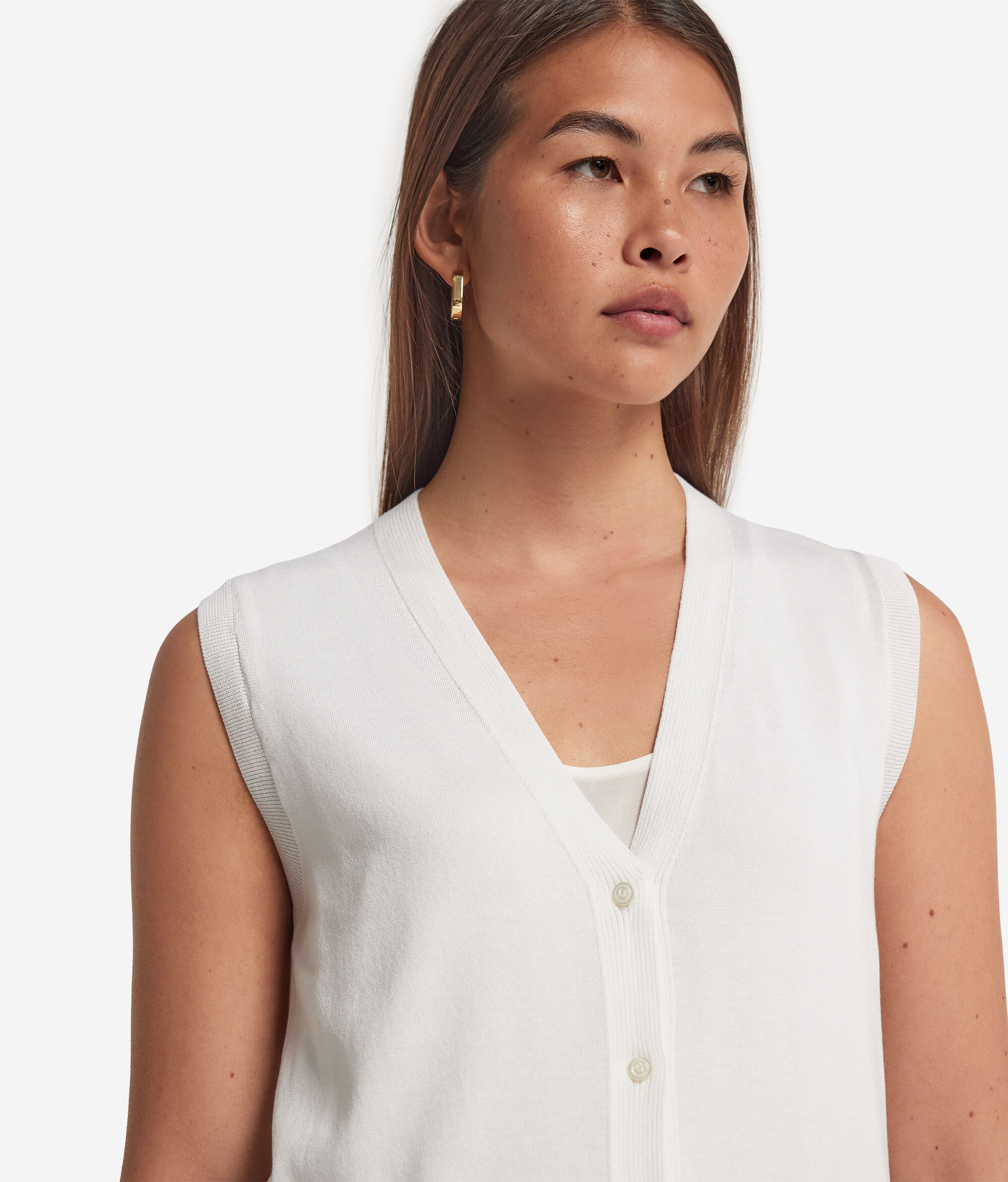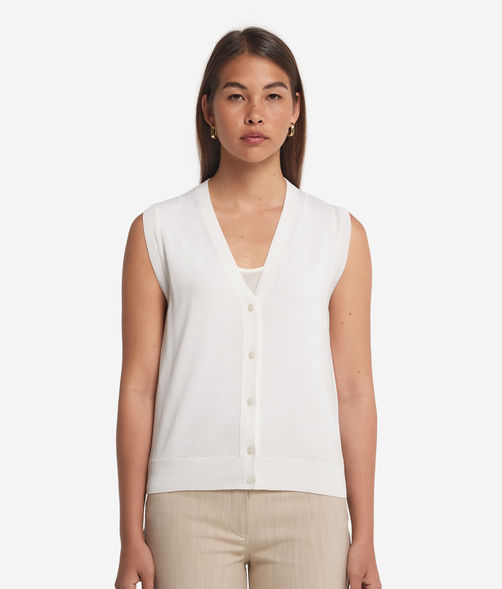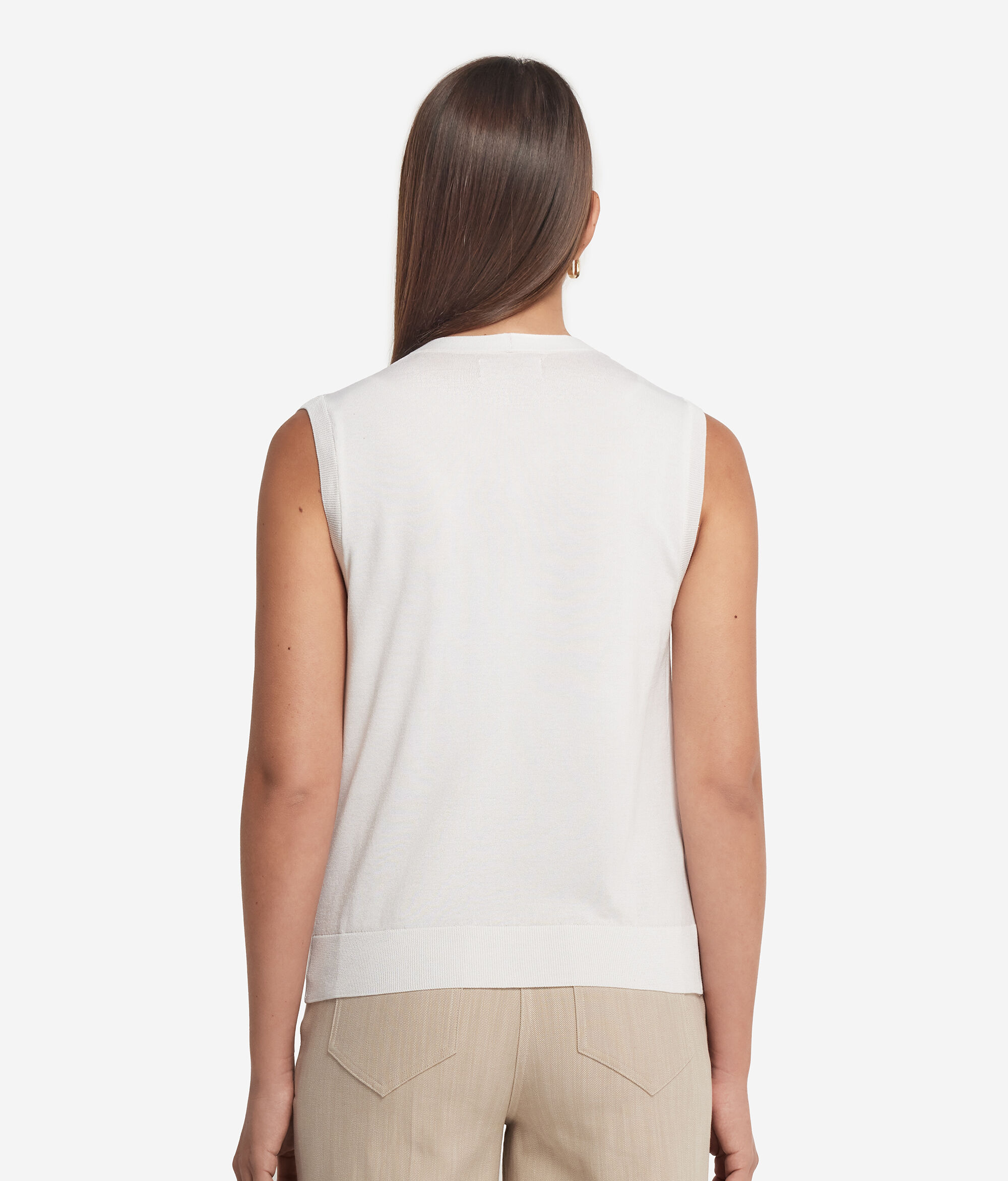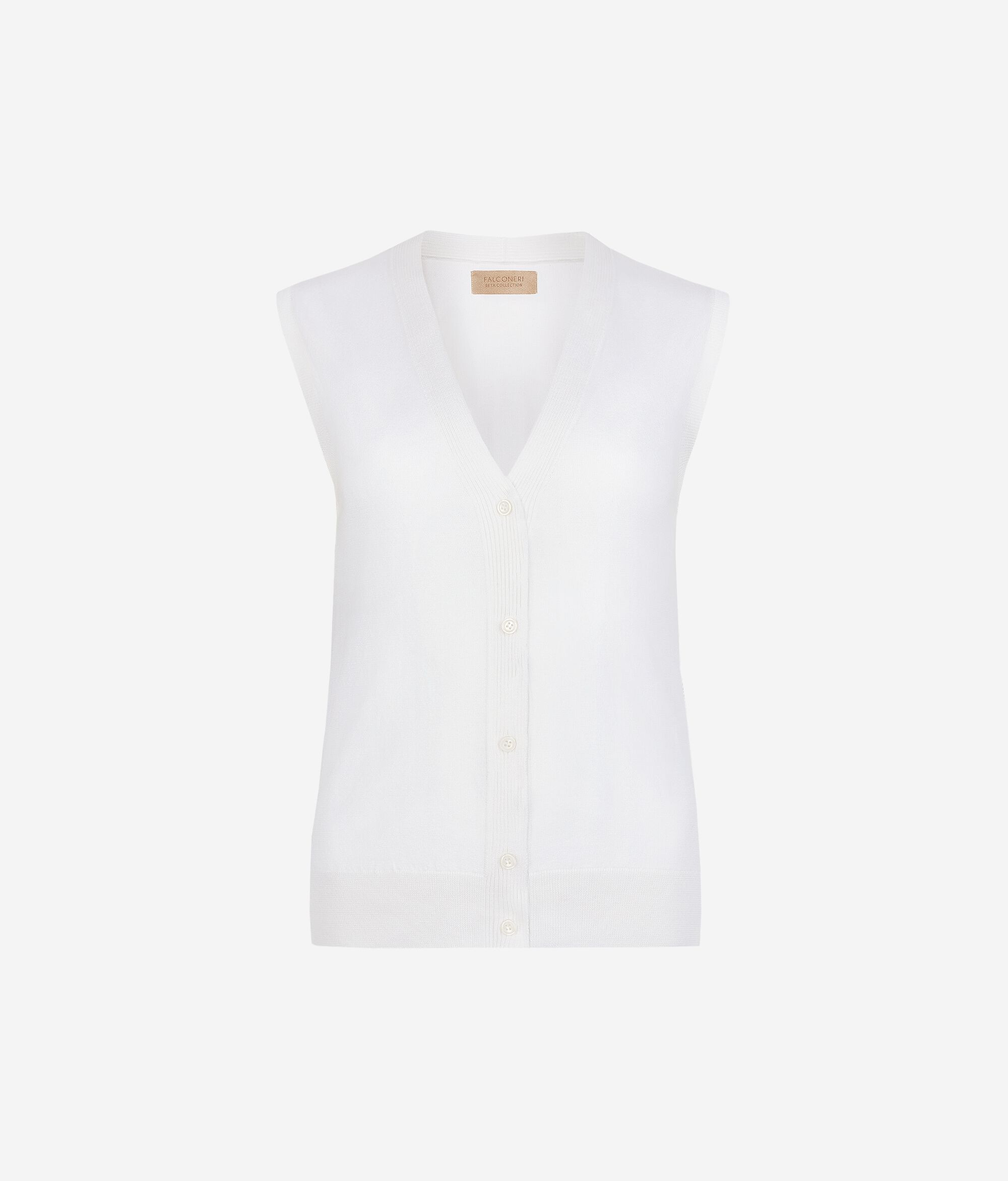 Ta jedwabno-bawełniana kamizelka z klasycznym dekoltem w szpic i zapięciem na pięć guzików doskonale sprawdzi się jako element eleganckiej i wyrafinowanej stylizacji. Prążkowane wykończenia na dekolcie, ramionach i u dołu nadają odrobinę elegancji, podkreślając minimalistyczny, a zarazem wyrafinowany krój.