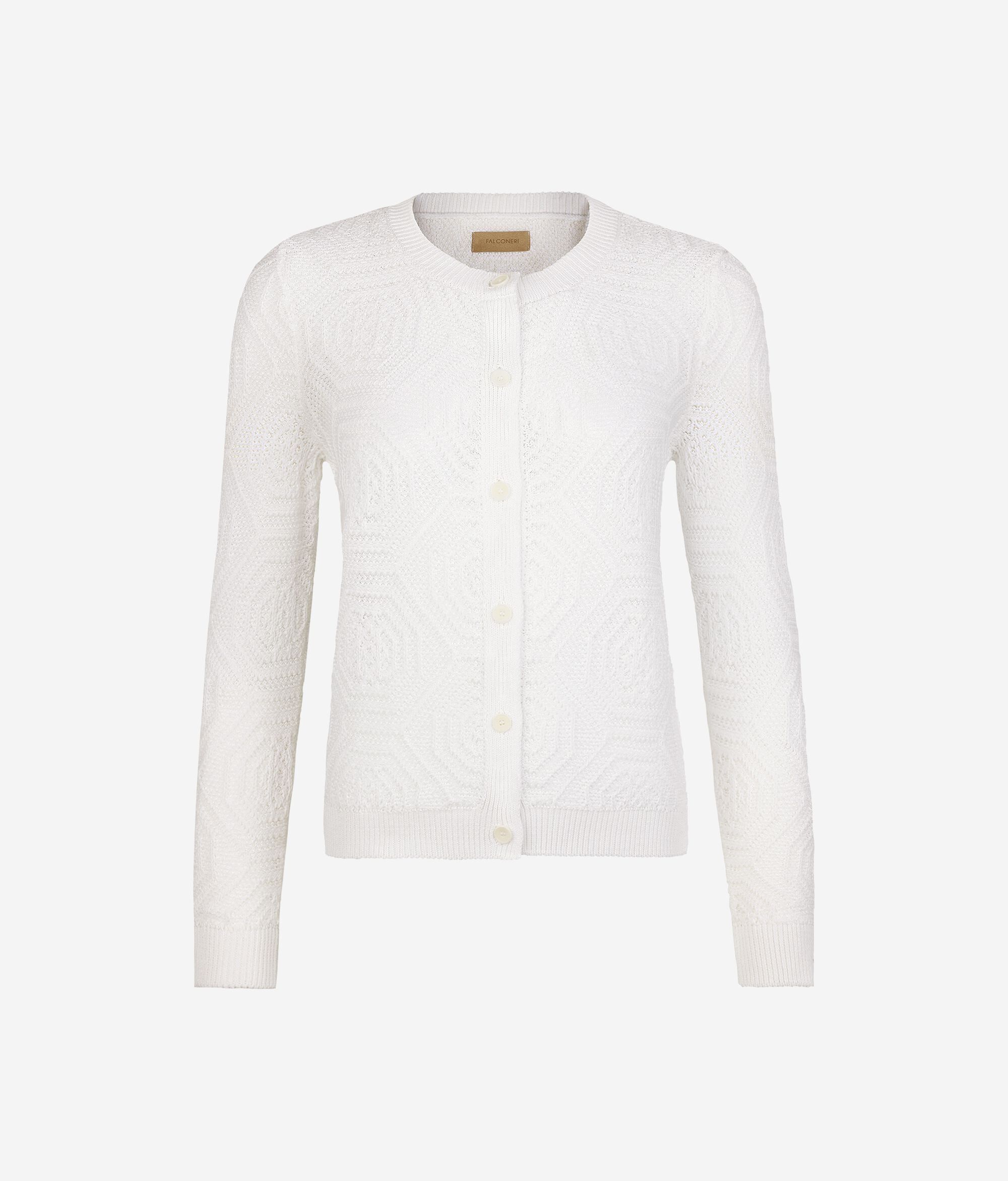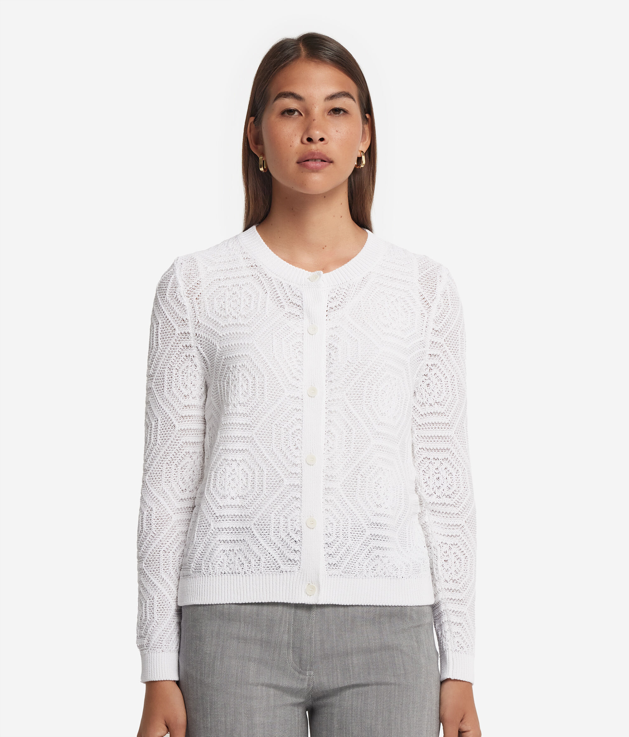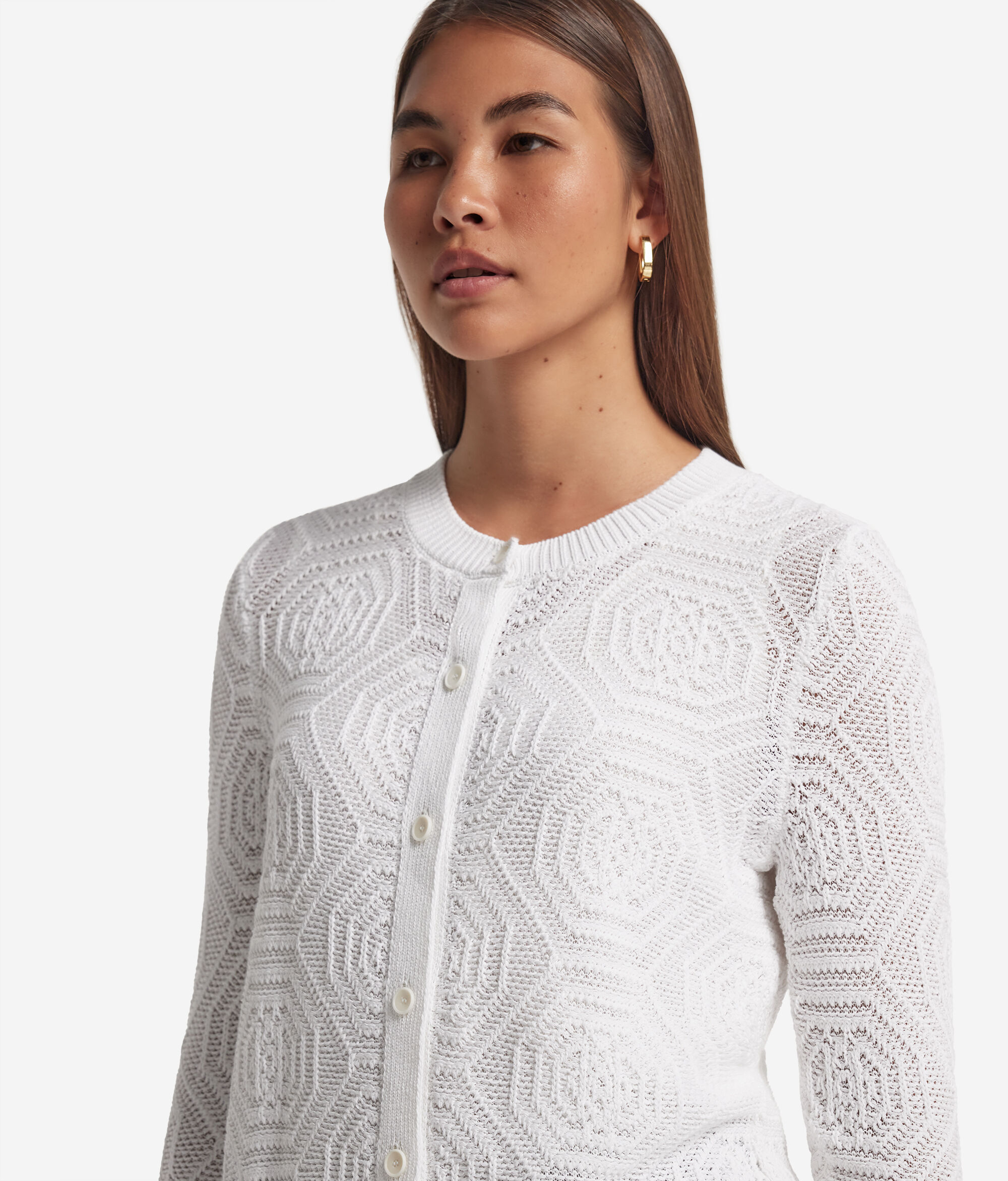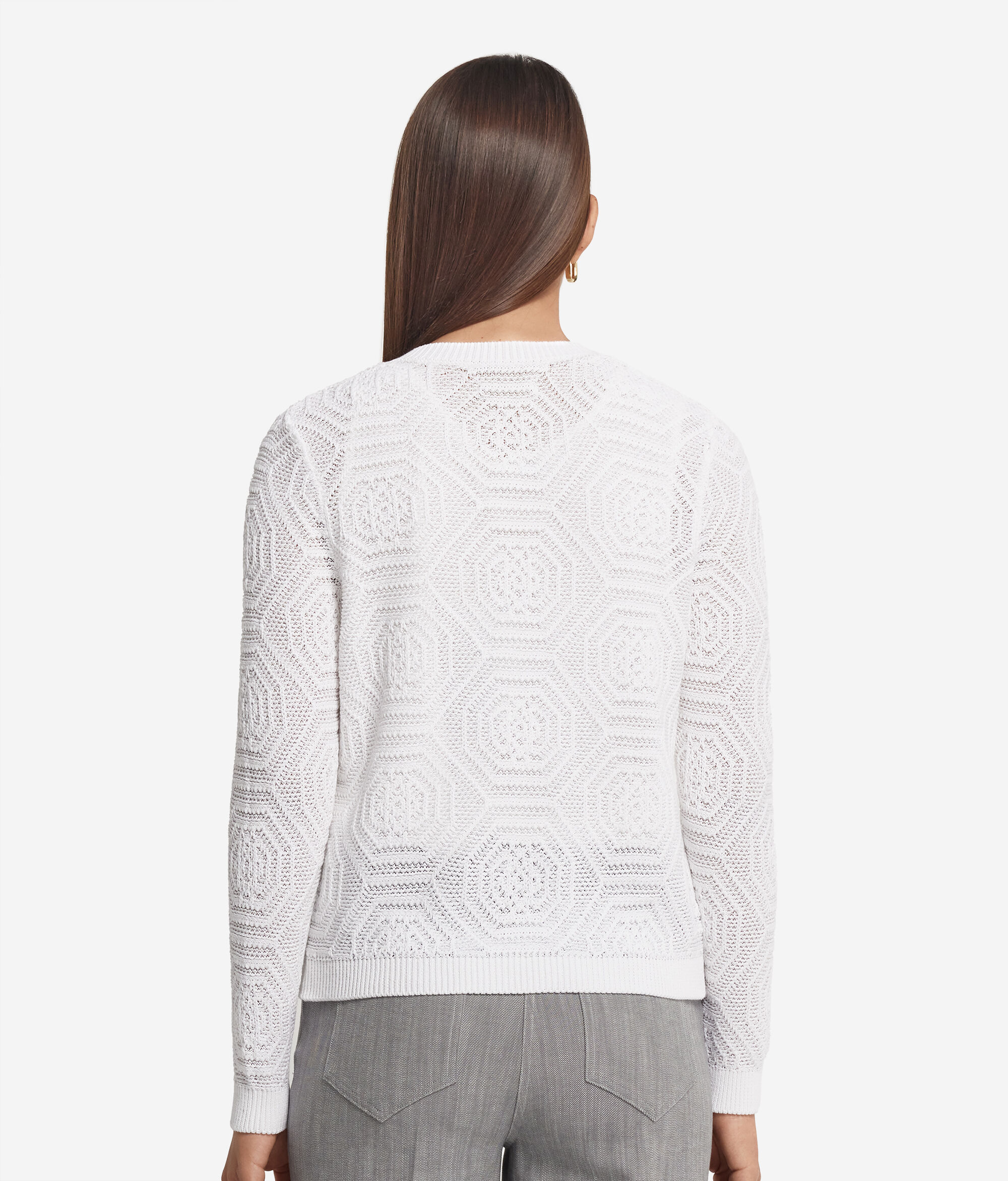 Wyrafinowany i otulający design tego bawełnianego kardiganu został ozdobiony geometrycznym wzorem, który podkreśla jego delikatny styl. Model posiada klasyczny, okrągły dekolt i zapięcie z przodu na sześć guzików; detale te wpływają na jego wszechstronność i ponadczasowy, elegancki styl.