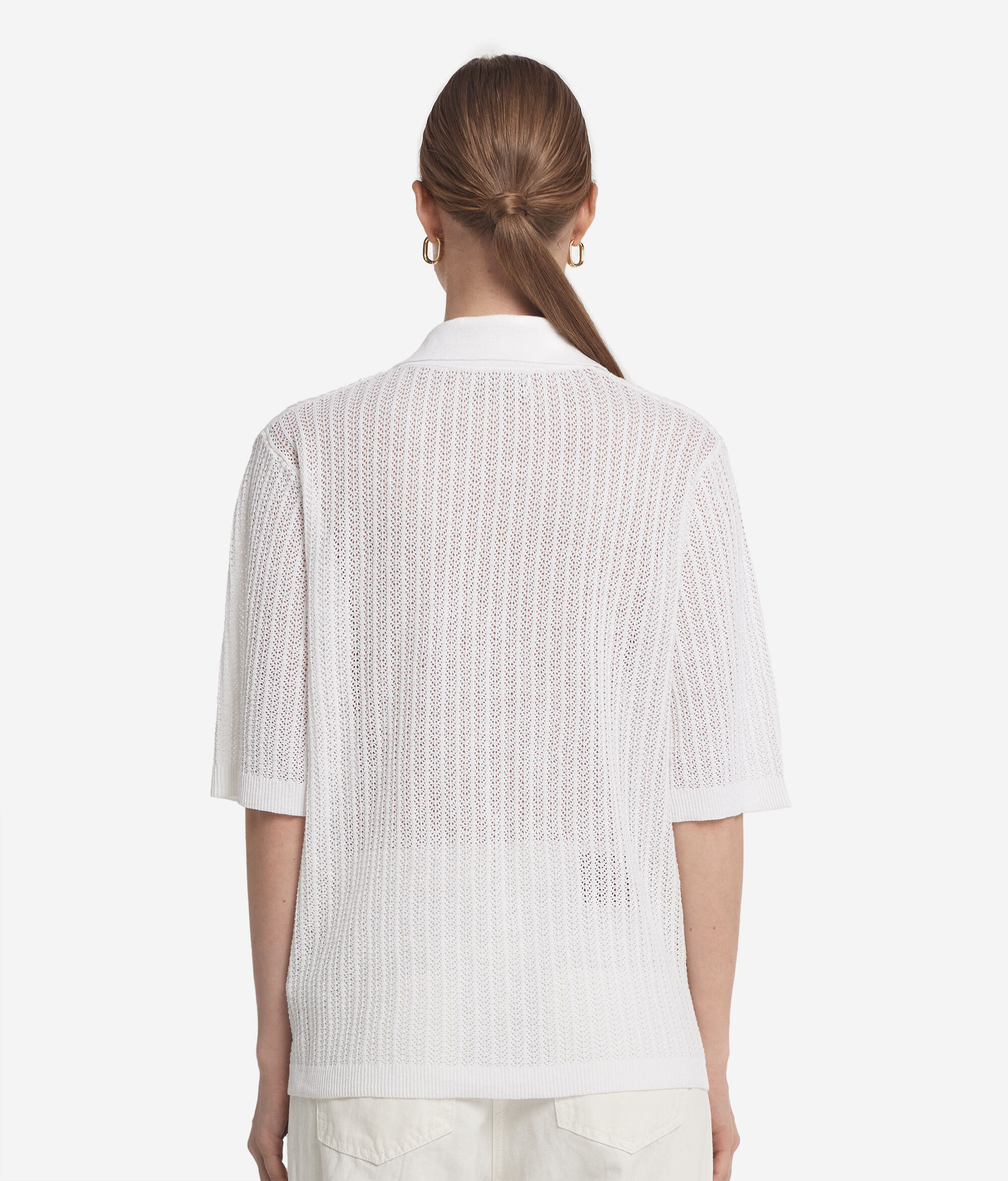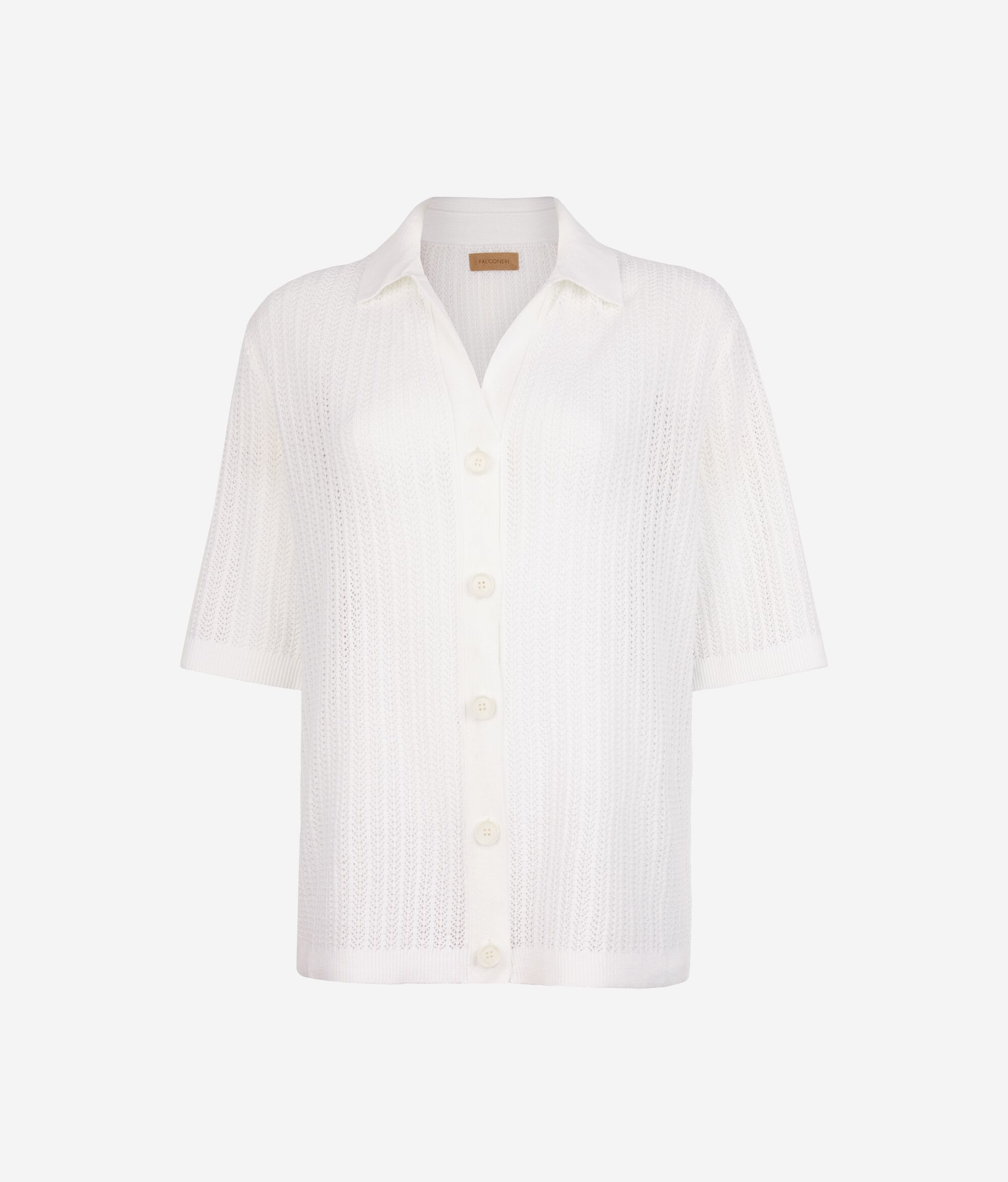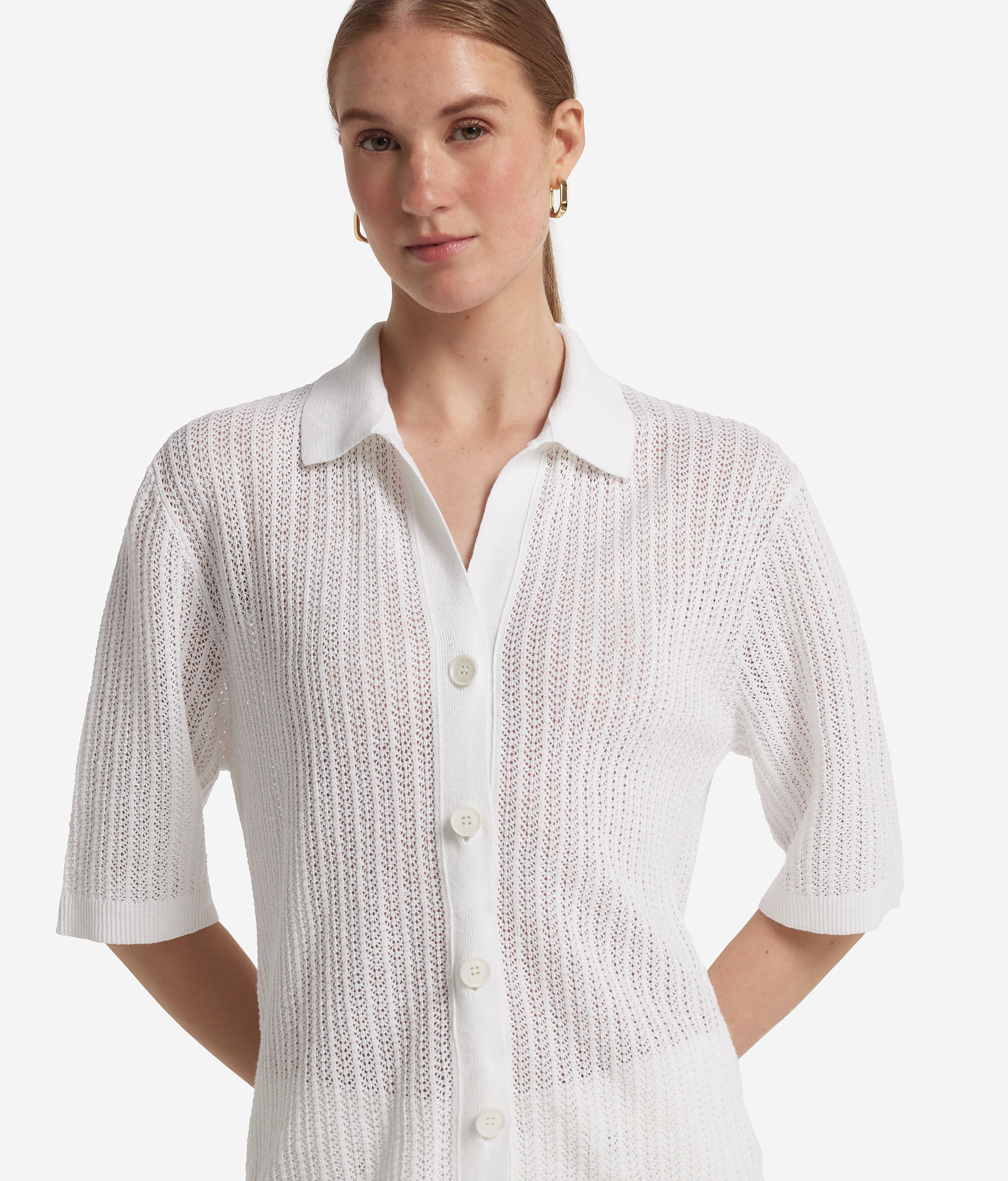 Cenne detale i delikatny splot podkreślają letniego ducha tej koszuli wykonanej z czystej bawełny. Prążkowana ażurowa faktura wzbogaca podstawową tkaninę, nadając jej lekkości i świeżości. Klasyczny kołnierzyk i lekko obniżona linia ramion dopełniają design, przywodząc na myśl swobodną elegancję, idealną na dni, które chcesz spędzić z wdziękiem i prostotą.