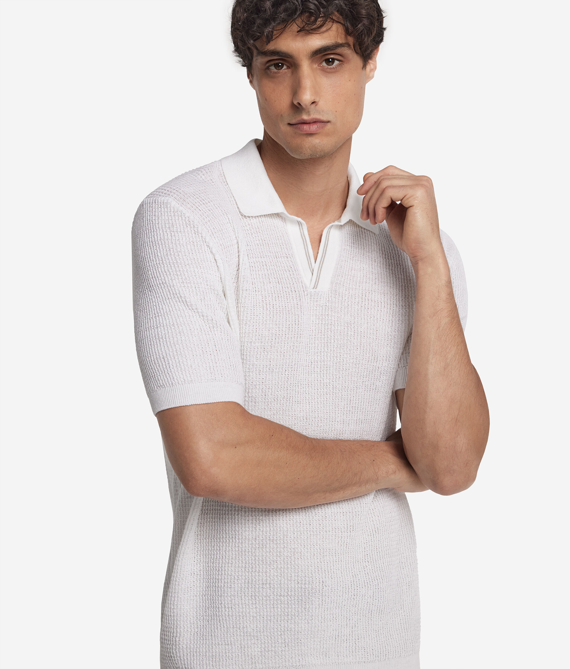 Casualowy i swobodny styl tej koszulki polo jest idealnym sprzymierzeńcem do tworzenia wyjątkowych codziennych stylizacji. Kompozycja bawełny i lnu zapewnia uczucie lekkości i świeżości, a ścieg waflowy, wzmocniony kontrastowym podwójnym paskiem, dodaje charakterystycznego akcentu. Prążkowane wykończenie kołnierzyka, rękawów i dołu to wyraz dbałości o szczegóły, który pokazuje, że każdy detal ma znaczenie.