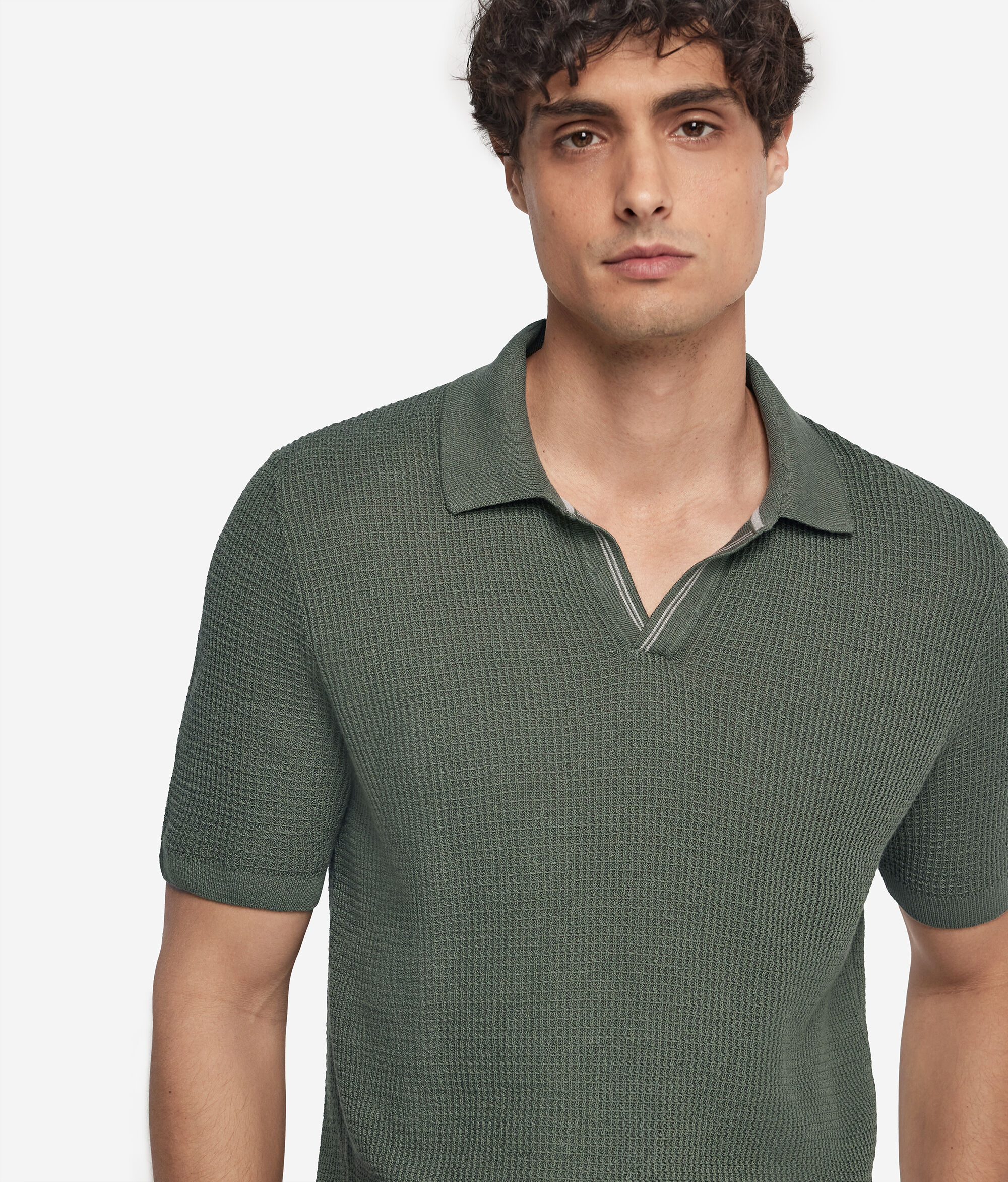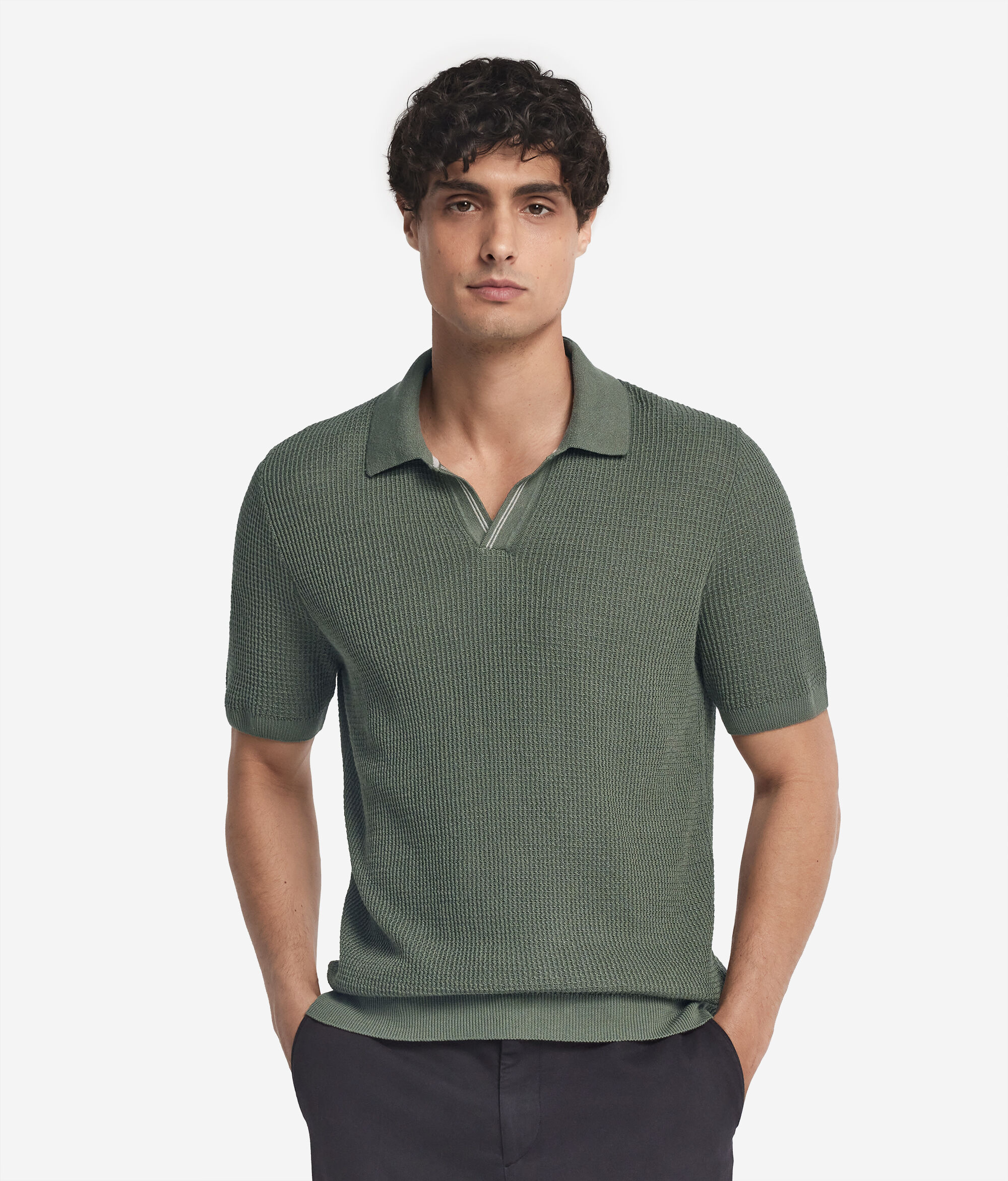 Casualowy i swobodny styl tej koszulki polo jest idealnym sprzymierzeńcem do tworzenia wyjątkowych codziennych stylizacji. Kompozycja bawełny i lnu zapewnia uczucie lekkości i świeżości, a ścieg waflowy, wzmocniony kontrastowym podwójnym paskiem, dodaje charakterystycznego akcentu. Prążkowane wykończenie kołnierzyka, rękawów i dołu to wyraz dbałości o szczegóły, który pokazuje, że każdy detal ma znaczenie.