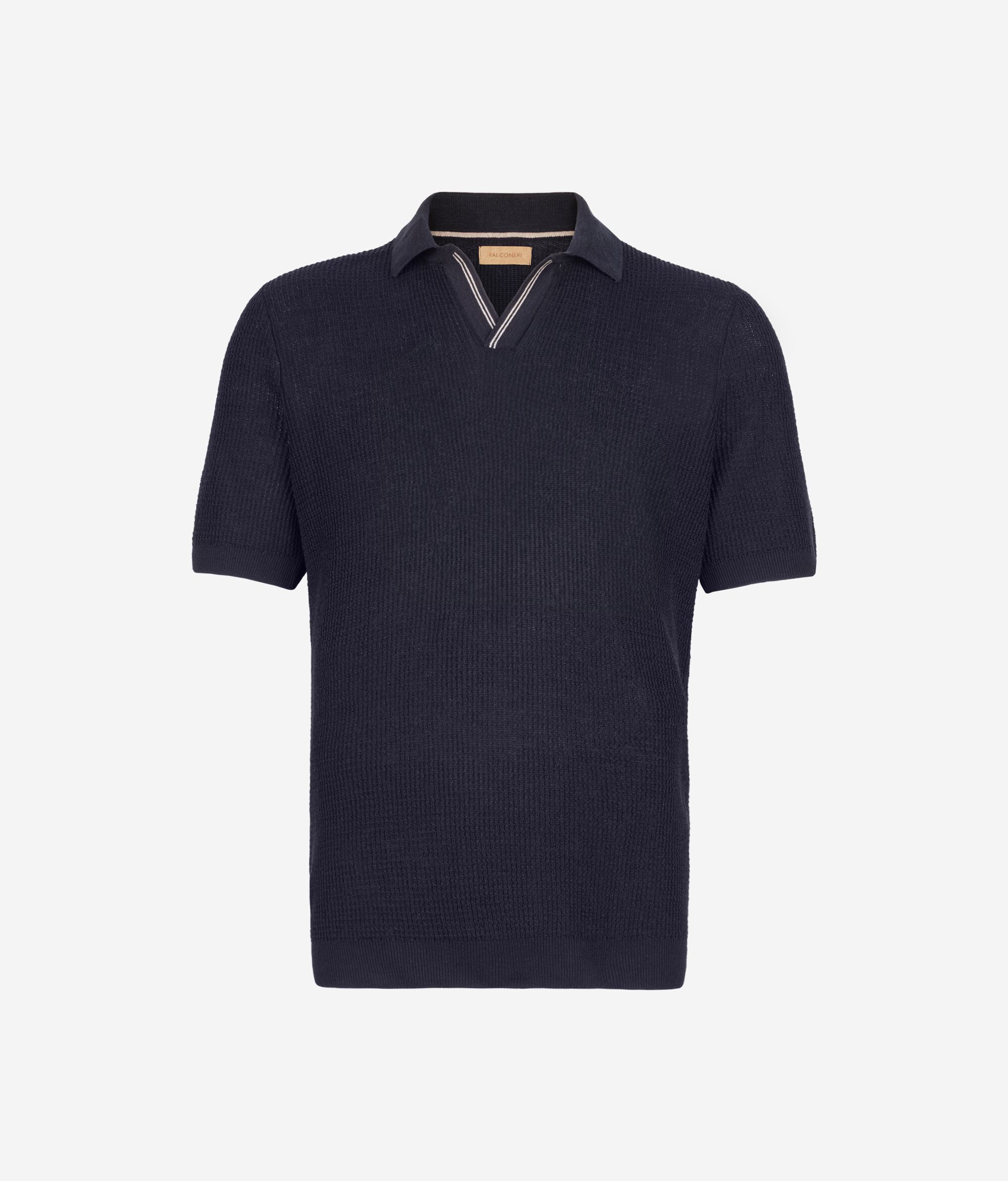 Casualowy i swobodny styl tej koszulki polo jest idealnym sprzymierzeńcem do tworzenia wyjątkowych codziennych stylizacji. Kompozycja bawełny i lnu zapewnia uczucie lekkości i świeżości, a ścieg waflowy, wzmocniony kontrastowym podwójnym paskiem, dodaje charakterystycznego akcentu. Prążkowane wykończenie kołnierzyka, rękawów i dołu to wyraz dbałości o szczegóły, który pokazuje, że każdy detal ma znaczenie.