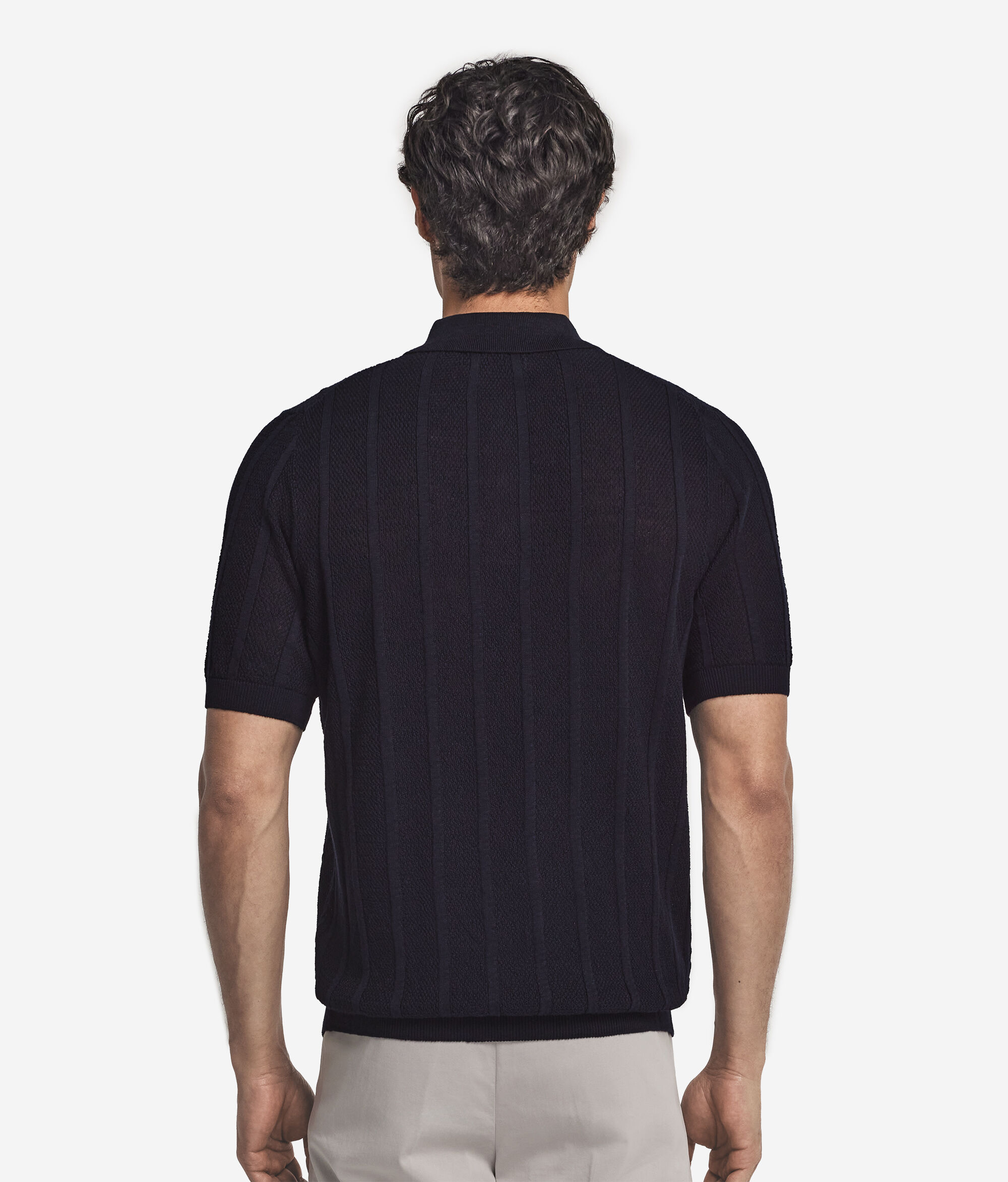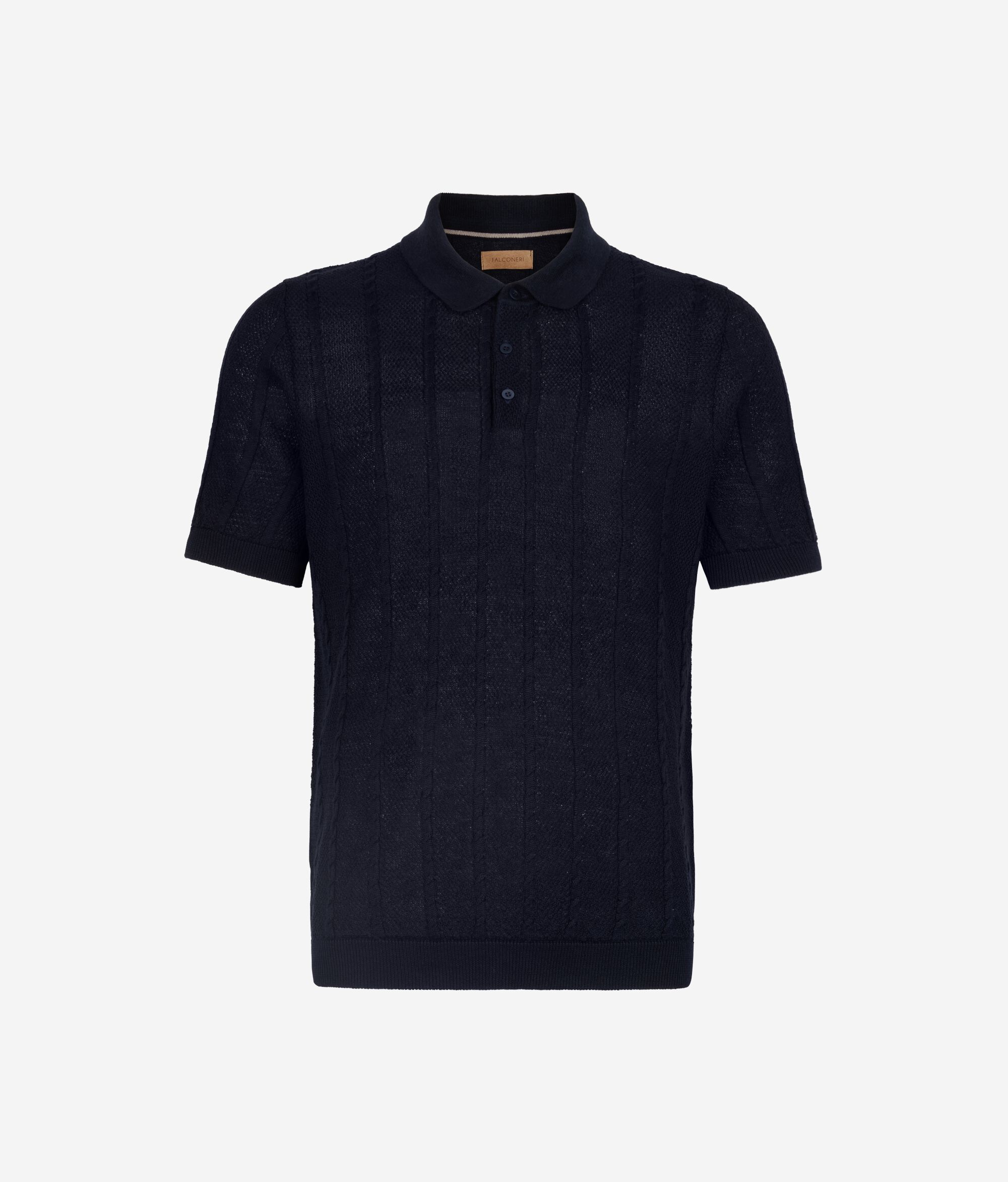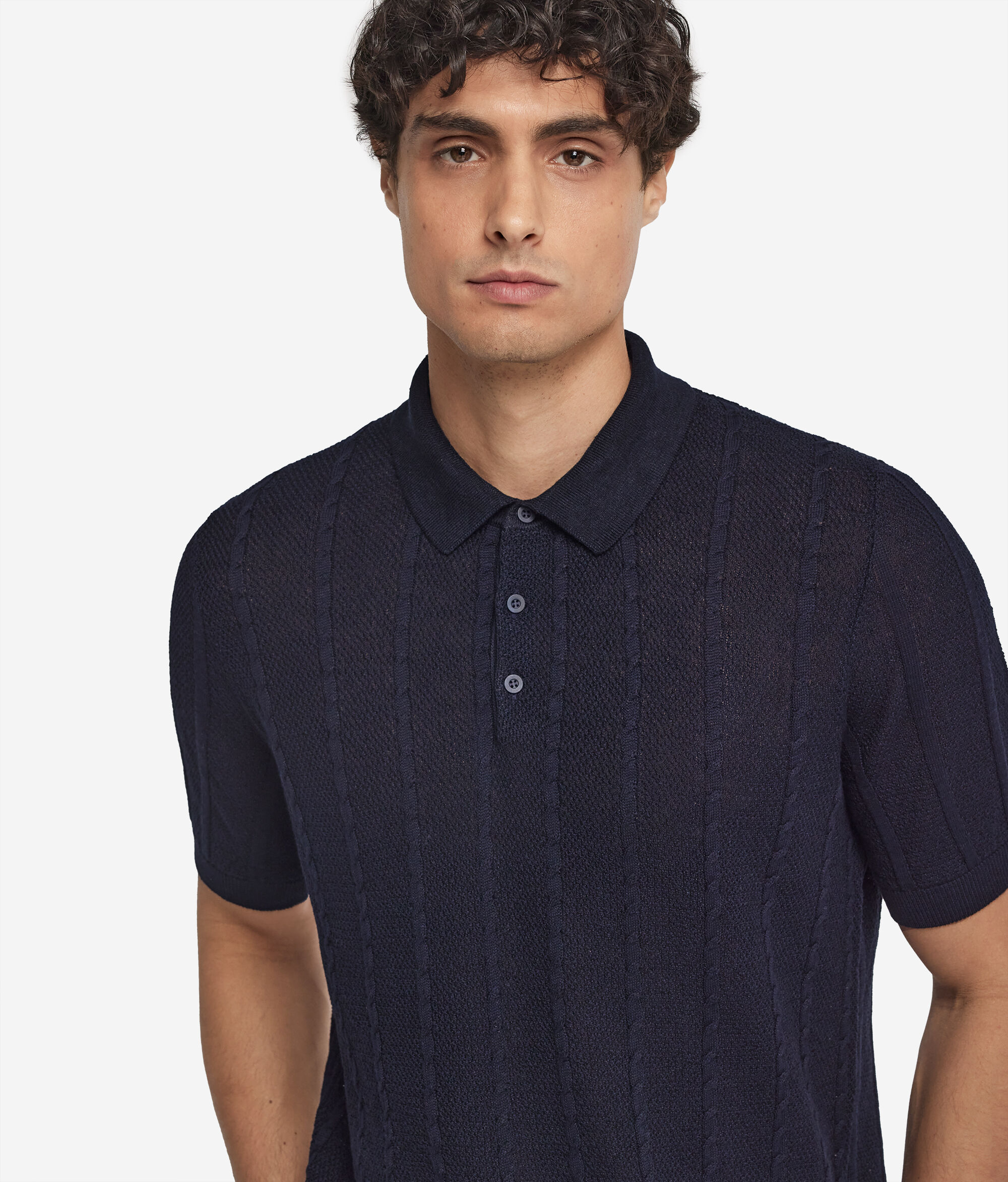 Aby uzyskać wyjątkowy i wyrafinowany look, koszulka polo z mieszanki bawełny i lnu jest niezbędnym elementem w stylu casual chic. Jej oryginalność tkwi w charakterystycznych detalach, takich jak ścieg supełkowy przeplatany pionowymi warkoczami. Model uzupełnia zapięcie na trzy guziki i regularny krój, czyli elementy, które sprawiają, że jest praktyczny i dostosowuje się do każdej sytuacji.