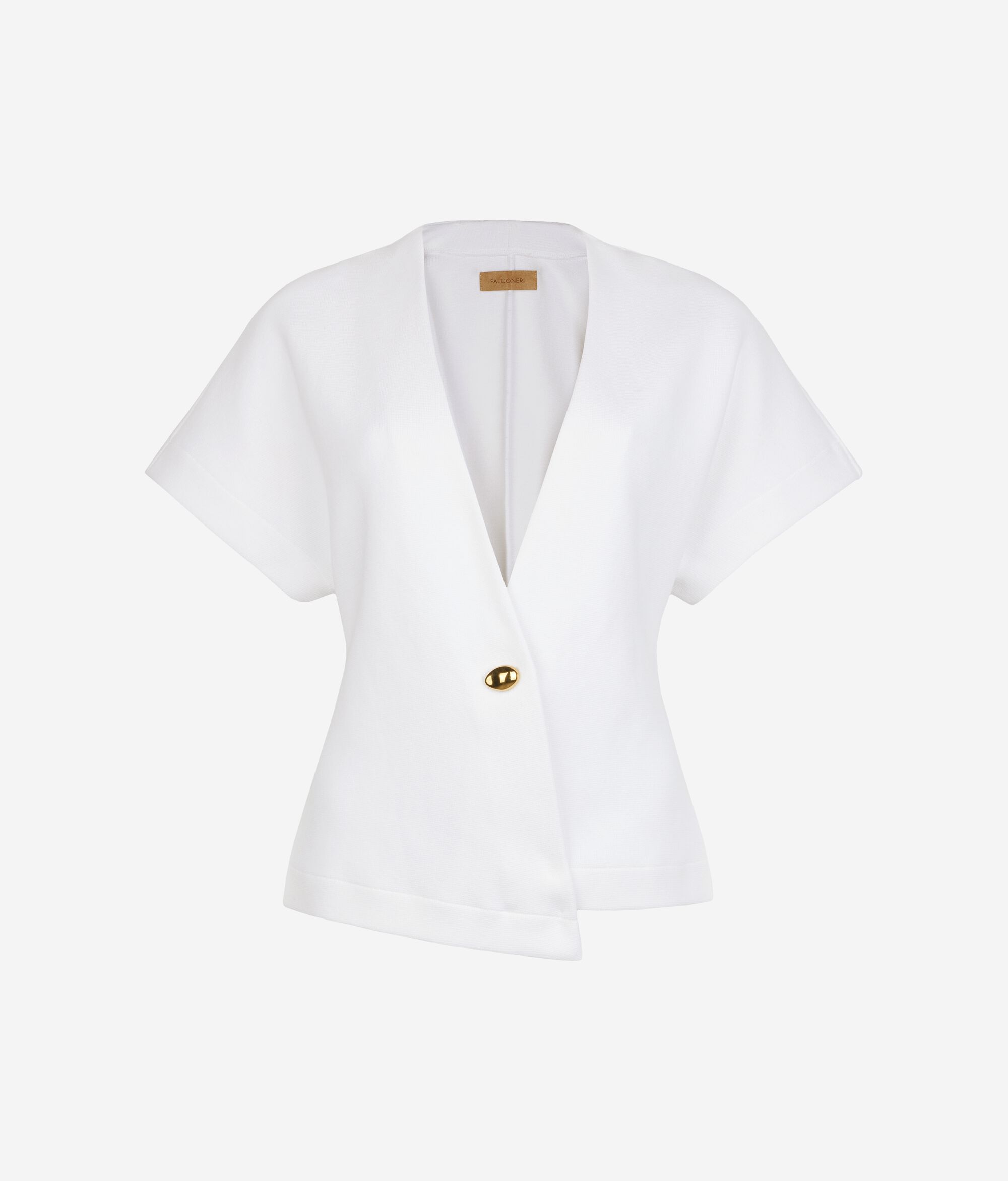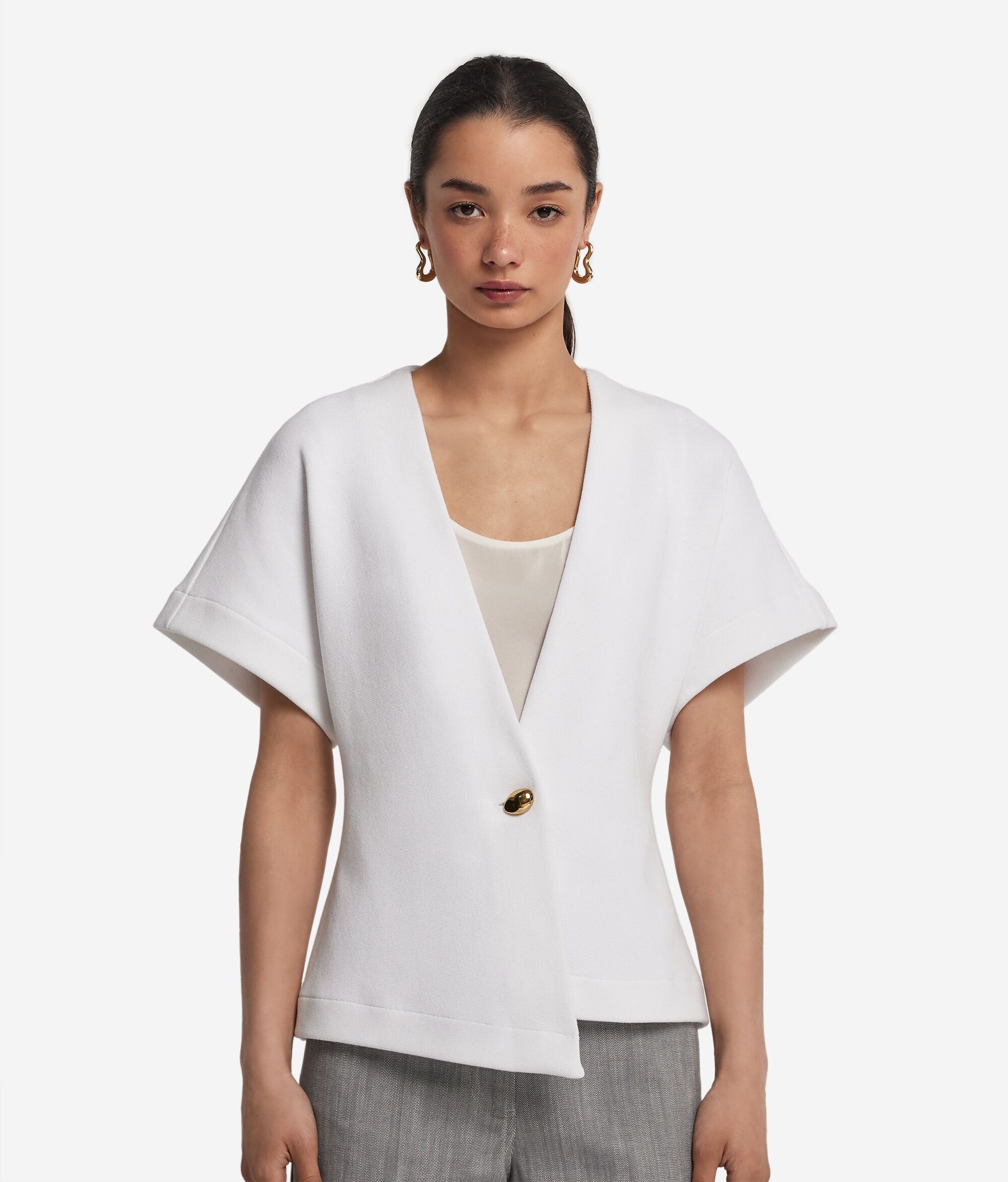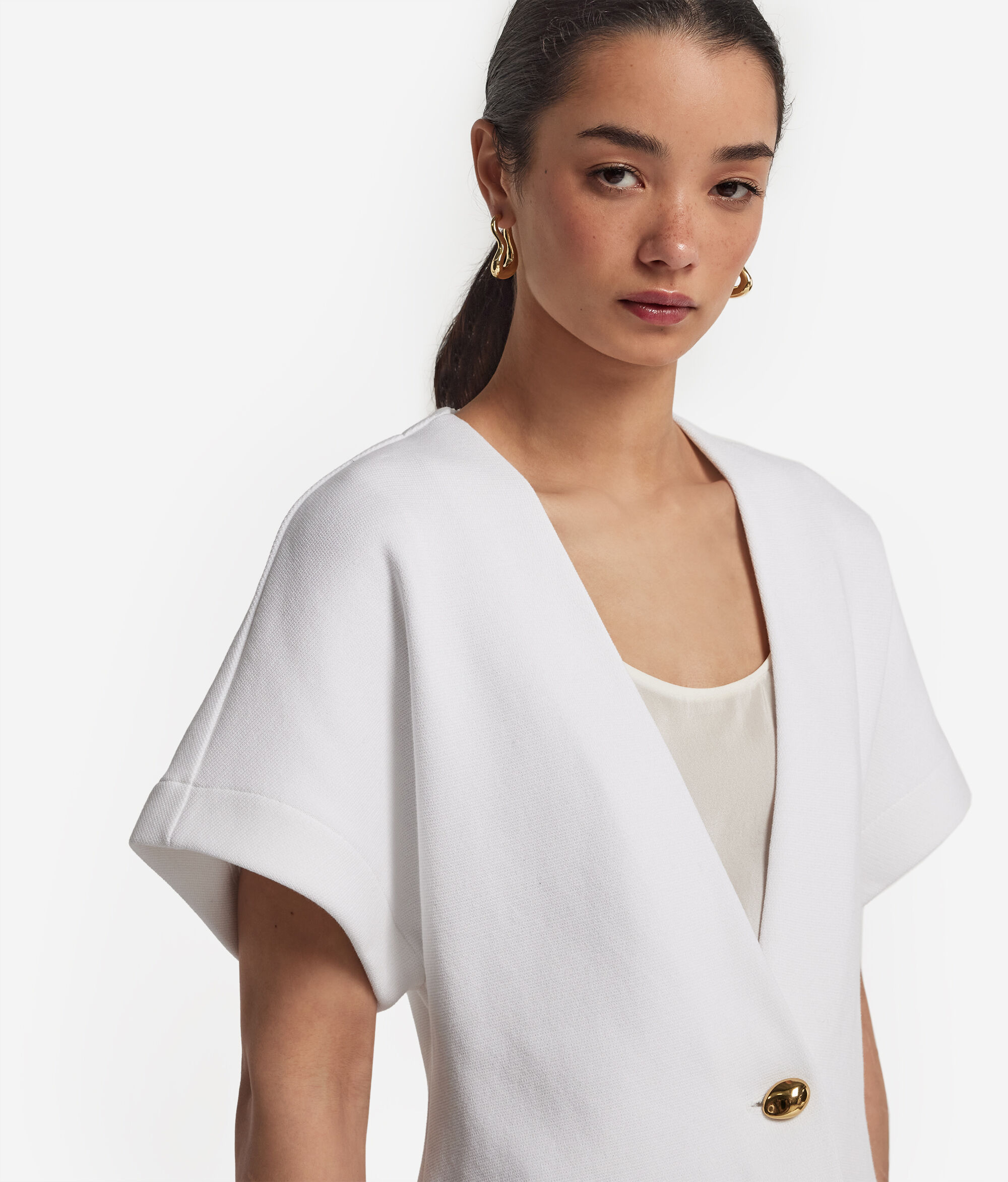 Rzemieślnicza jakość i nowoczesne linie wyróżniają styl tej bawełnianej kurtki. Charakterystyczne krótkie rękawy kimono dodają jej lekkości i nowoczesności. Posiada asymetryczne zapięcie z przodu ozdobione biżuteryjnym guzikiem. Głęboki dekolt w kształcie litery V podkreśla sylwetkę, a zapięcie na guzik zapewnia regularne dopasowanie, dzięki czemu doskonale sprawdzi się zarówno w codziennych, jak i eleganckich stylizacjach.
