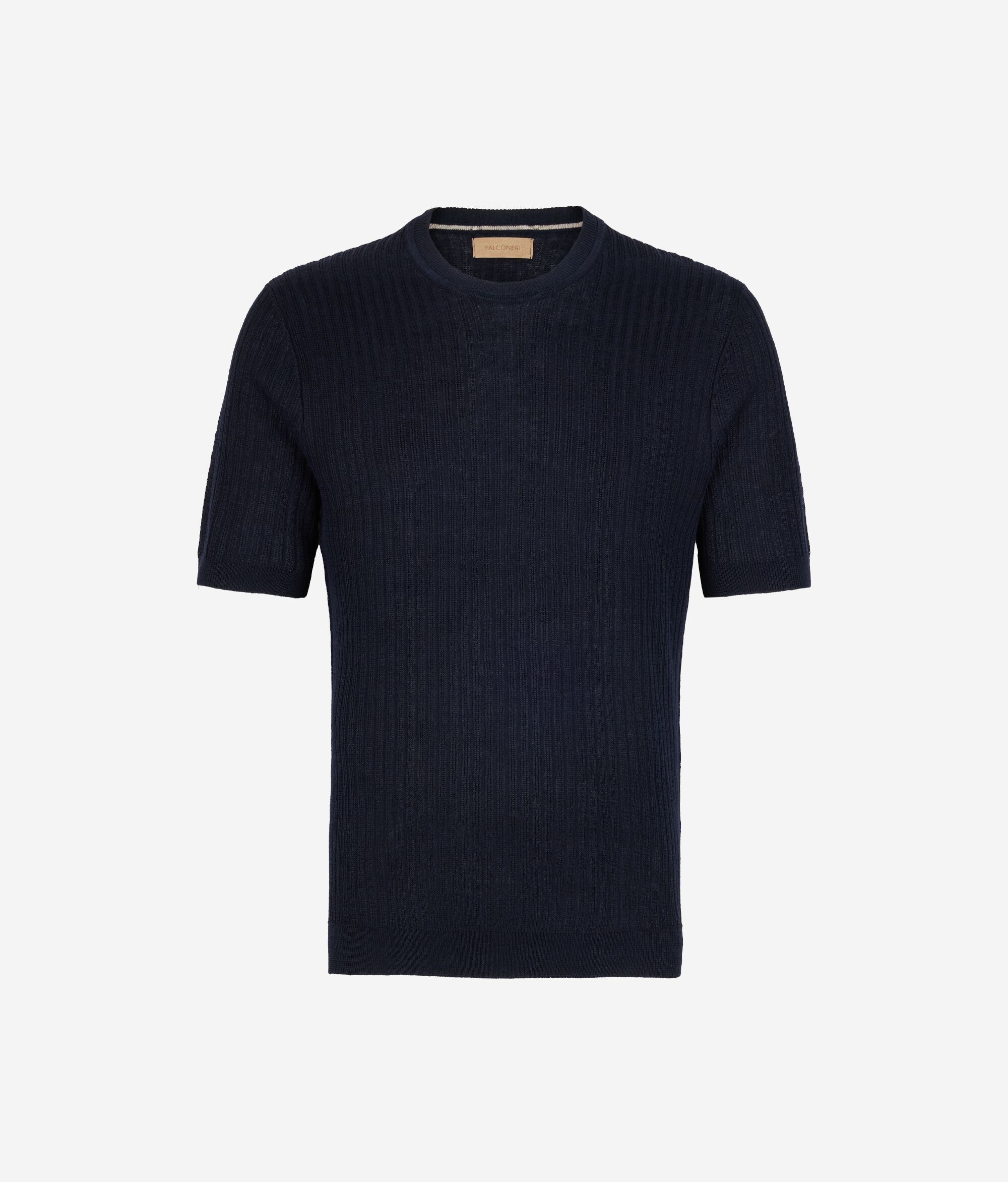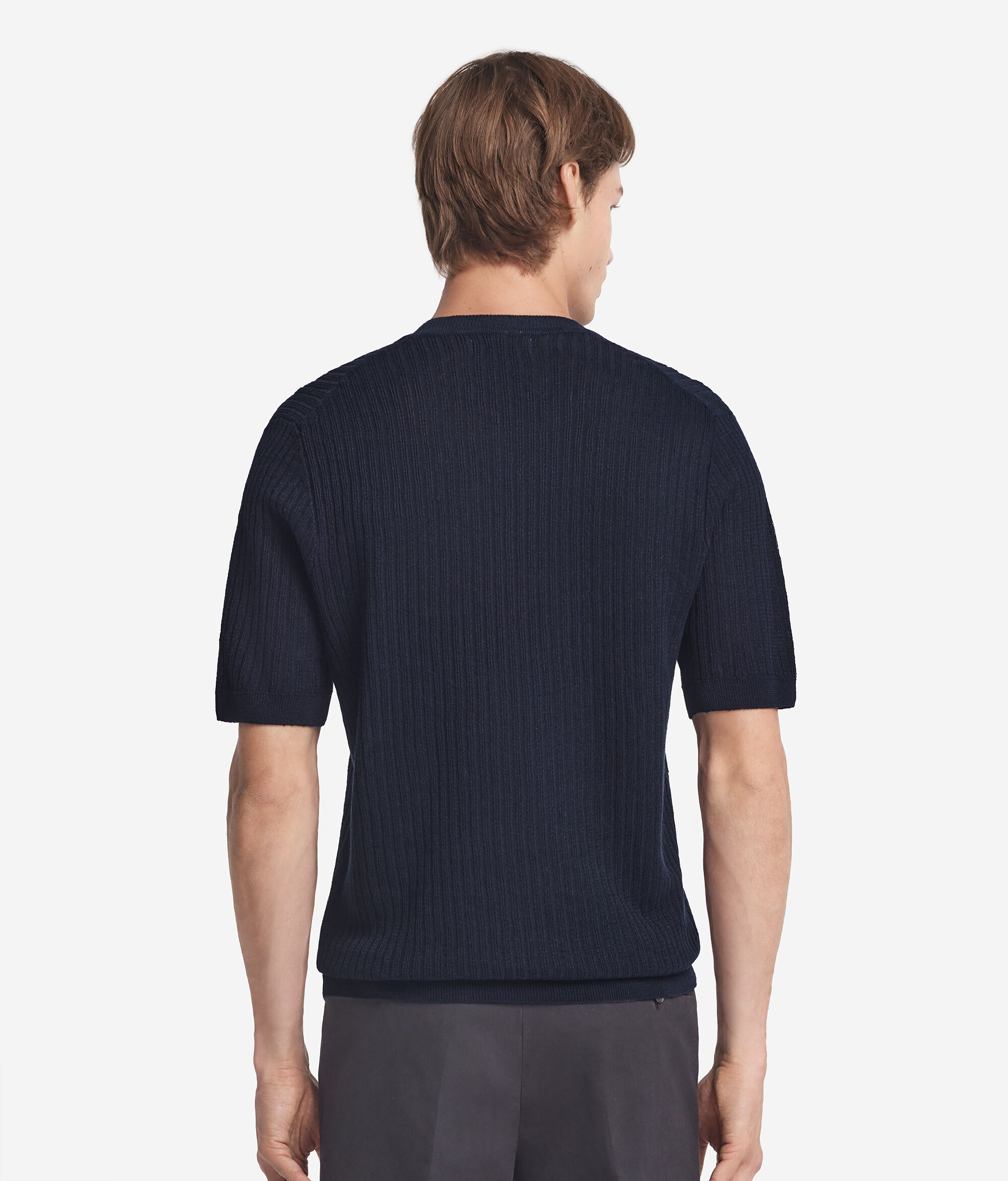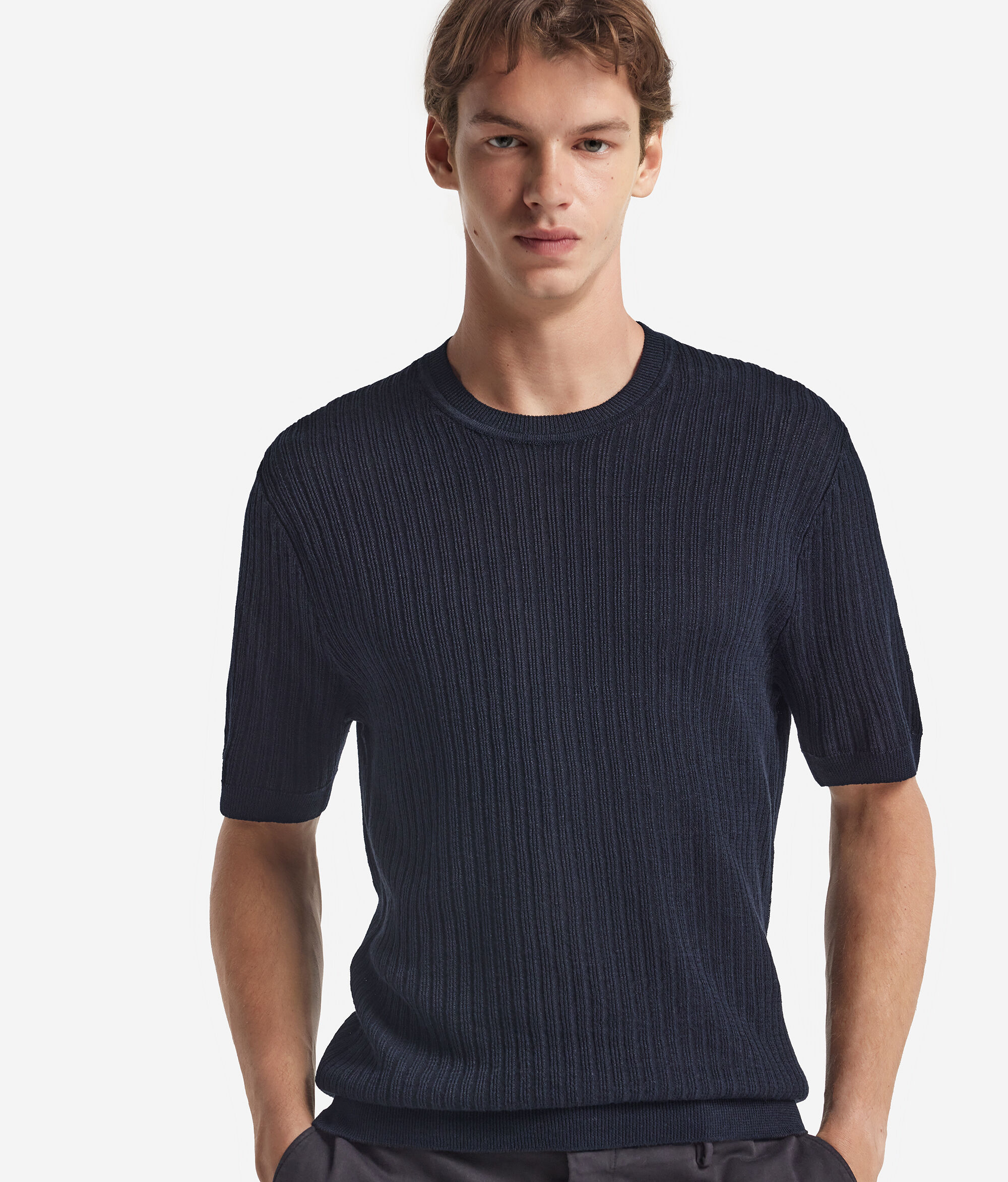 Wyrafinowana faktura w pionowe prążki dodaje charakteru temu t-shirtowi z dzianiny lniano-bawełnianej. Lekki i przewiewny, ma regularny krój, który stylowo dopasowuje się do każdej okazji i doskonale nadaje się zarówno do codziennych stylizacji, jak i bardziej eleganckich zestawień.