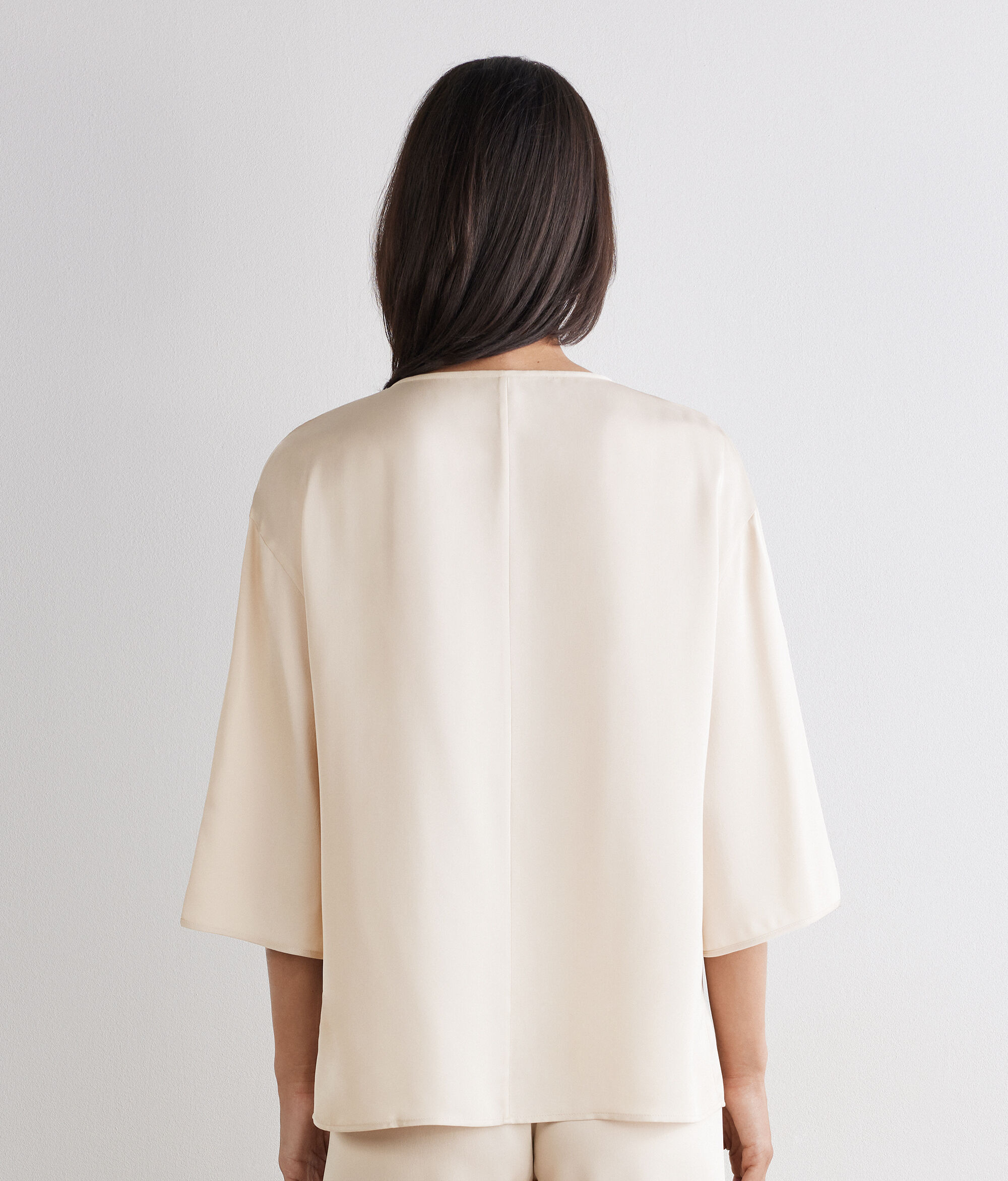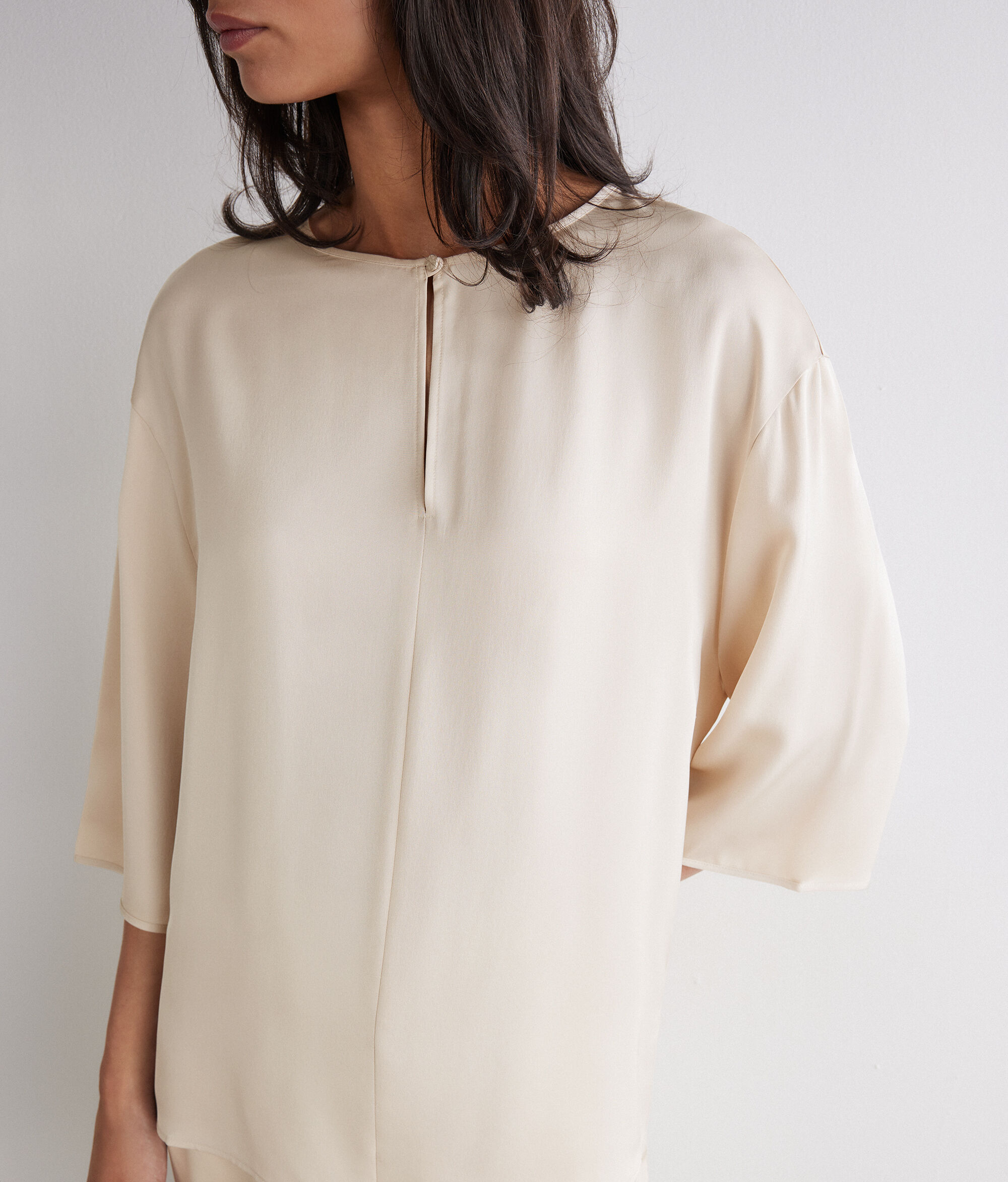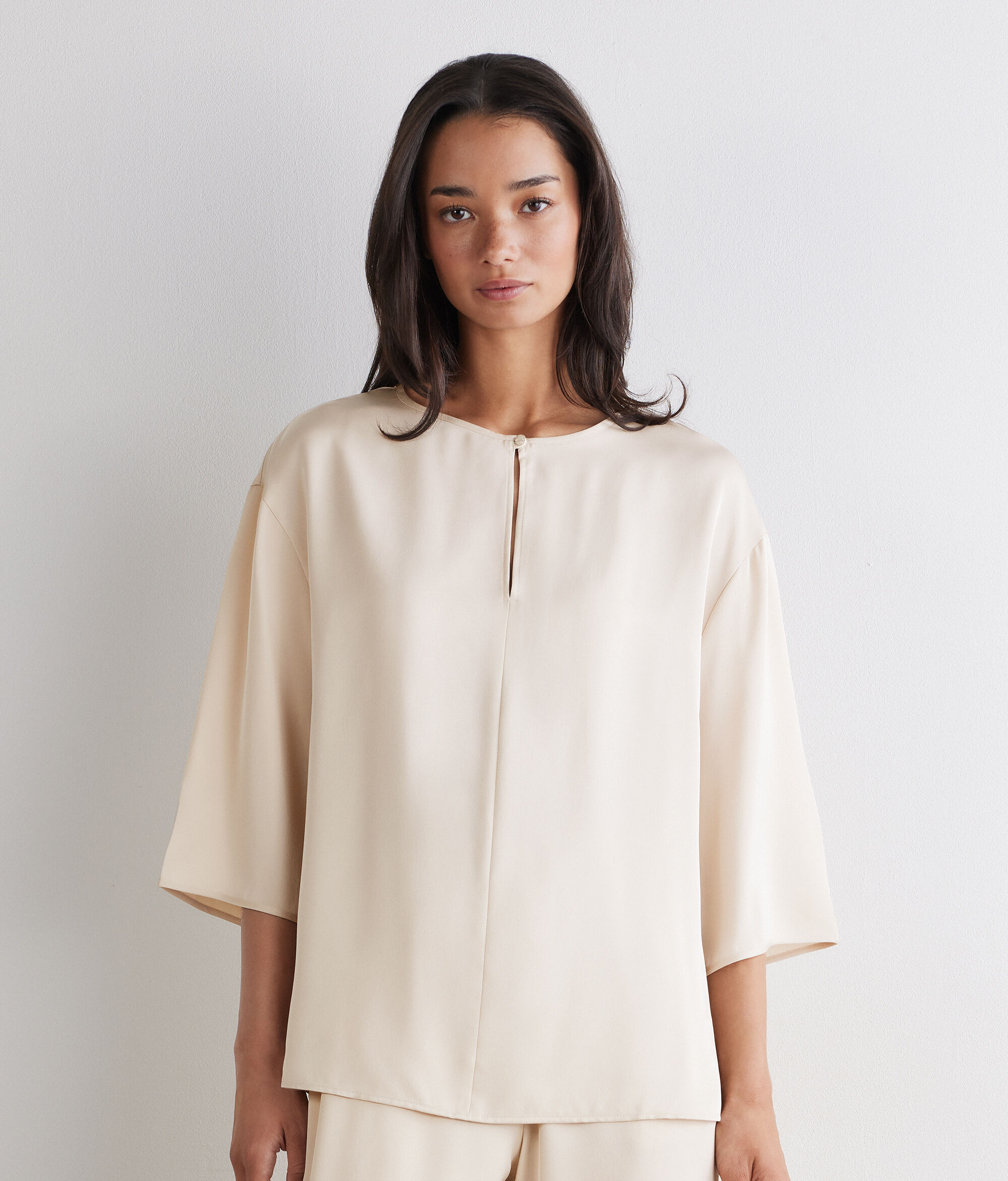 Confecionada em cetim de seda opaco, esta blusa combina feminilidade e leveza num design intemporal. O decote redondo com abertura em gota e botão metálico na frente adiciona um detalhe elegante, enquanto o corte folgado garante uma linha fluída e natural.