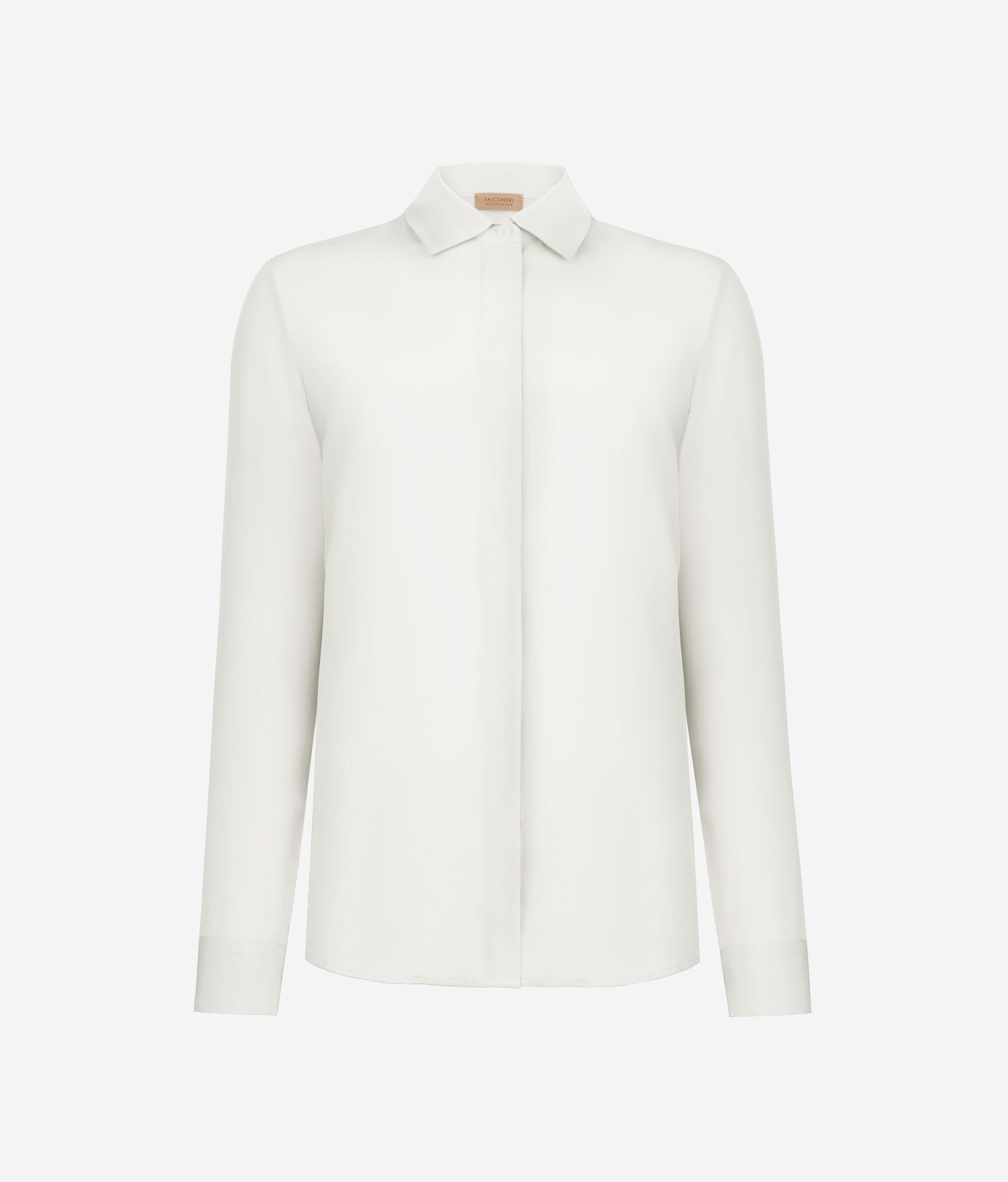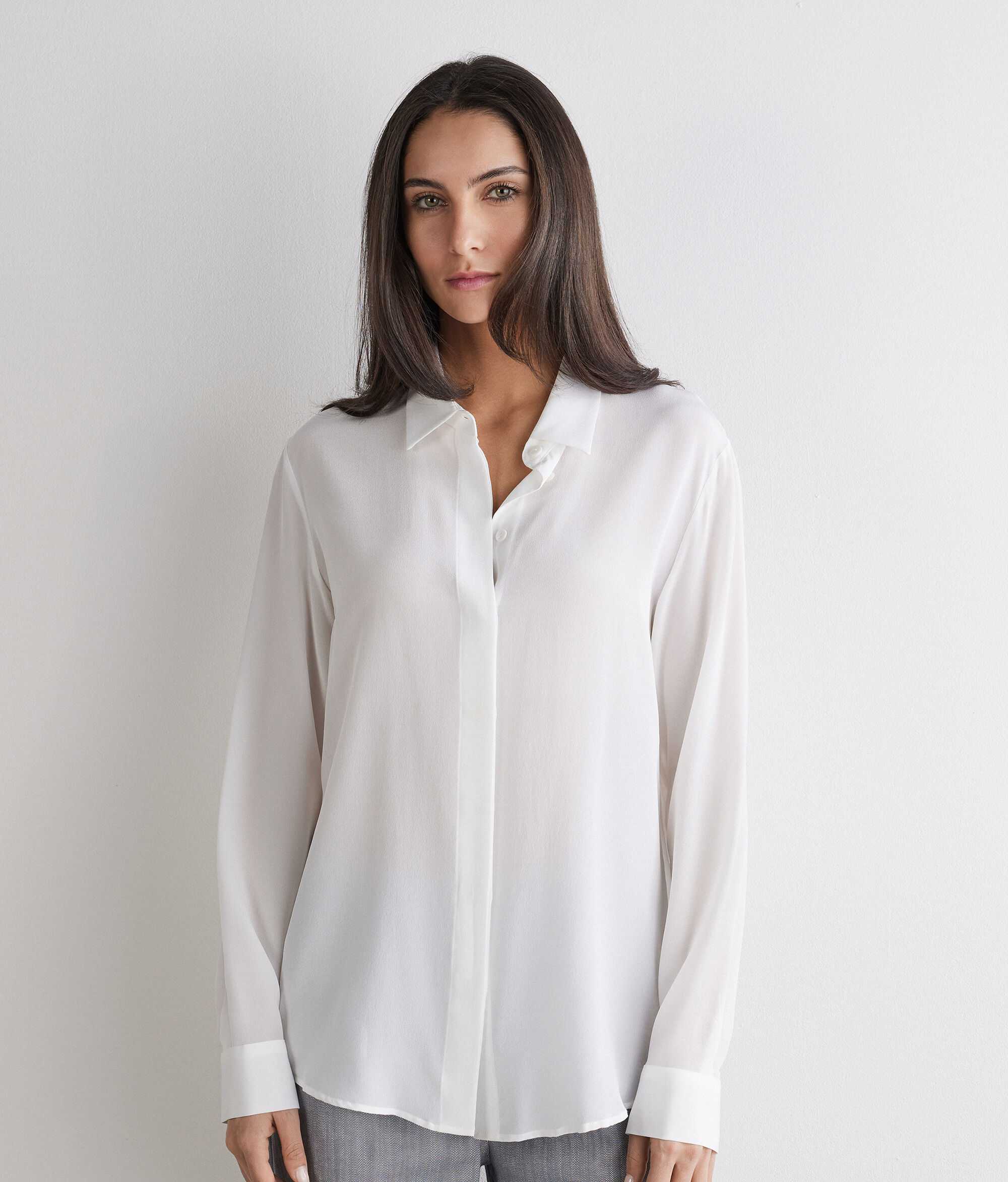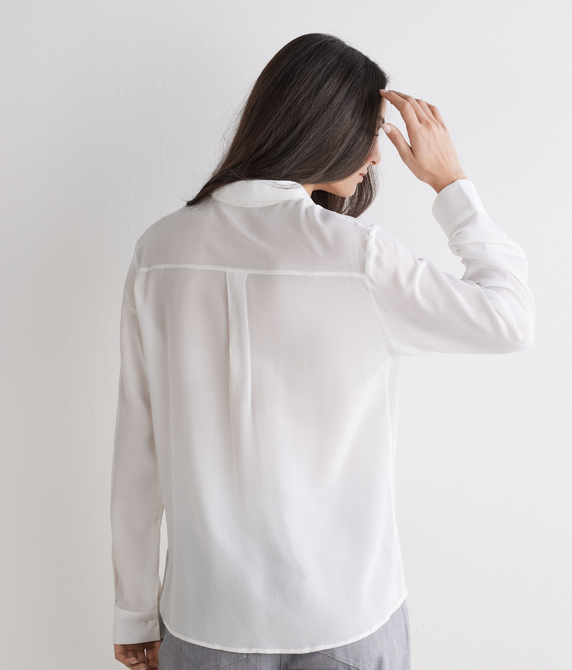 Descubra a elegância intemporal desta camisa de crepe de chine. O design, de linhas simples e depuradas, é enriquecido por um colarinho clássico e fecho com botões. Comedida, mas distintamente elegante, não poderá faltar no guarda-roupa de quem aprecia qualidade e estilo.