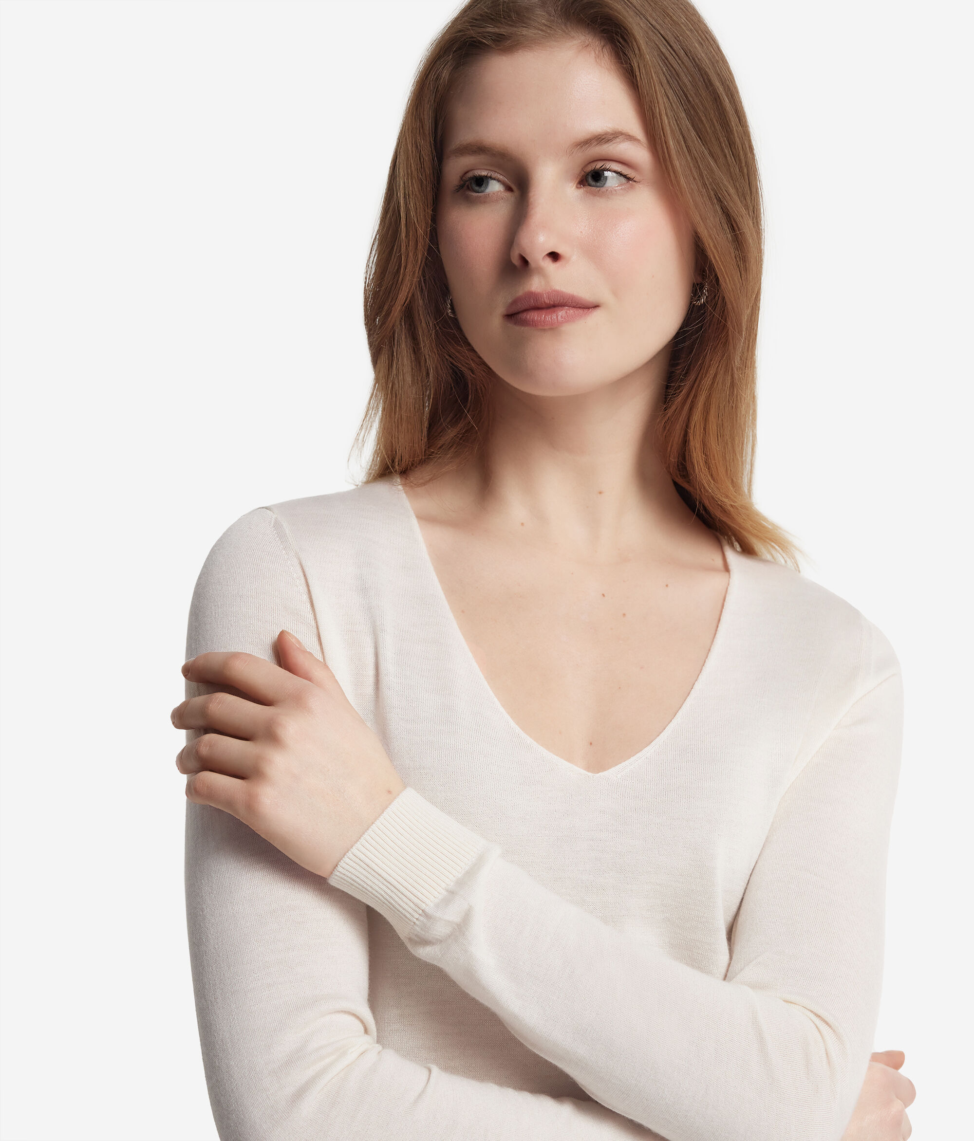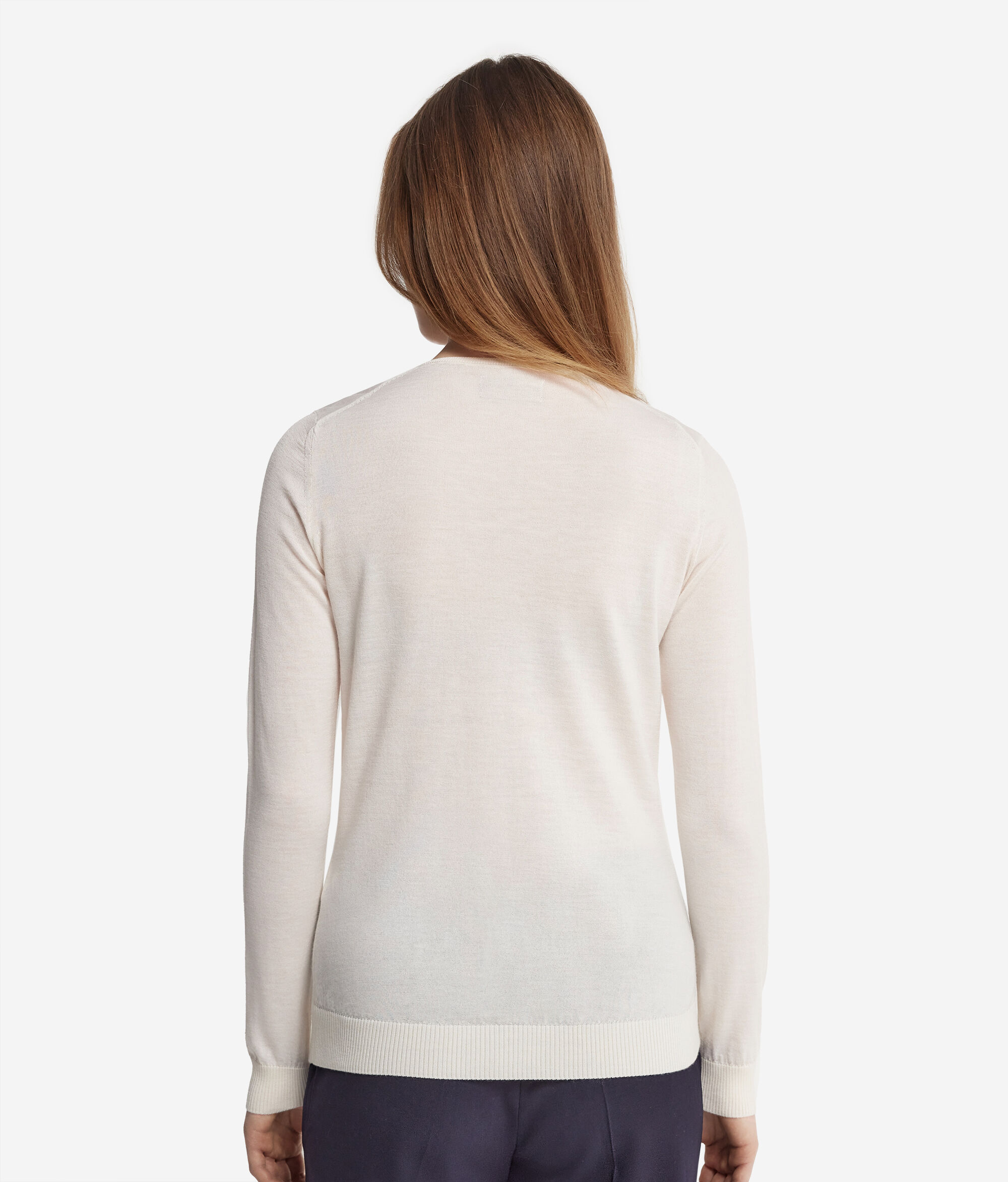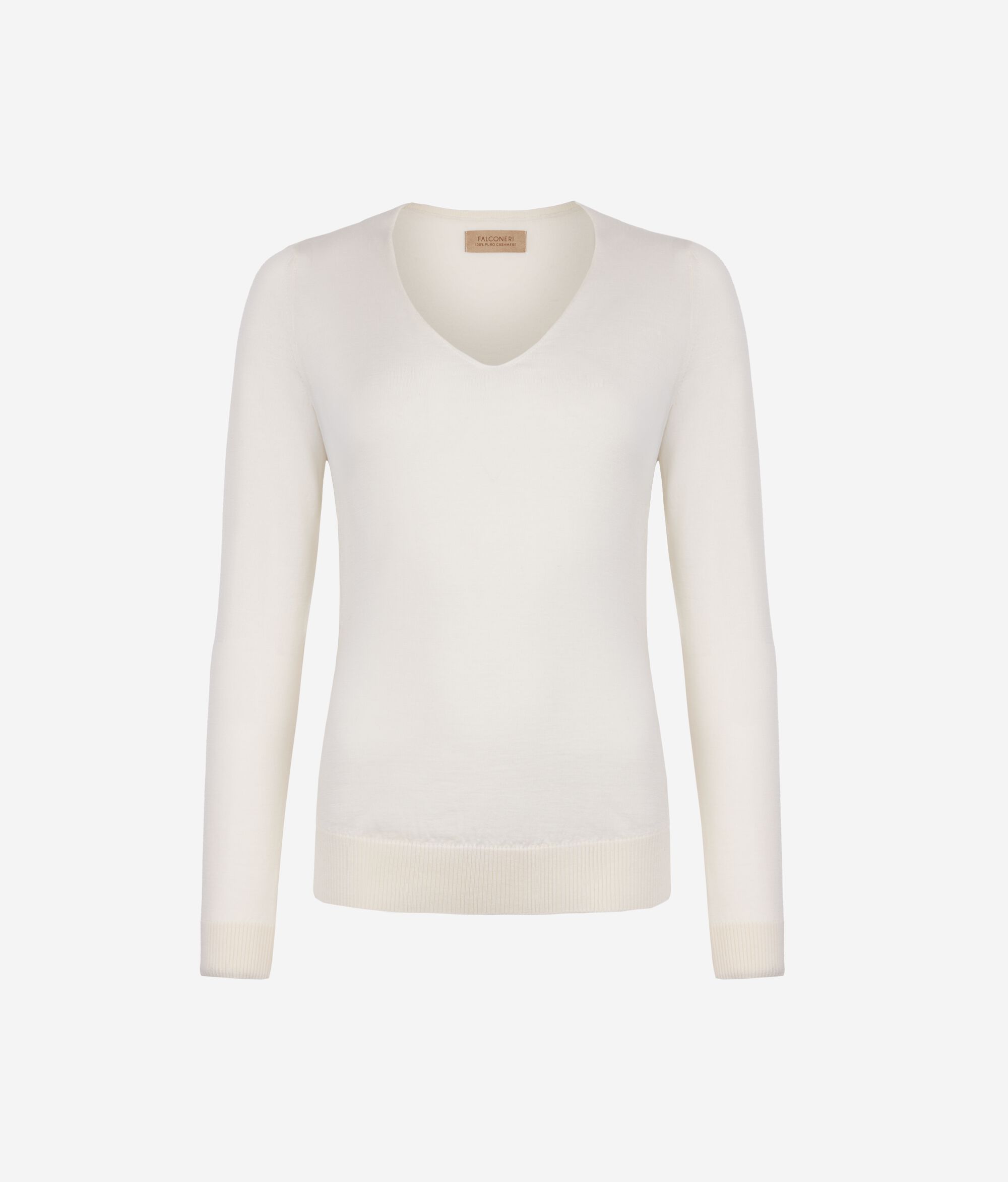 A camisola em caxemira ultrafine com decote em V é um modelo de mangas compridas e ombros levemente descaídos. Apresenta um acabamento com padrão canelado no decote, no cós e nos punhos. O corte e os ombros são regulares. As variantes da peça com cores tingidas foram submetidas a um processo de tingimento artesanal.