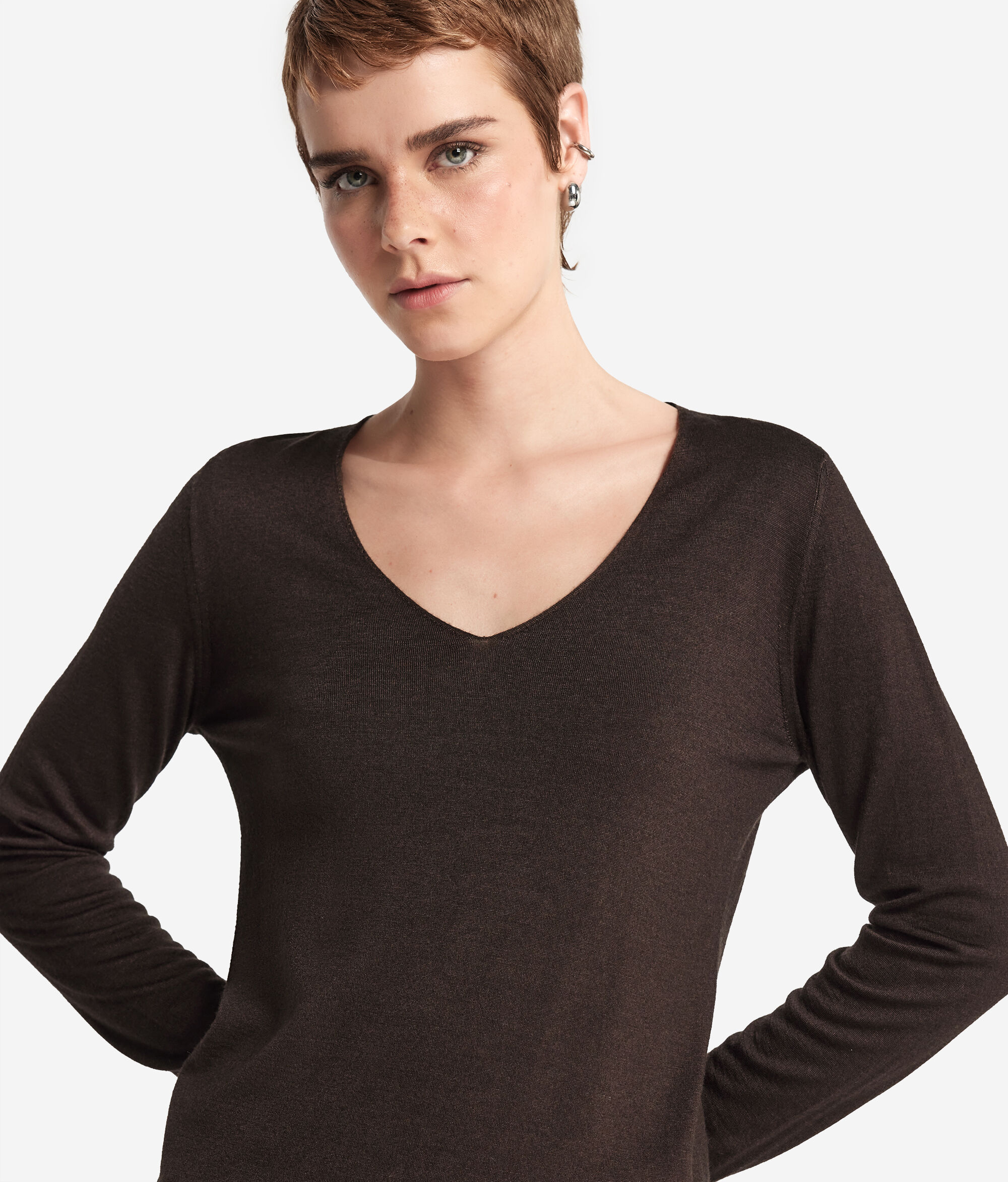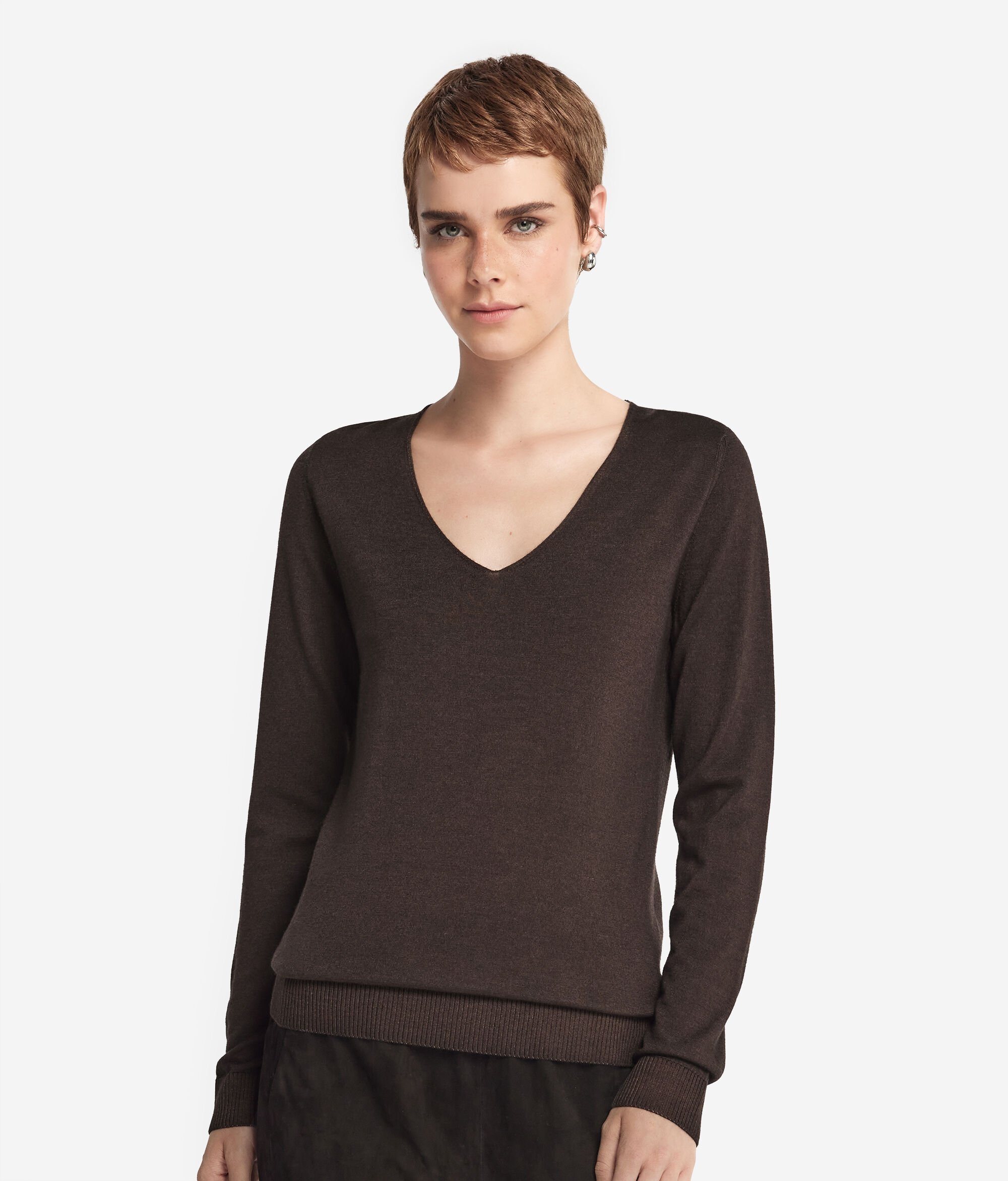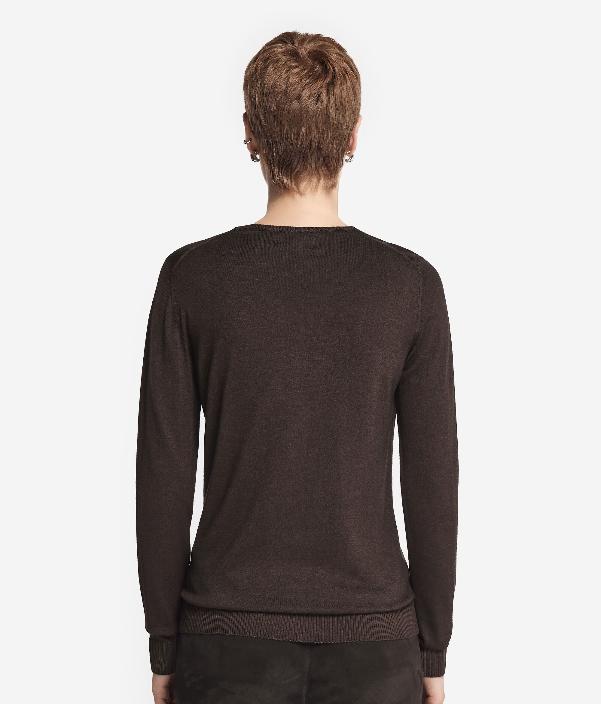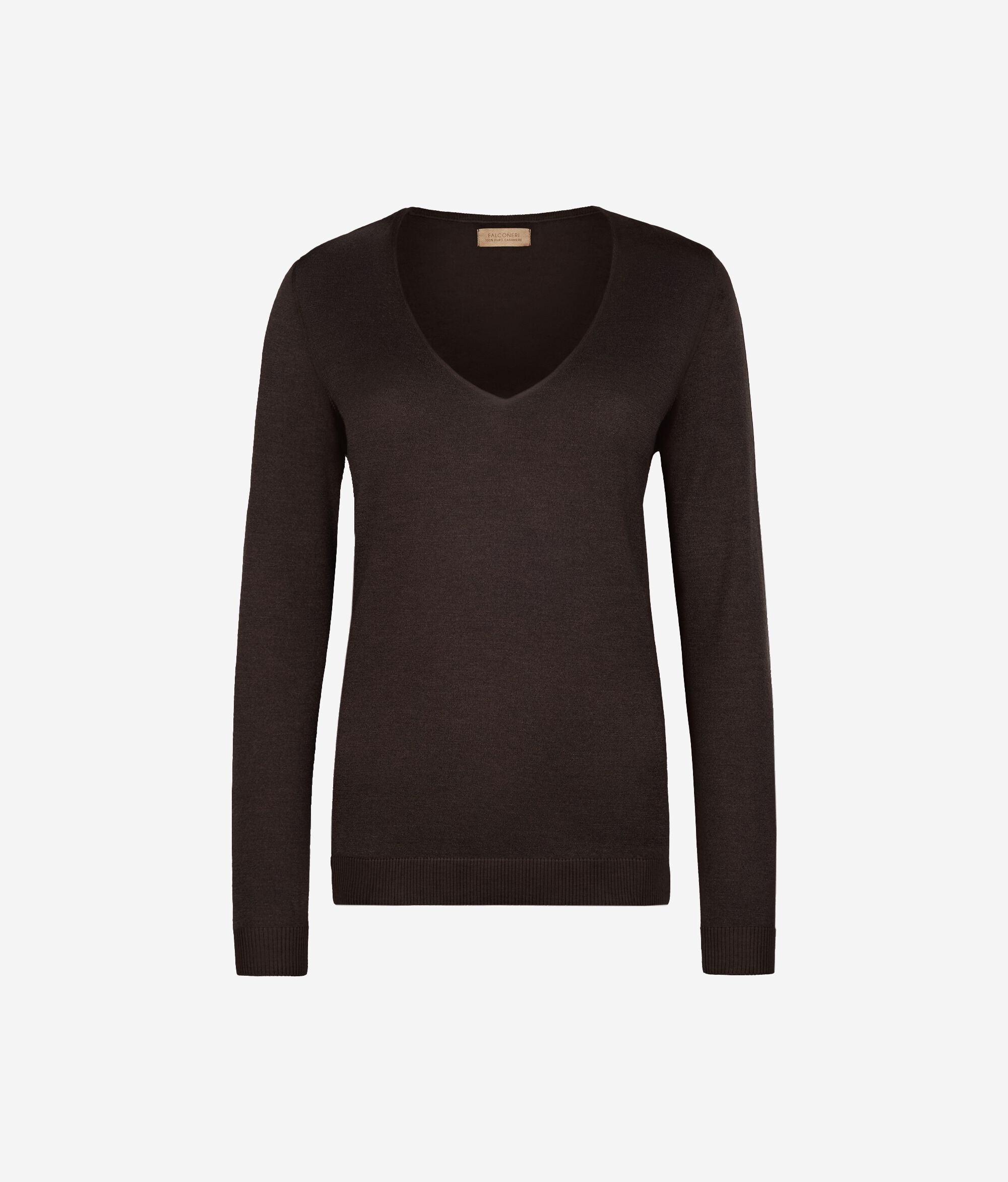 A camisola em caxemira ultrafine com decote em V é um modelo de mangas compridas e ombros levemente descaídos. Apresenta um acabamento com padrão canelado no decote, no cós e nos punhos. O corte e os ombros são regulares. As variantes da peça com cores tingidas foram submetidas a um processo de tingimento artesanal.